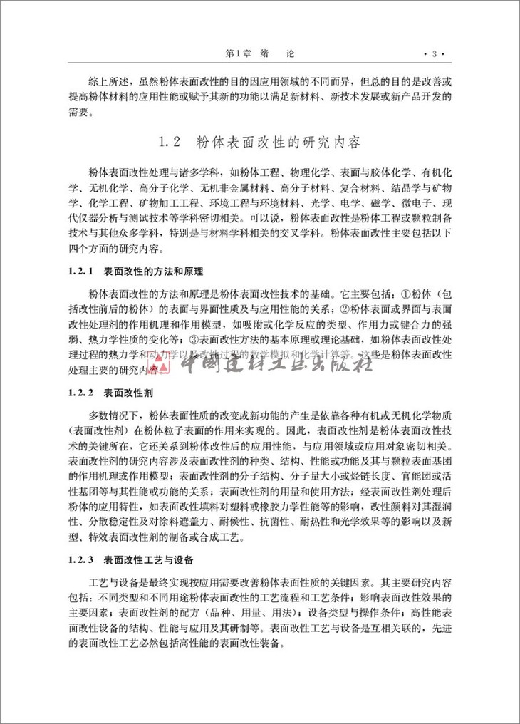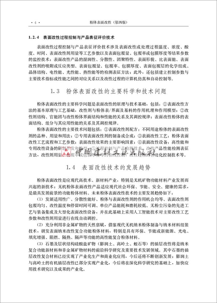 基于上述背景,新版《粉体表面改性》从结构和内容上对《粉体表面改性》(第三版)进行了如下修订:①将原第2章“粉体的表面物理化学性质”,改为“粉体表面改性方法与原理”,同时将第3章改为“表面改性工艺”。②对原第2章粉体表面改性方法进行了较大修订,将改性方法和原理融合,突出表面改性方法的科学原理。③将表面改性工艺单独成章,同时将表面改性主要工艺因素对改性效果的影响规律与改性工艺融合,突出不同表面改性工艺的技术基础和优化技术。④在“表面改性剂”一章中,增加了插层改性剂;在“表面改性设备”一章中增加了新型多功能改性设备。⑤第7~9章,增补了第三版出版以来的表面改性方法、工艺和改性粉体材料,特别是无机表面改性和插层改性以及复合改性研究的新进展和新成果。修订的目的是使《粉体表面改性》(第四版)更科学、严谨和实用,内容更新,能更好地满足广大读者的需要。
