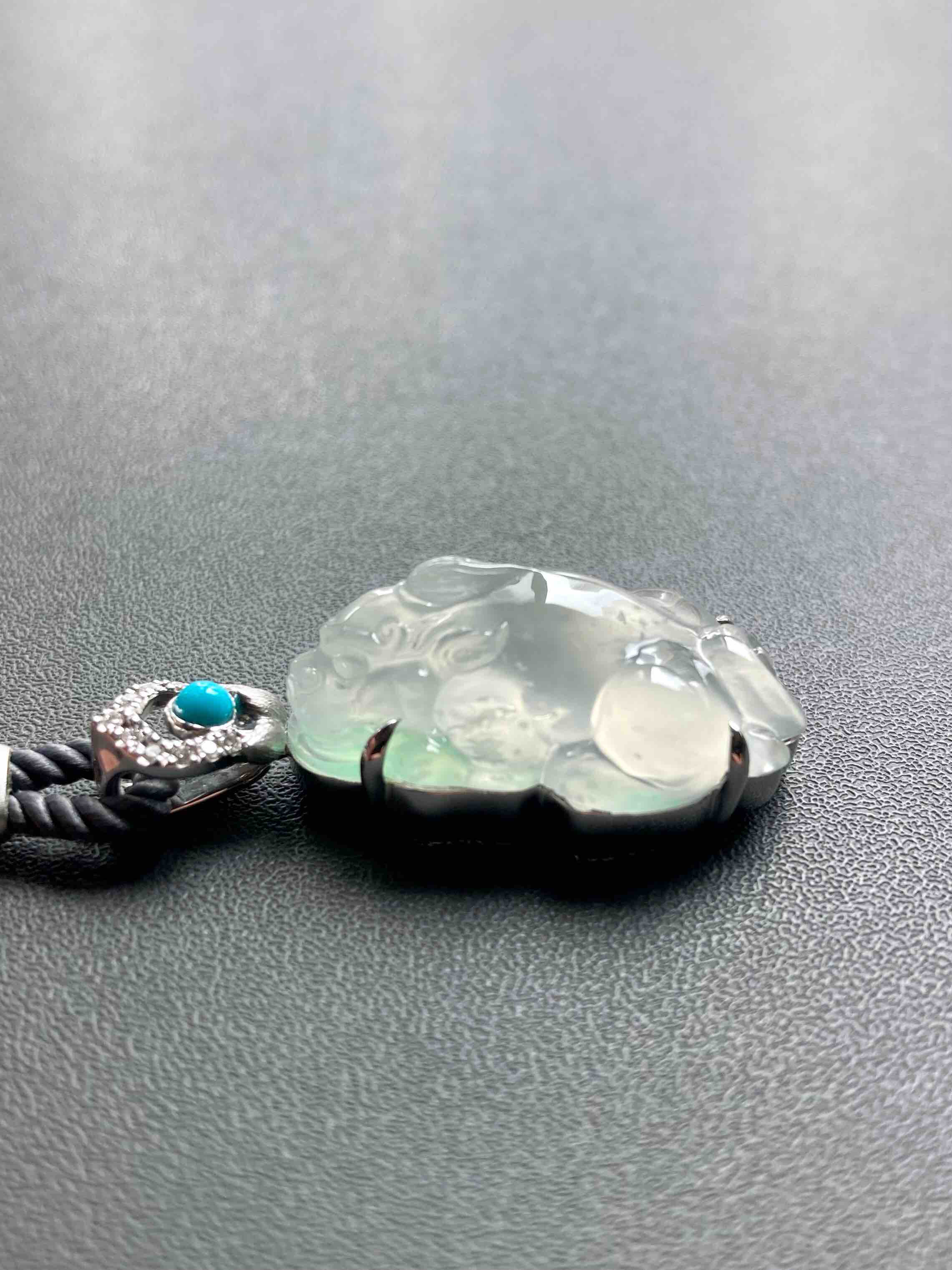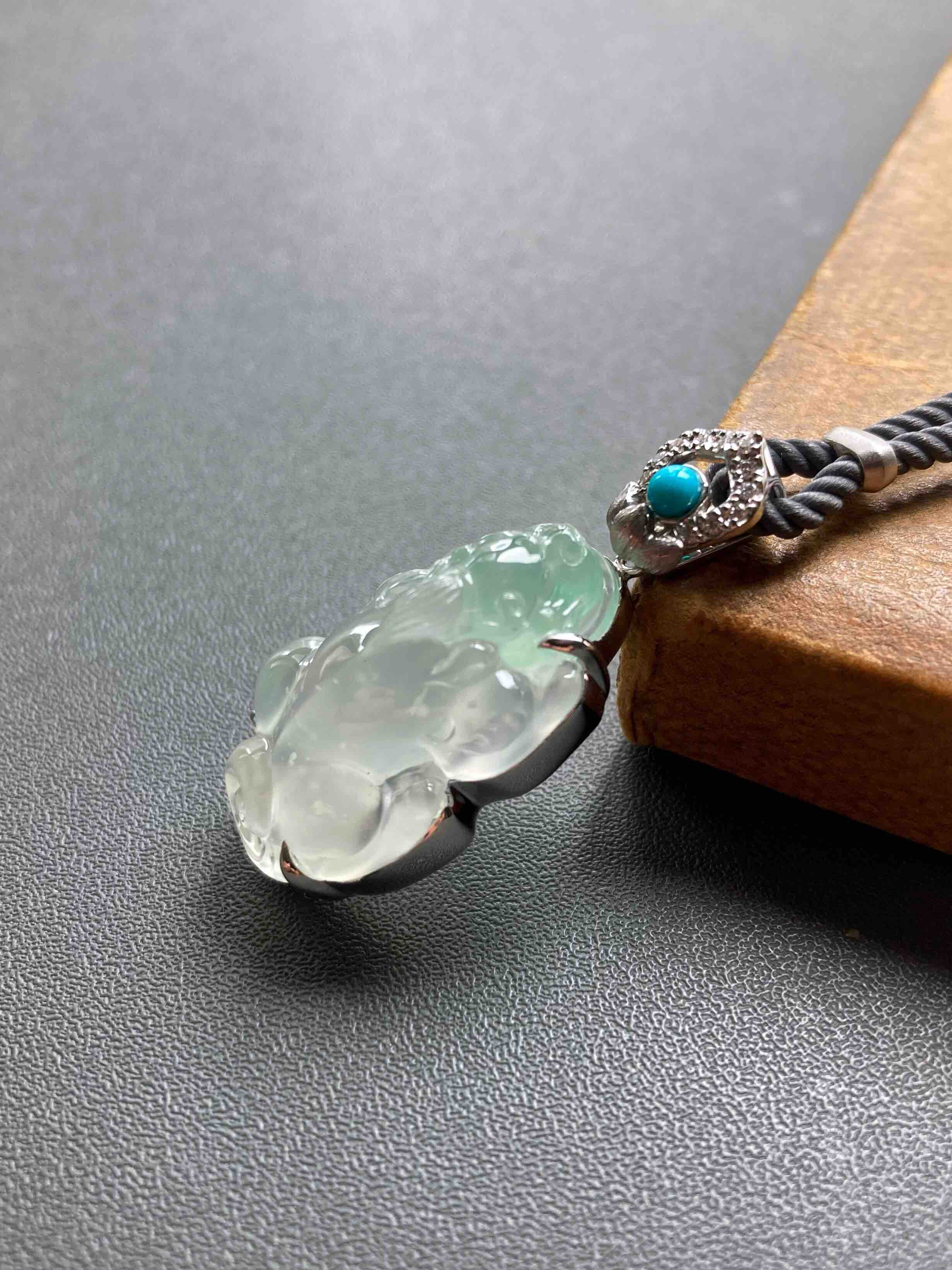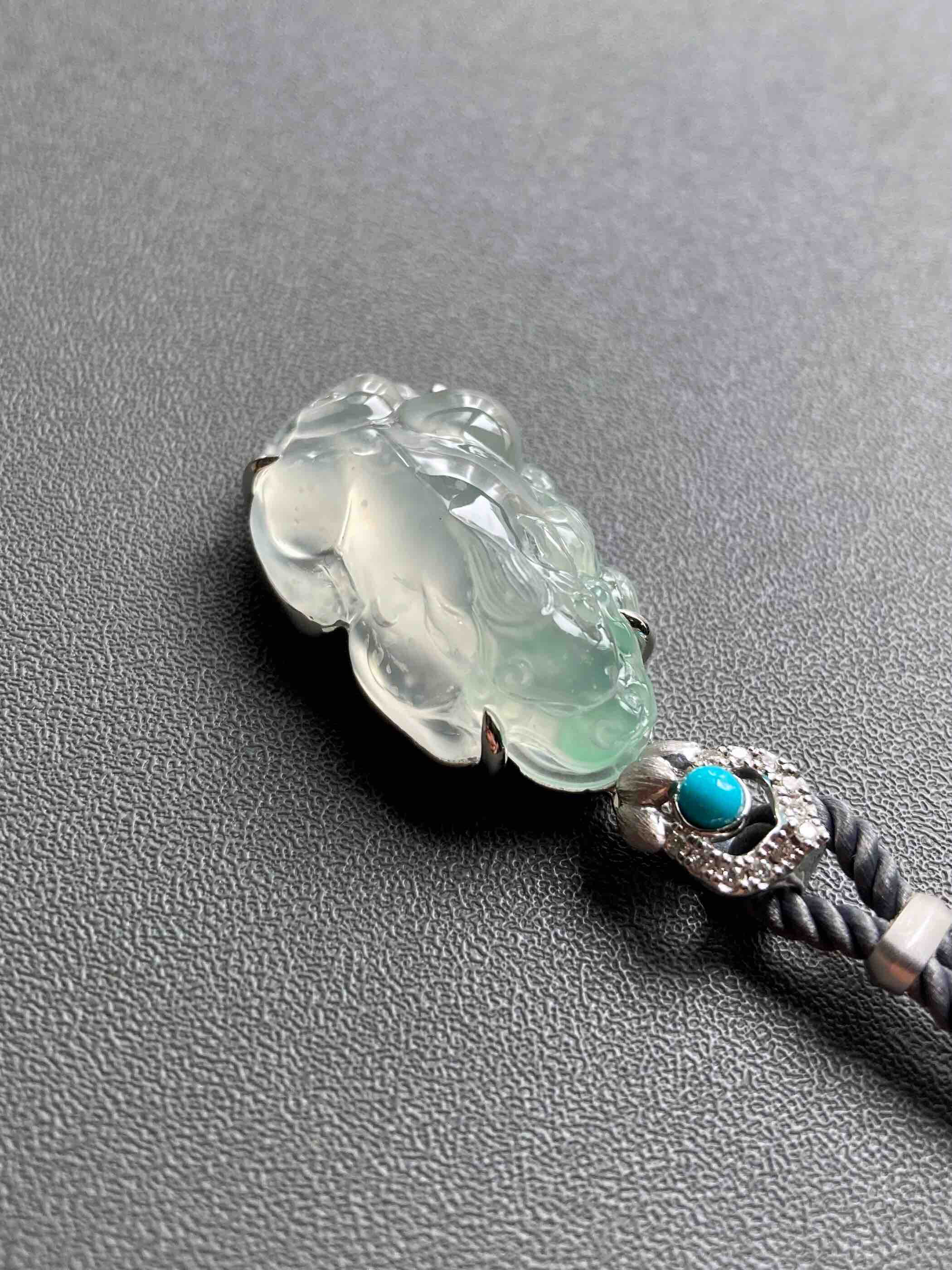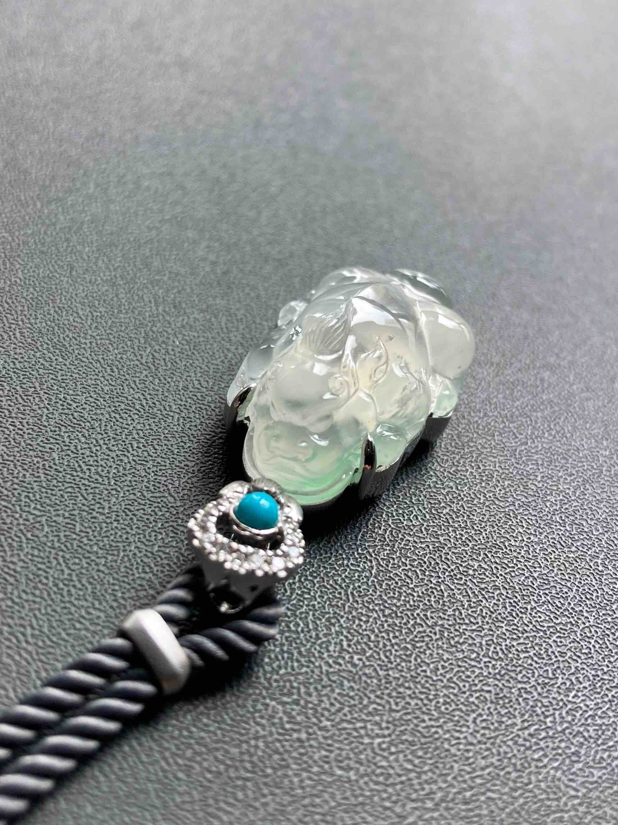 收藏级玻璃种飘阳绿翡翠貔貅,这么大,这么厚,裸石26.5×15.7×9.8mm,镶嵌后36.7×15.8×12.1mm,名师雕刻,贼精美,貔貅玩到这个算是毕业了,市面上少见的大气规格,绑绳的大件,男女皆可佩戴,18k白金钻石镶嵌,绿松石扣头,翡翠禄来原创设计