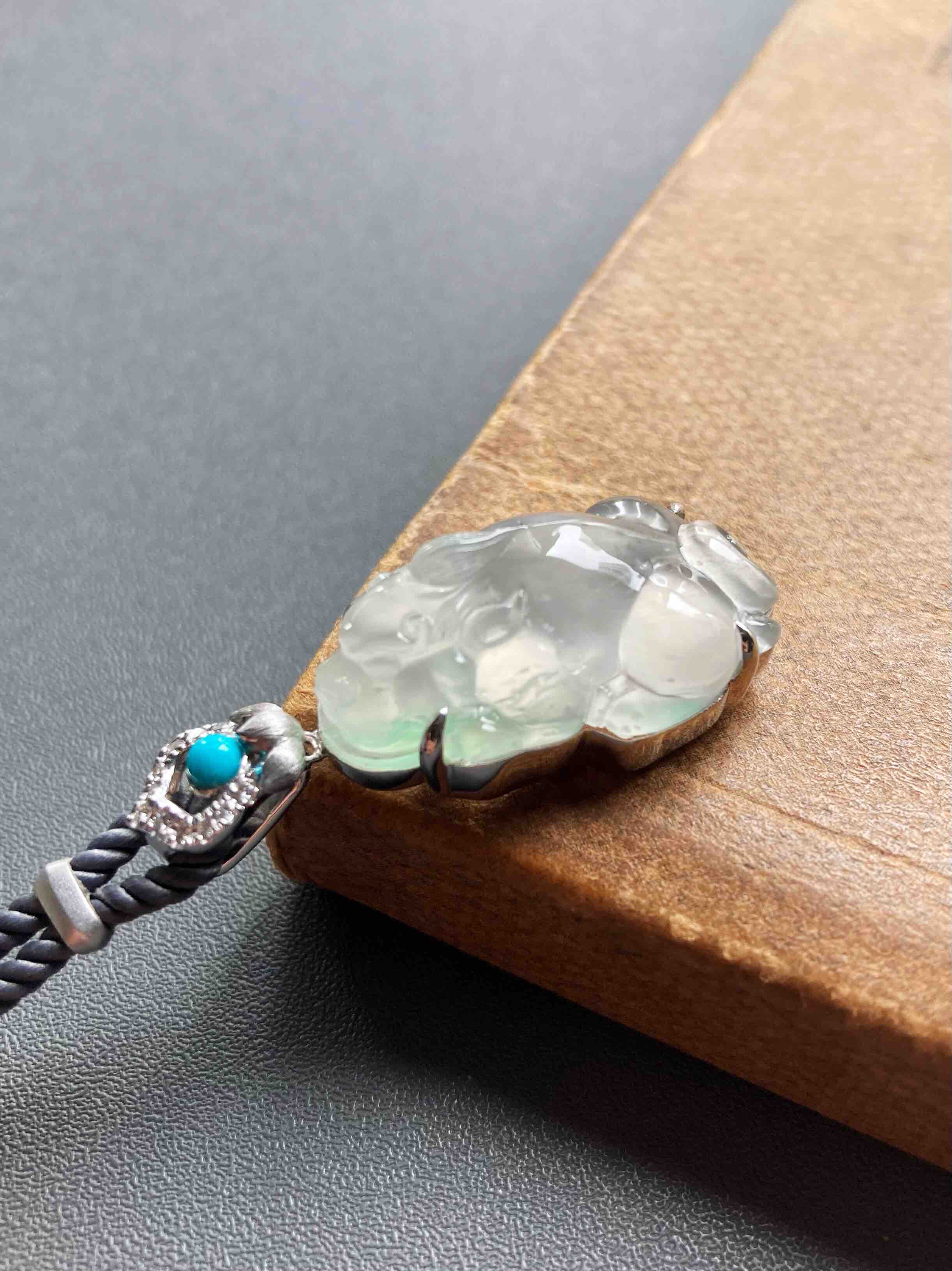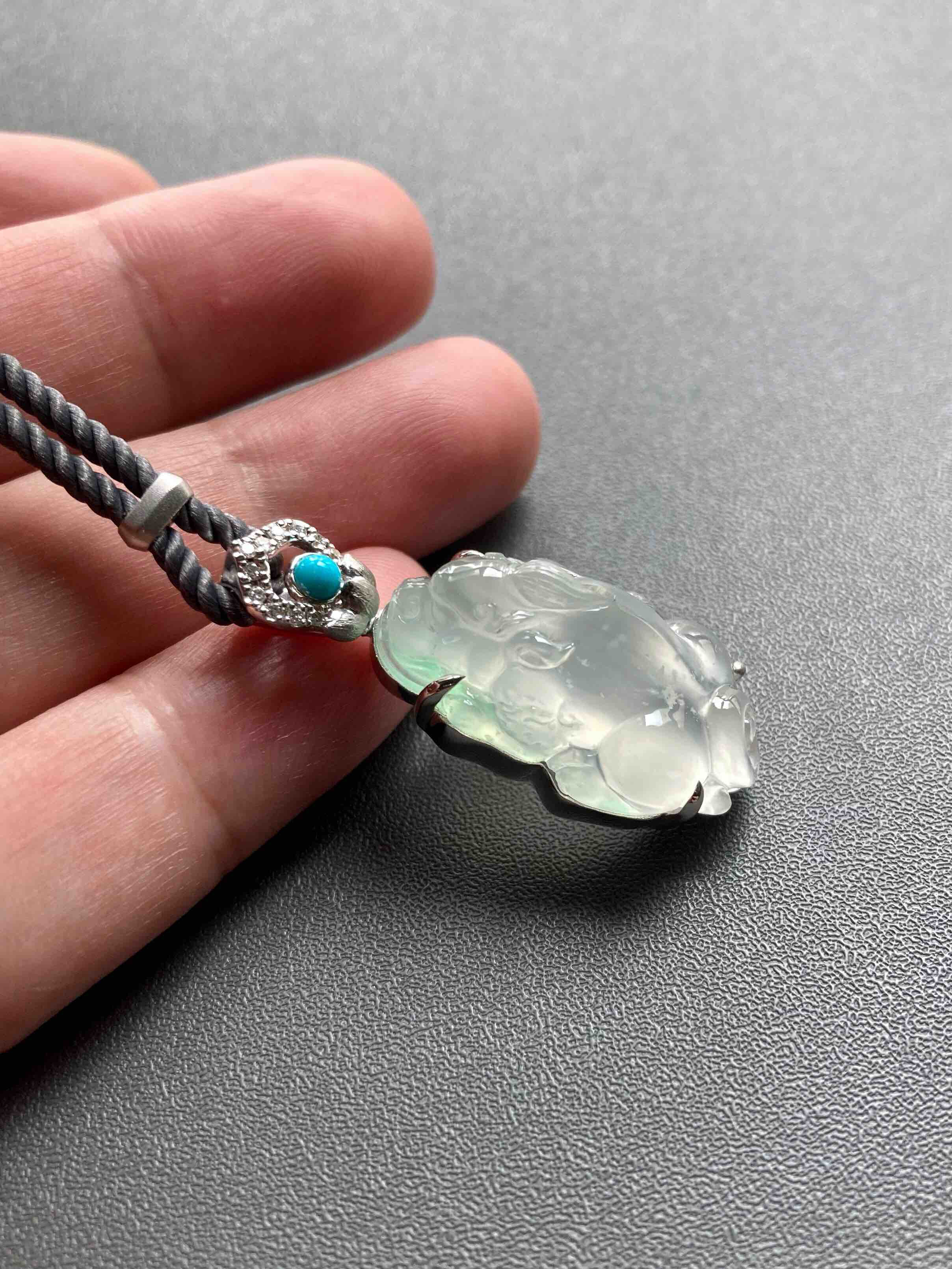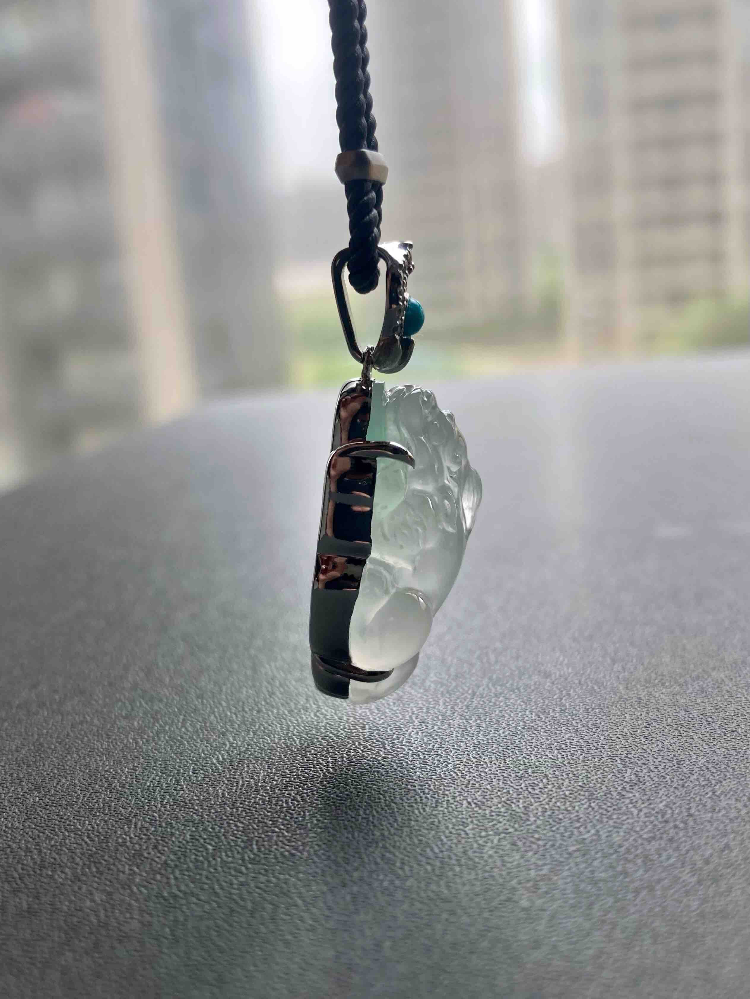 收藏级玻璃种飘阳绿翡翠貔貅,这么大,这么厚,裸石26.5×15.7×9.8mm,镶嵌后36.7×15.8×12.1mm,名师雕刻,贼精美,貔貅玩到这个算是毕业了,市面上少见的大气规格,绑绳的大件,男女皆可佩戴,18k白金钻石镶嵌,绿松石扣头,翡翠禄来原创设计