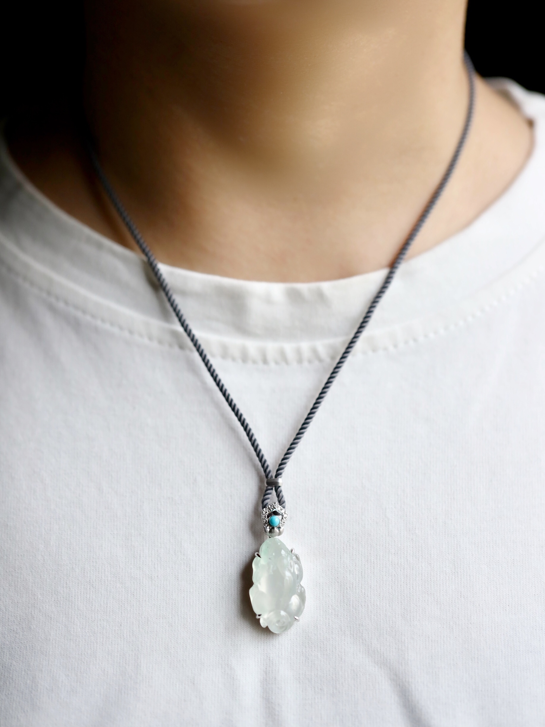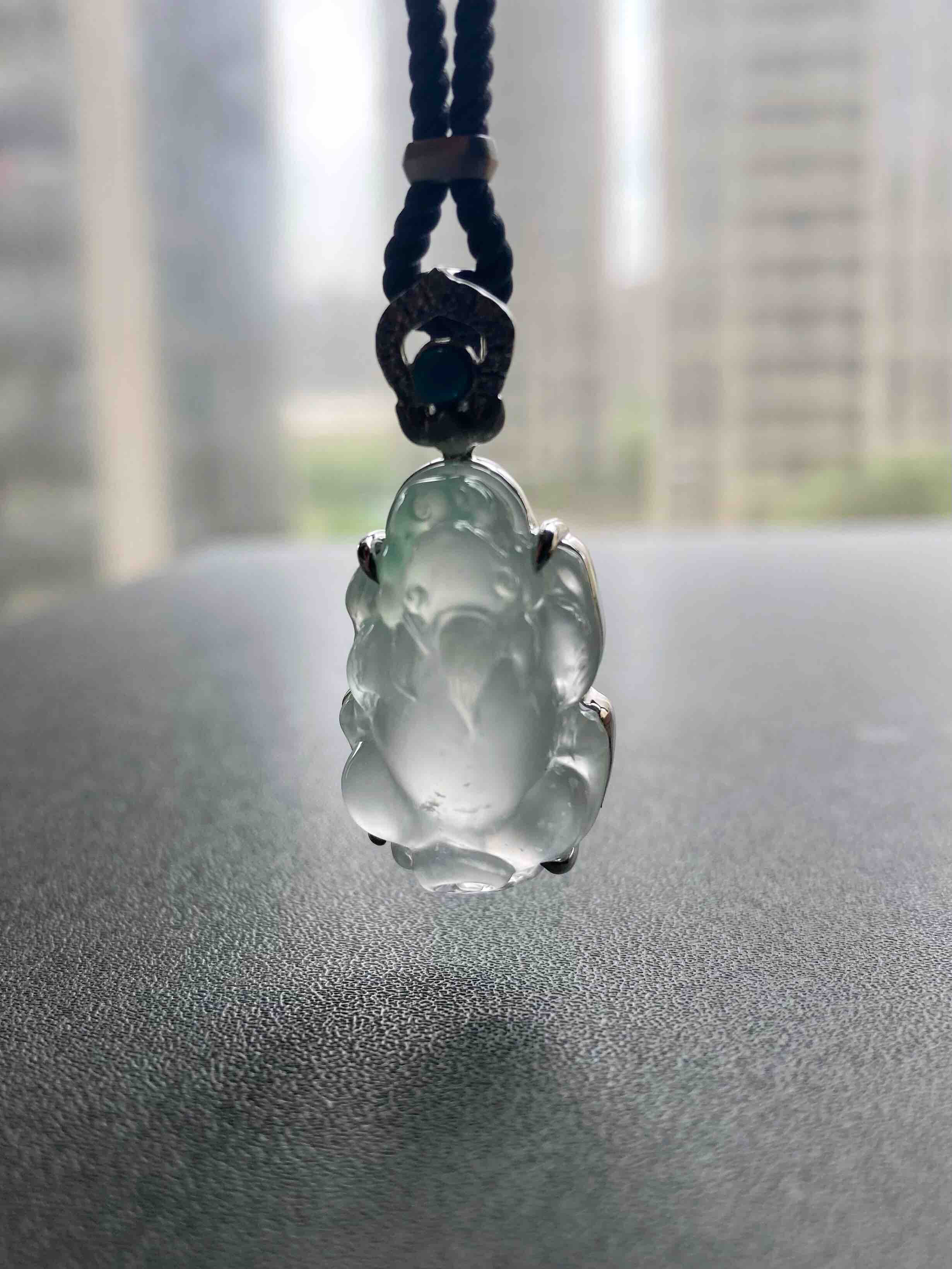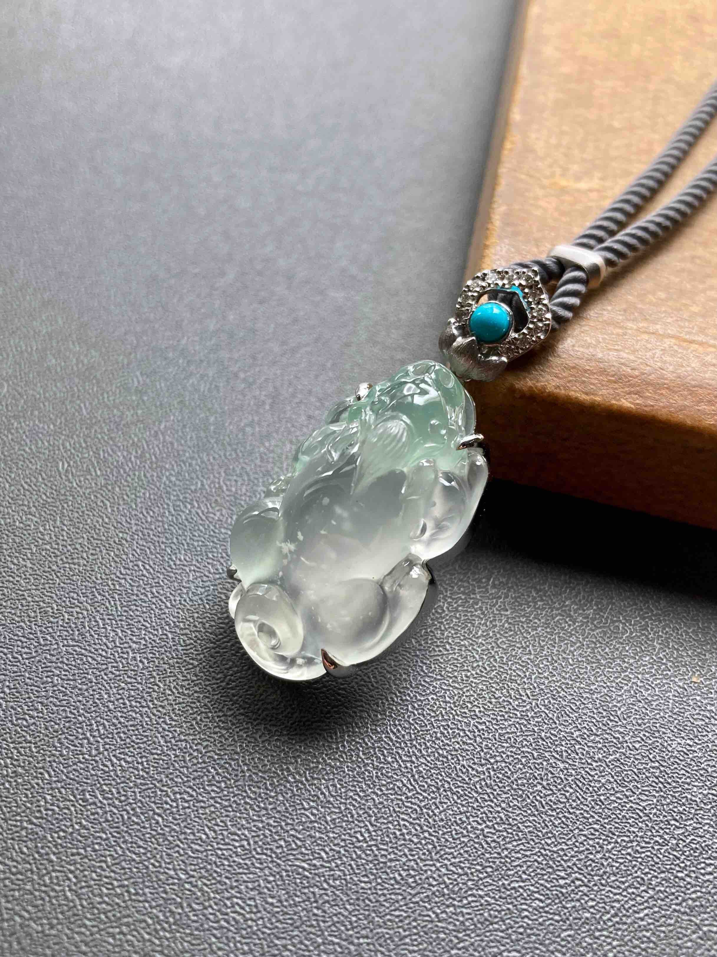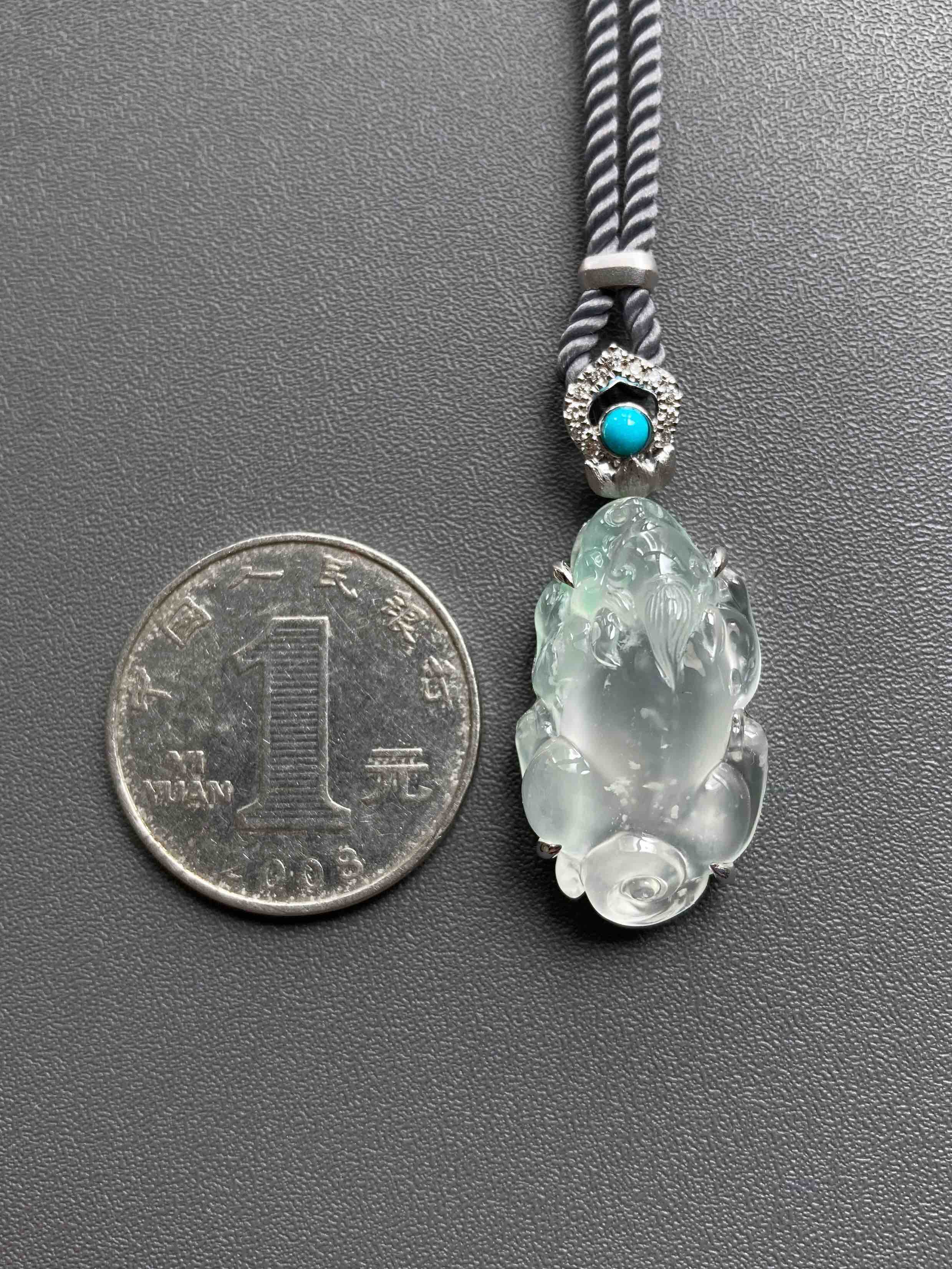 收藏级玻璃种飘阳绿翡翠貔貅,这么大,这么厚,裸石26.5×15.7×9.8mm,镶嵌后36.7×15.8×12.1mm,名师雕刻,贼精美,貔貅玩到这个算是毕业了,市面上少见的大气规格,绑绳的大件,男女皆可佩戴,18k白金钻石镶嵌,绿松石扣头,翡翠禄来原创设计