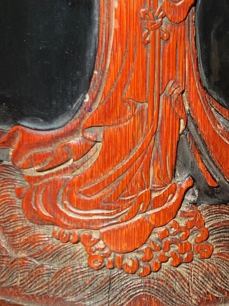 此黑漆地雕洛神赋图文竹雕笔筒,如图所示,边沿大漆稍有剥落,竹雕仕女底部有细微龟裂痕,除此以外,基本保存完好无损。表面包浆皮壳淳厚温润。保留于日本藏家量身定制的桐木箱锦盒内。