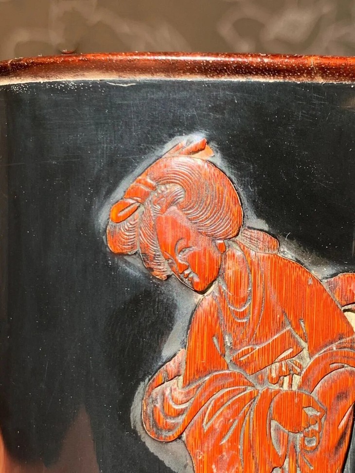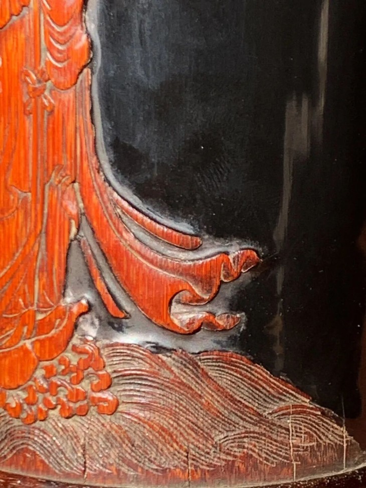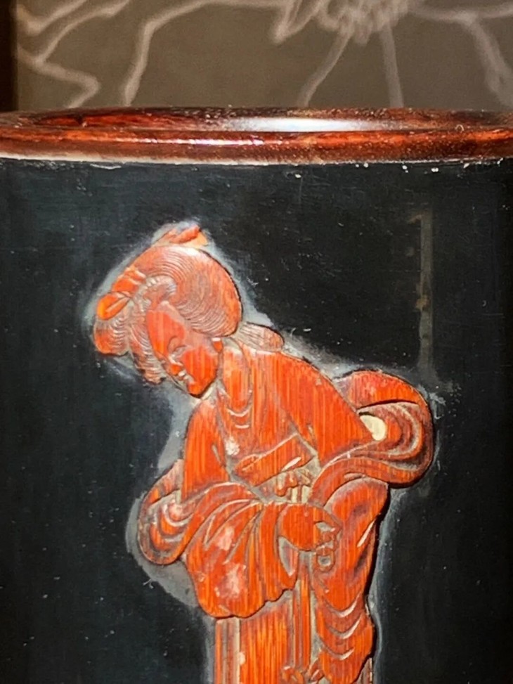 此黑漆地雕洛神赋图文竹雕笔筒,取材精良,设计典雅别致,工艺精湛细緻,是早年文人雅士之实用雅器。保留于日本藏家量身定制的桐木箱锦盒内。