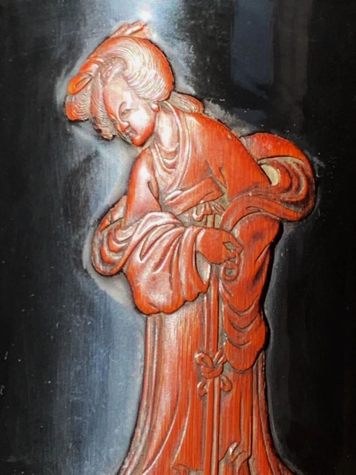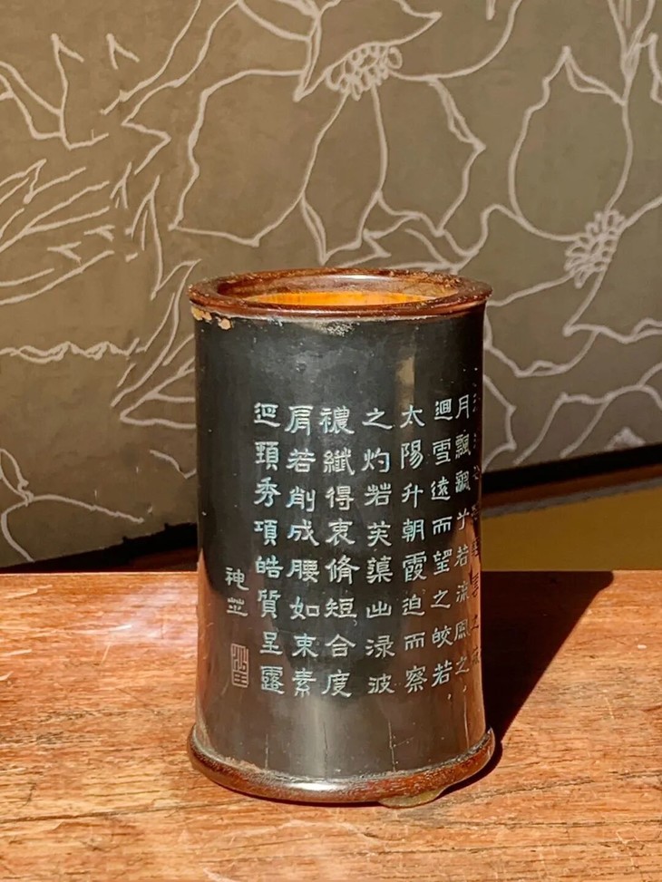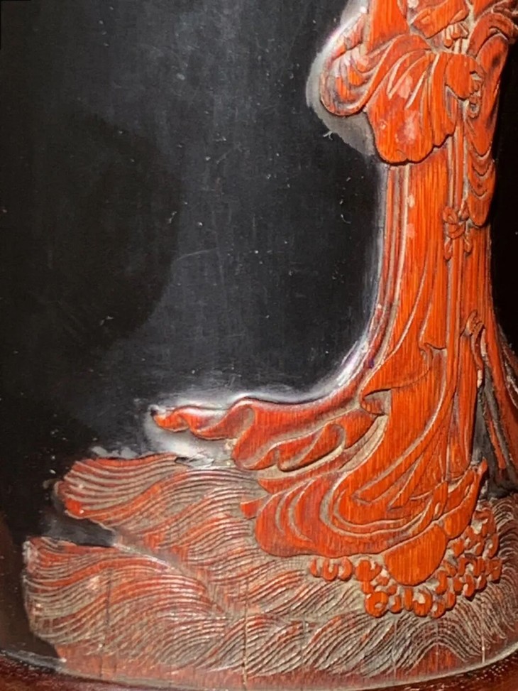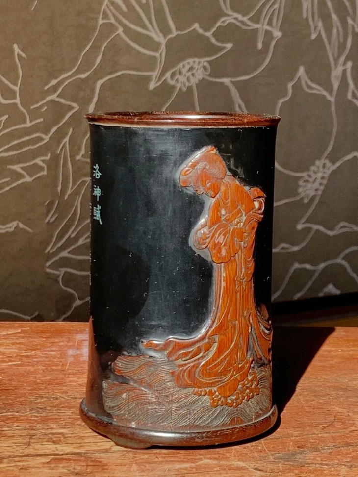 这是一件构图典雅、工艺独特精湛的造型的老竹雕笔筒,取材圆型竹筒浮雕仕女图与阴刻填彩诗文,以黑色大漆覆盖无纹饰处为底色,上下镶小叶紫檀为口沿及三足底,纹饰题材是“洛神赋“与洛神像,文后刻“神芝“款与印章,此老笔筒整体风格精緻貴气,浮雕仕女婉约生动、线条流畅,阴刻隶书体挺拔秀美,底色黑漆深遽纯净,名款“神芝”所指的是清代中期嘉兴地区集书法、绘画与竹刻技艺于一身的文人艺术家沙神芝,其创作以浅刻阴文技法为主,作品注重题跋款识与书画笔墨意趣,题材多集中于扇骨、臂搁等文房小品。