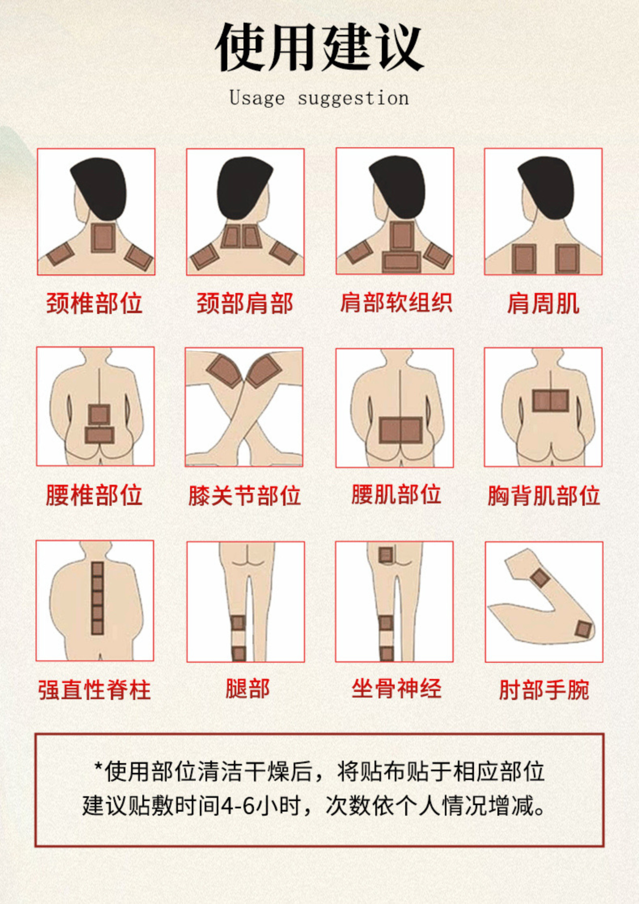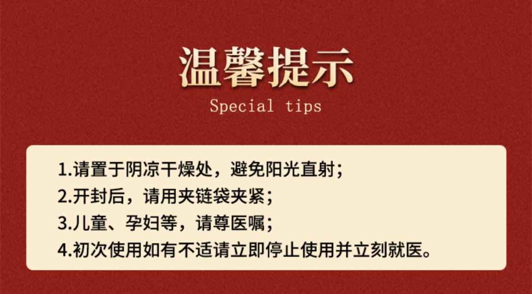 温馨小提示:过敏体质和孕、婴、哺乳期都不建议使用;如果皮肤破皮溃烂的时候,也要避开使用;还有就是,贴布撕下半小时内,注意不要碰水哦!如果出现红肿、瘙痒或刺激等异常现象,应立即停止使用!贴布只供外用,请勿食用呀!