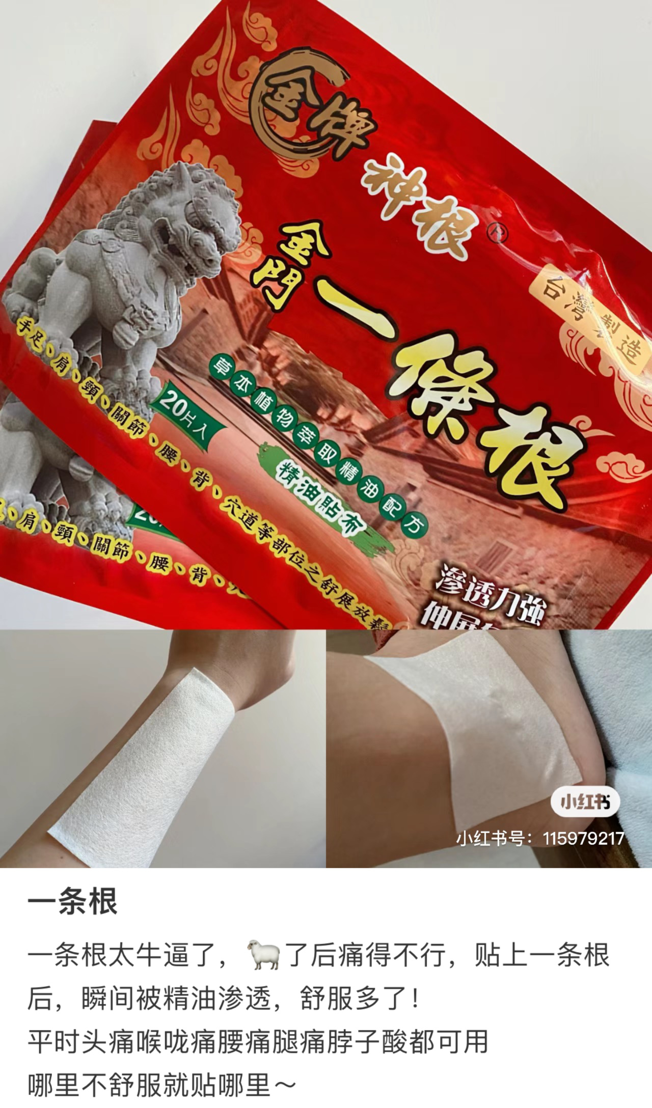 金门一条根,应该是每个去湾湾的朋友都会带回来的特产了,它对有关节问题的老人以及经常对着电脑的我们都很有效。今天上的是他们家的神根贴布,哪痛贴哪儿,用起来也超级方便,可以根据需要的大小进行裁剪后使用,一点也不浪费哦!