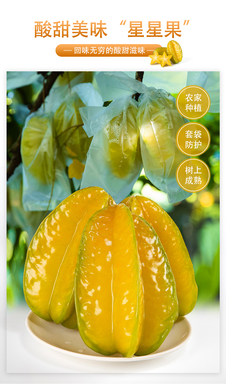 杨桃又称五棱子、五敛子、羊桃,因为切开后果肉像是五角星,还有一个浪漫的名字——星星果。杨桃在国内已经有数百年的种植历史,我试吃的品种来自福建漳州,这里具有良好的生态环境,属于亚热带暖湿季风气候,阳光充足、雨量充沛,是全国有名的杨桃种植区。当地的果农都有着多年的种植经验,坚持不打农药,全靠散养跑步鸡生物捕虫。每到杨桃快要成熟时,果农还会给每一颗杨桃套上袋子,防止虫害鸟食。因此这里的杨桃体型硕大饱满,果皮光滑细腻,外皮薄如膜,纤维少,口感鲜嫩,汁水丰沛。
