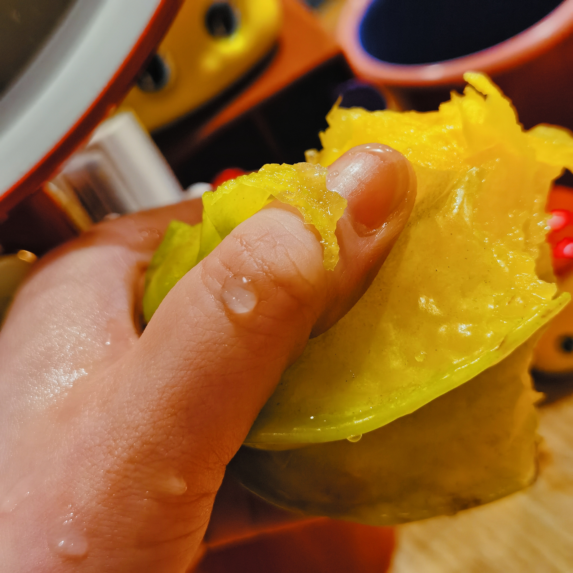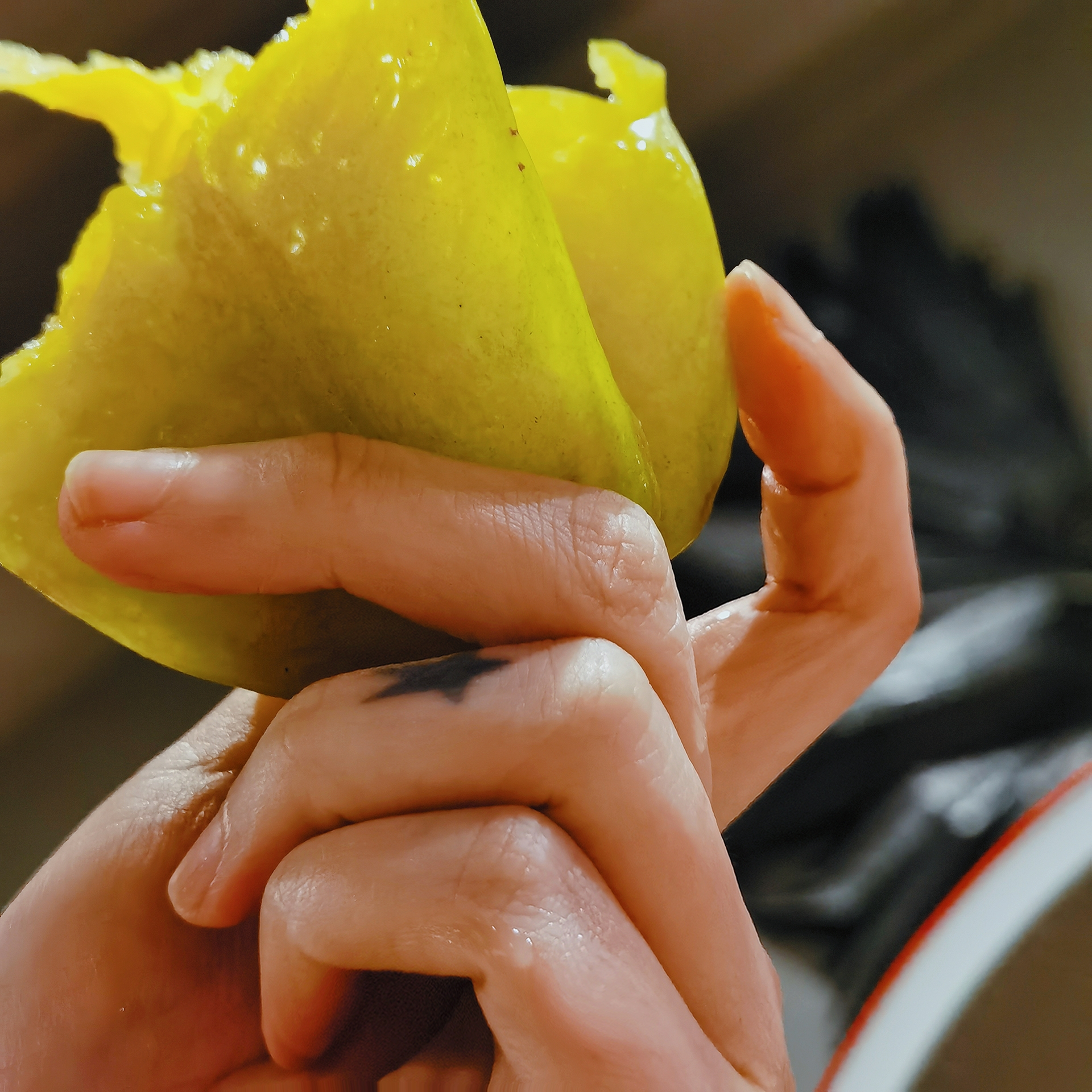 以前吃到的杨桃大多是青绿的,但这款杨桃收到就有点泛黄了,果园的人告诉我,市场上为了卖久一点,果子都是五六分熟,这种没有完全熟的杨桃外皮就是青绿色或淡绿色,而成熟的杨桃实际上是黄绿色或鲜黄色的,肯定更好吃咯!熟熟的杨桃果肉软而紧实,微酸的口感加上满满的杨桃清香,还几乎无渣,真的是清甜多汁啊!除了直接啃,还可以切成一颗颗小星星,蘸上酸梅粉,酸酸甜甜,口感就更是丰富了,喜欢!