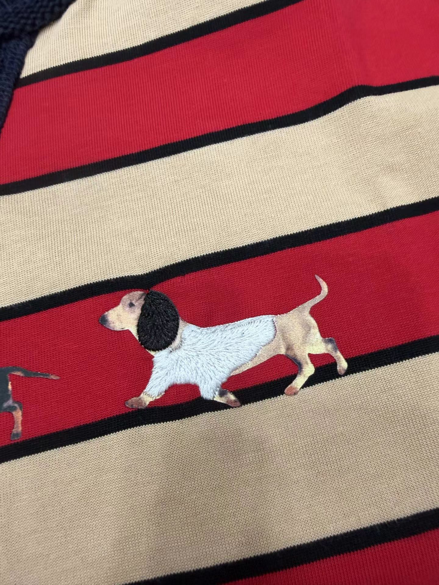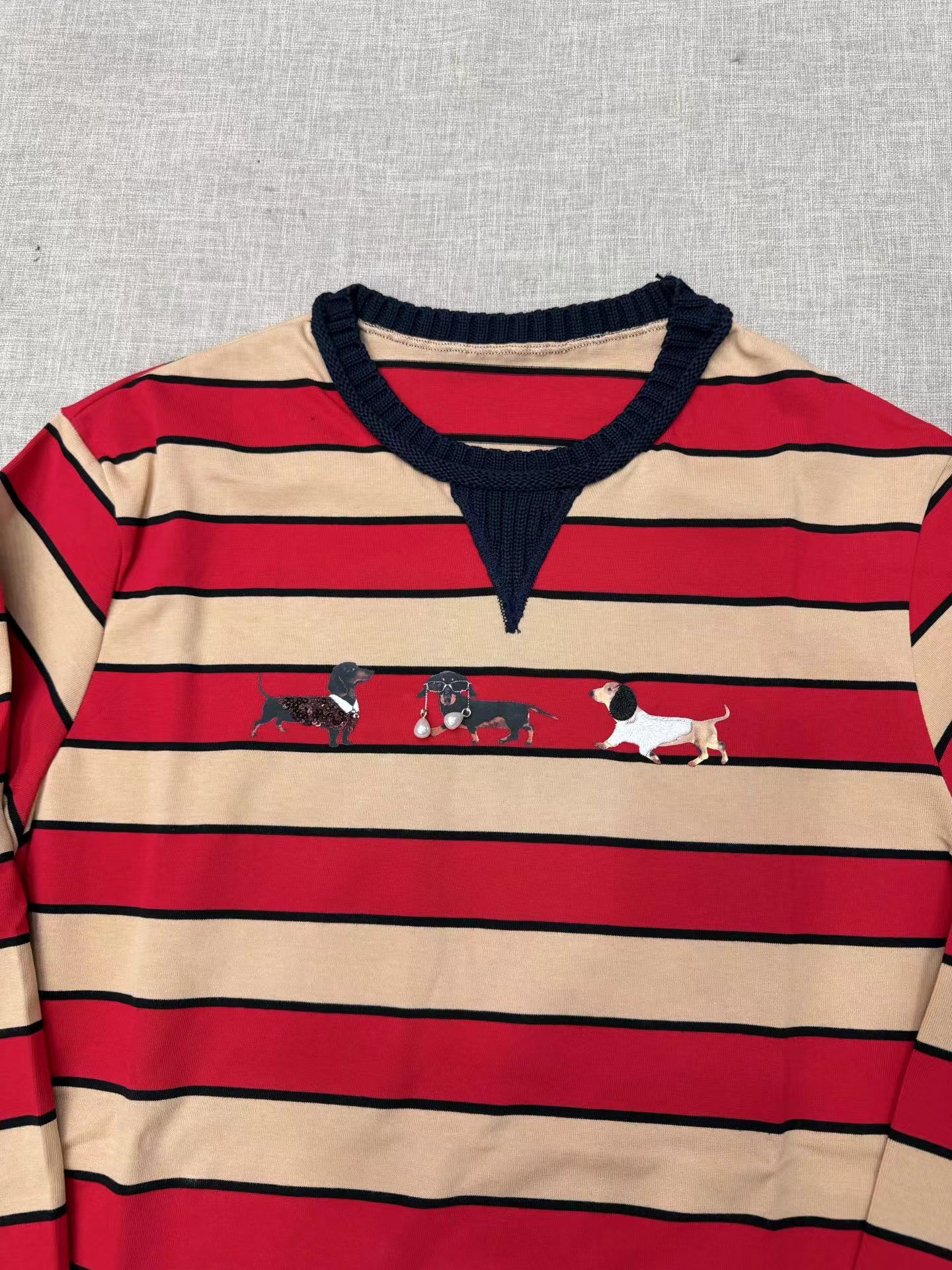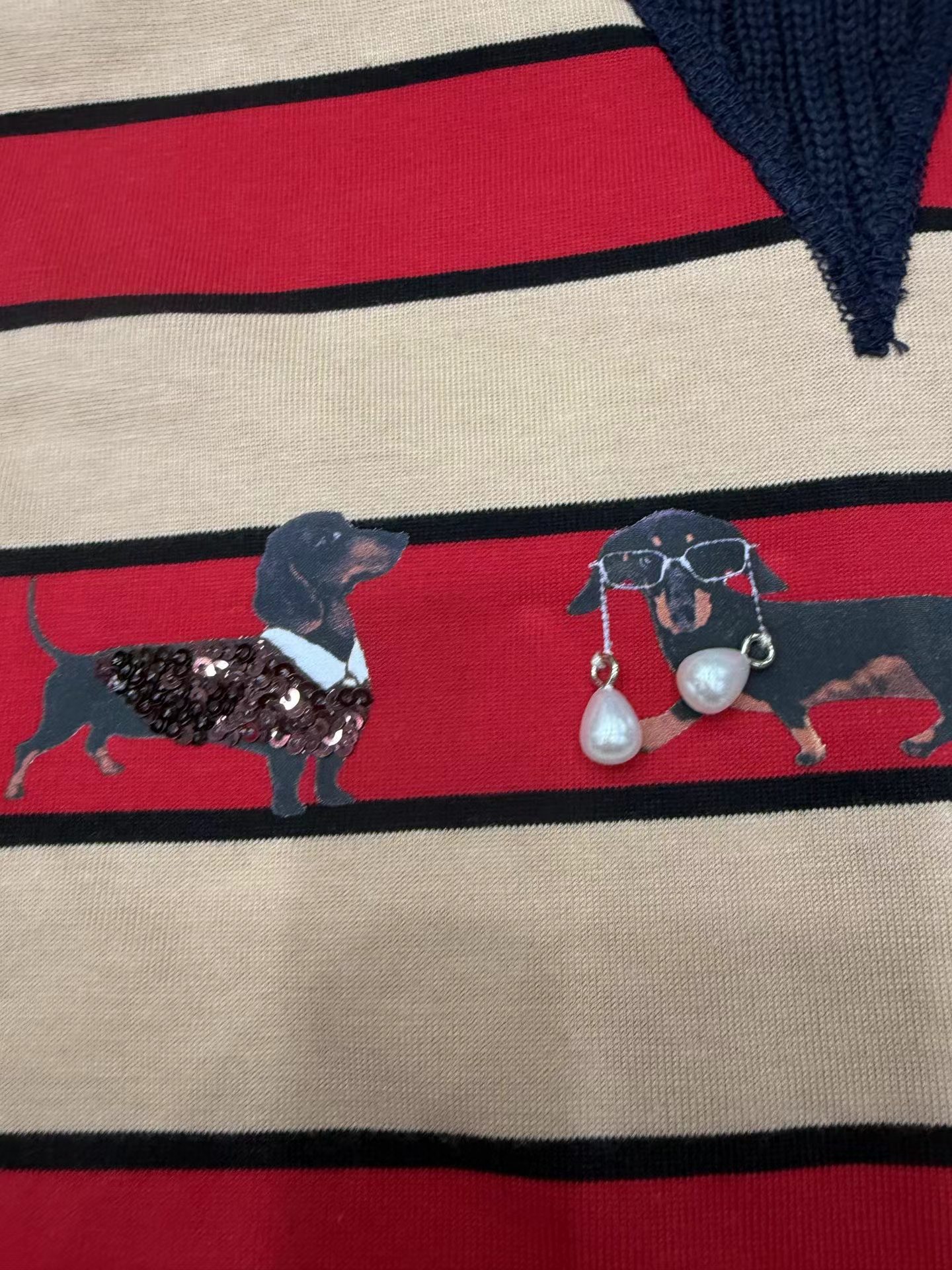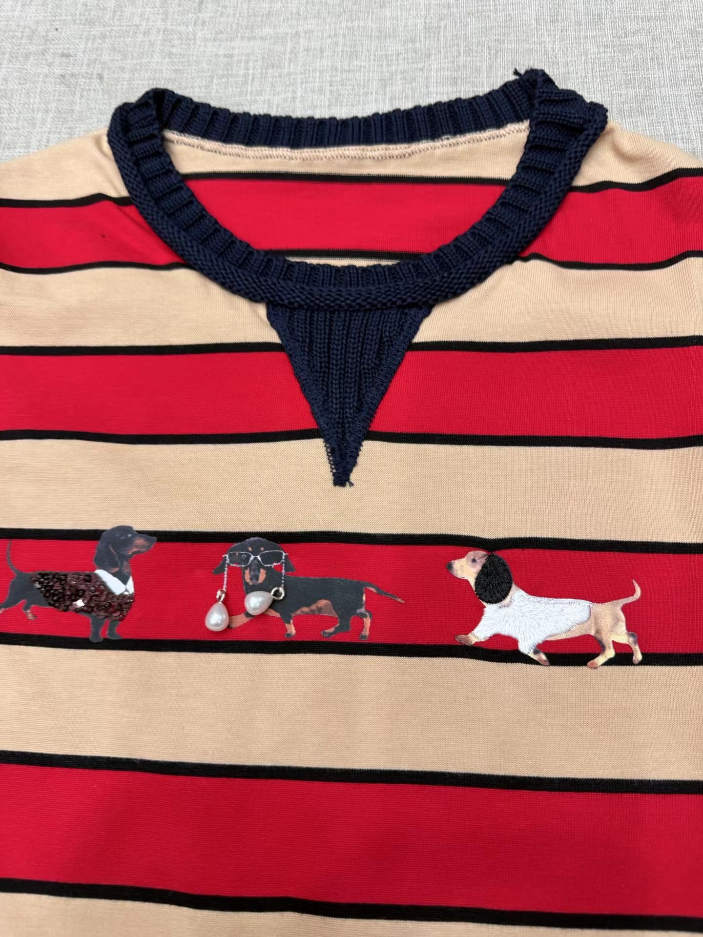 设计师款复古萌趣红条纹上衣 这款很有创意的设计领口拼接针织 胸前三只小腊肠狗 条对条设计