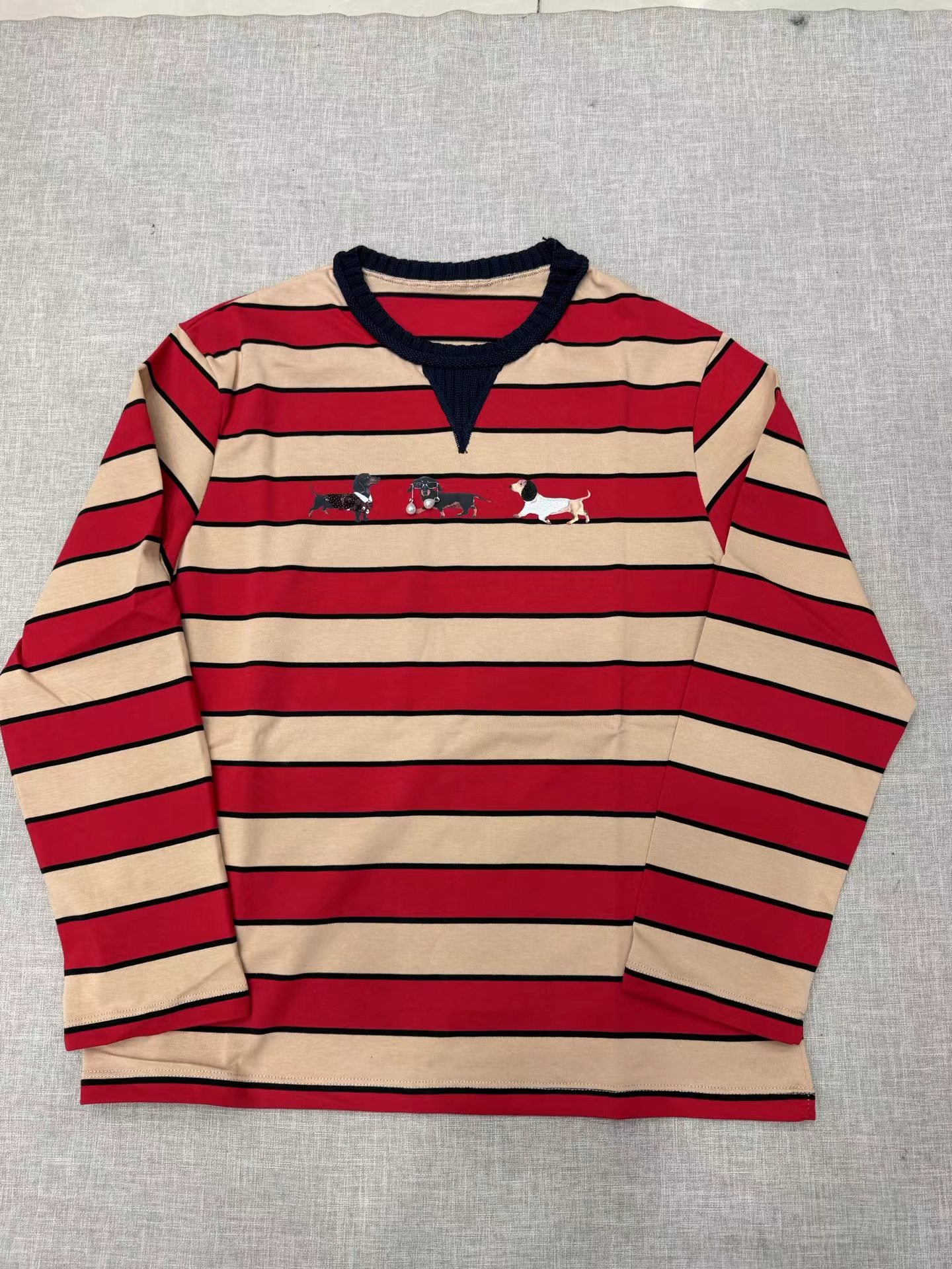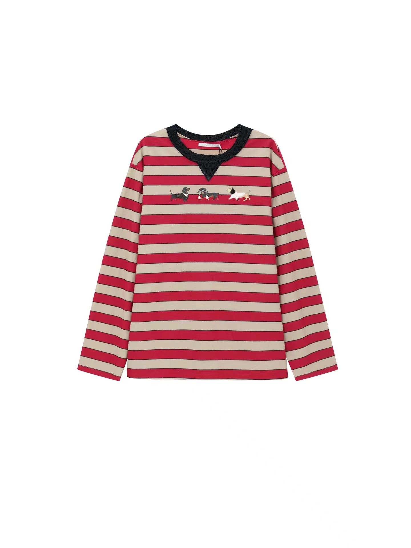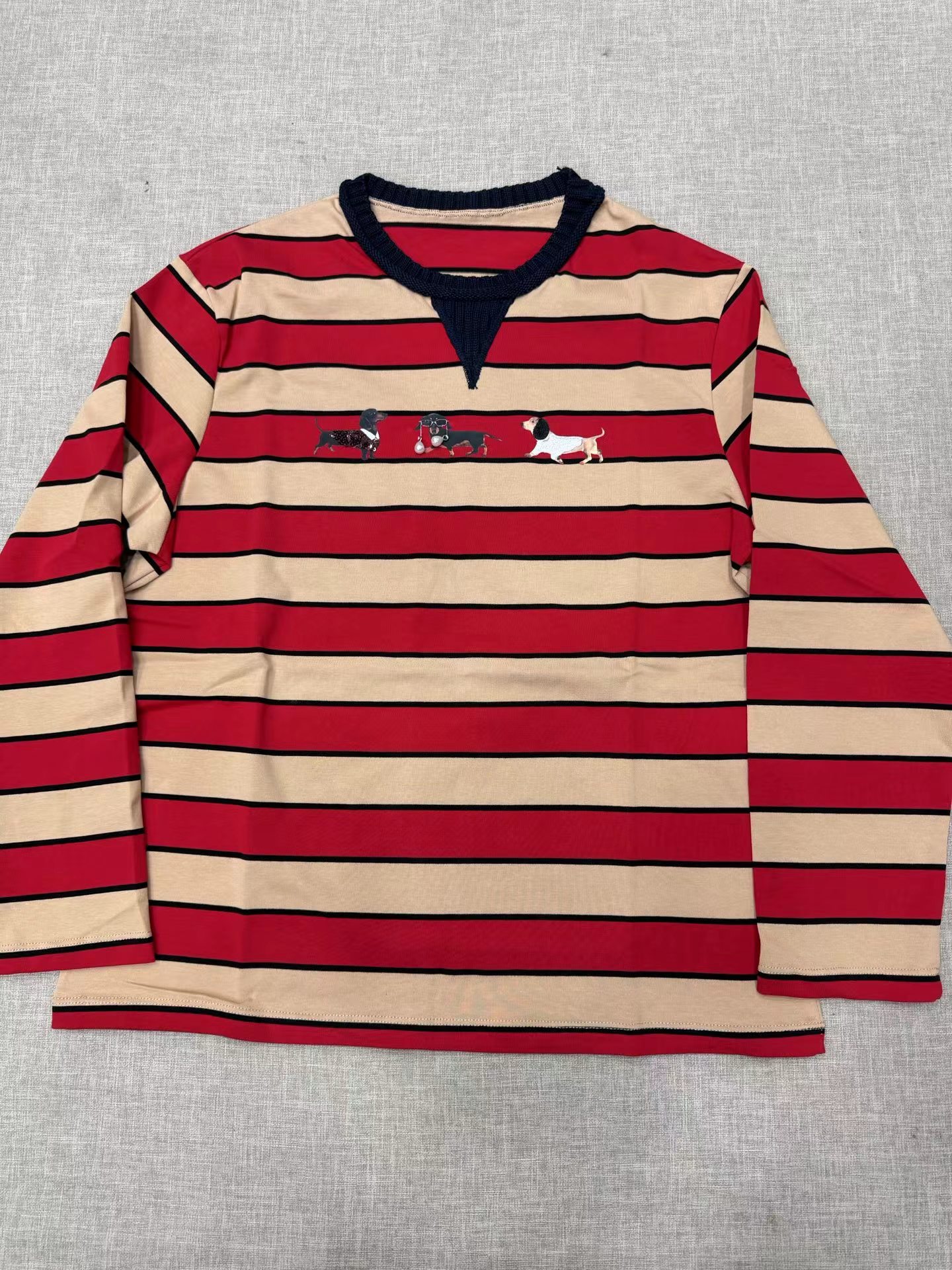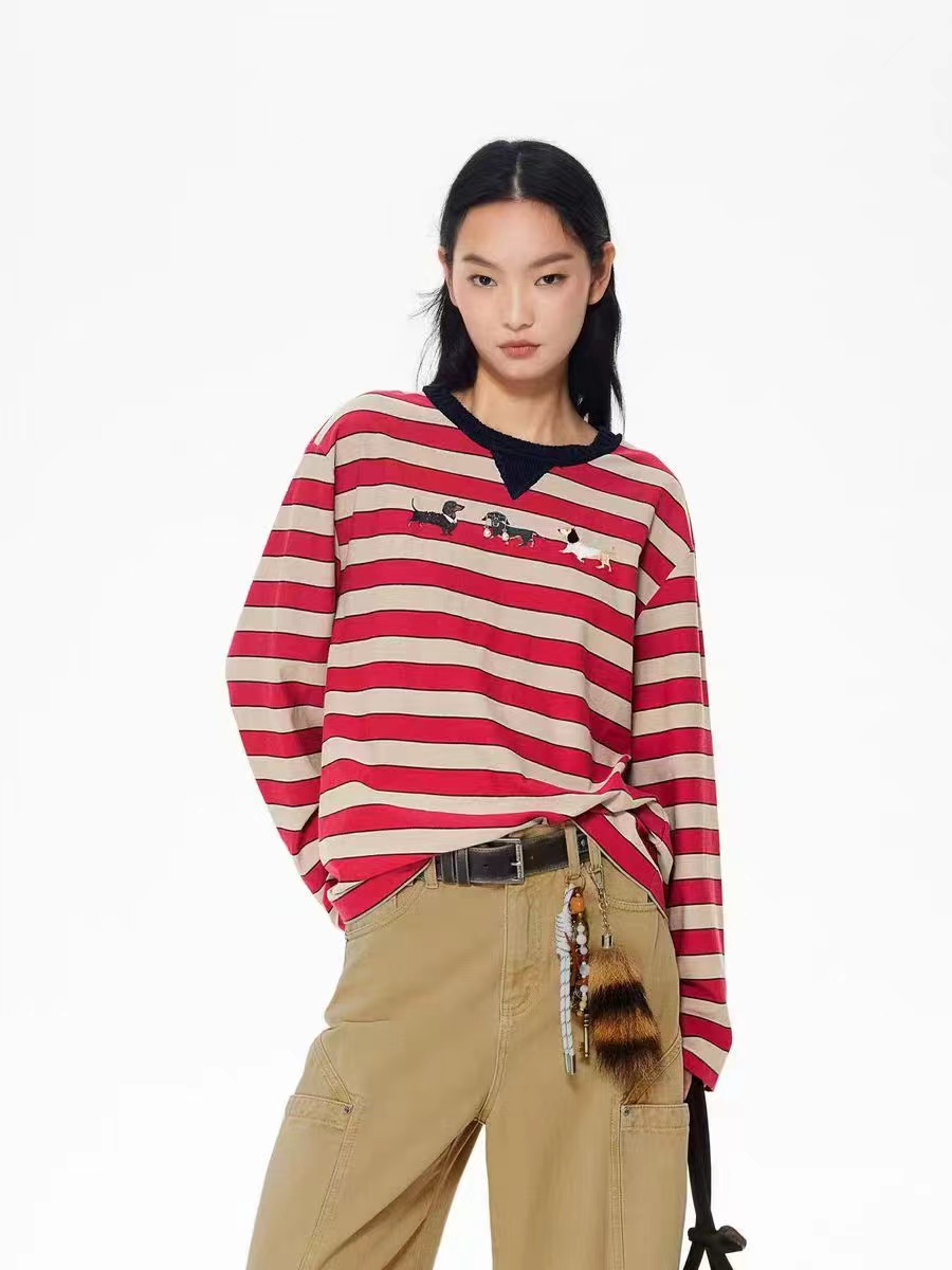 设计师款复古萌趣红条纹上衣 这款很有创意的设计领口拼接针织 胸前三只小腊肠狗 条对条设计
