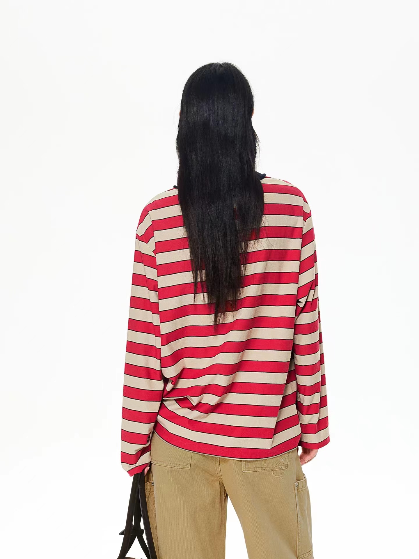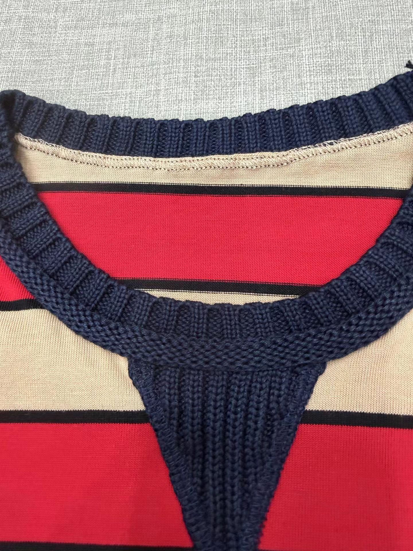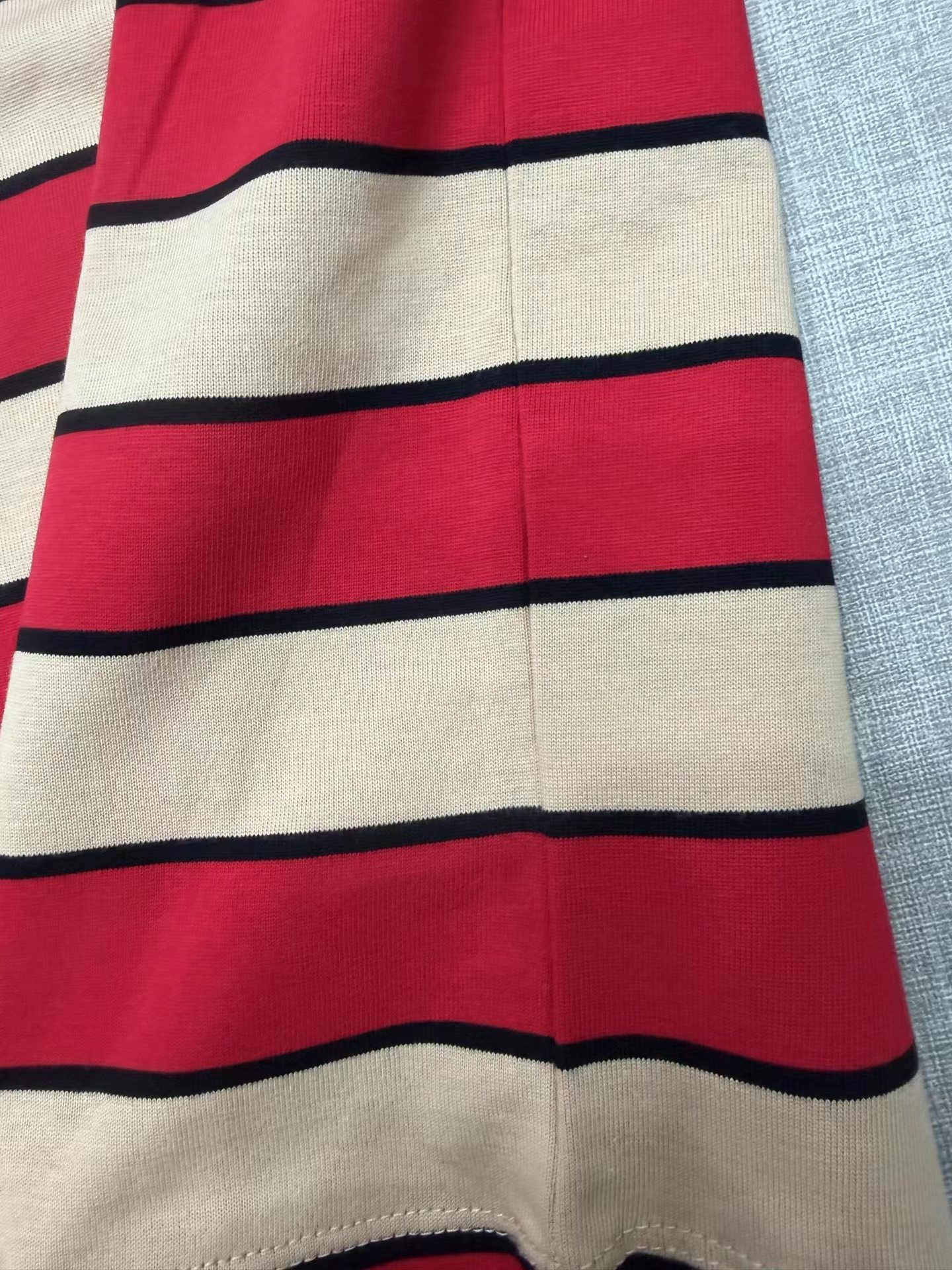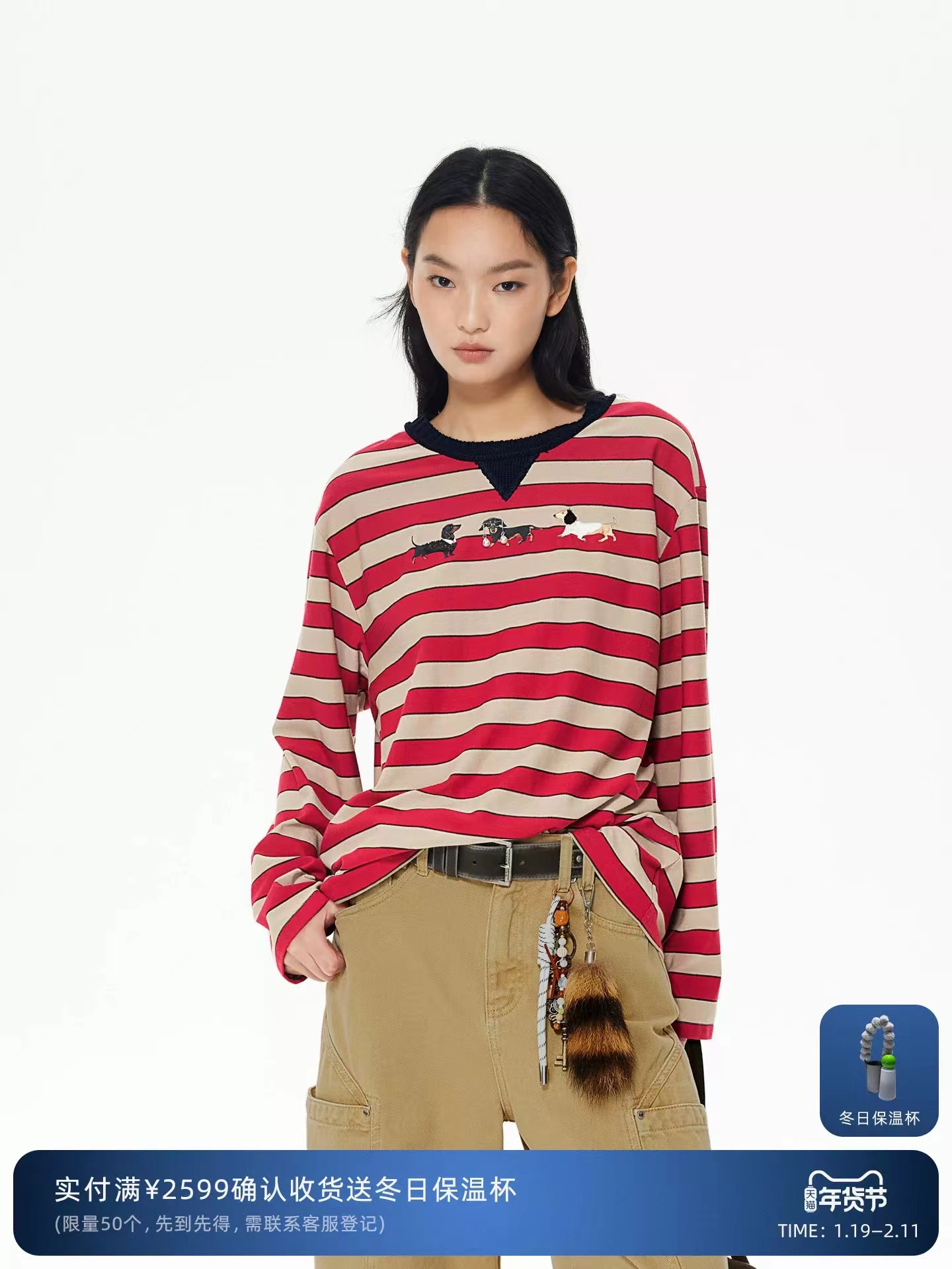 设计师款复古萌趣红条纹上衣 这款很有创意的设计领口拼接针织 胸前三只小腊肠狗 条对条设计