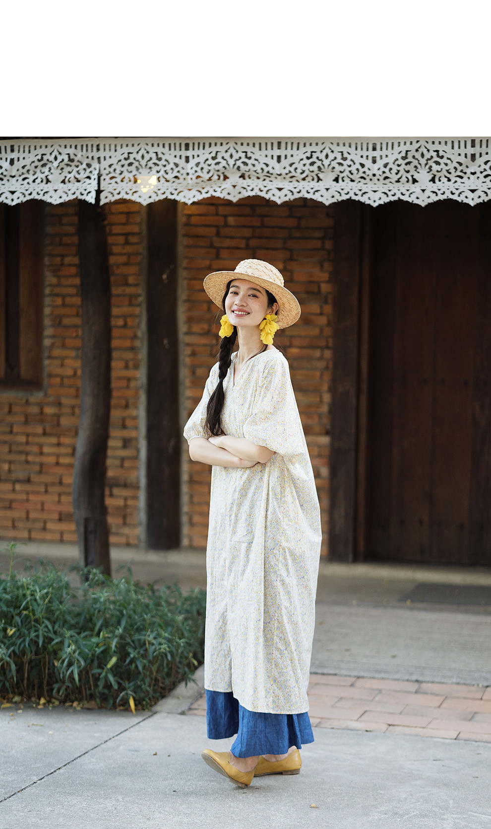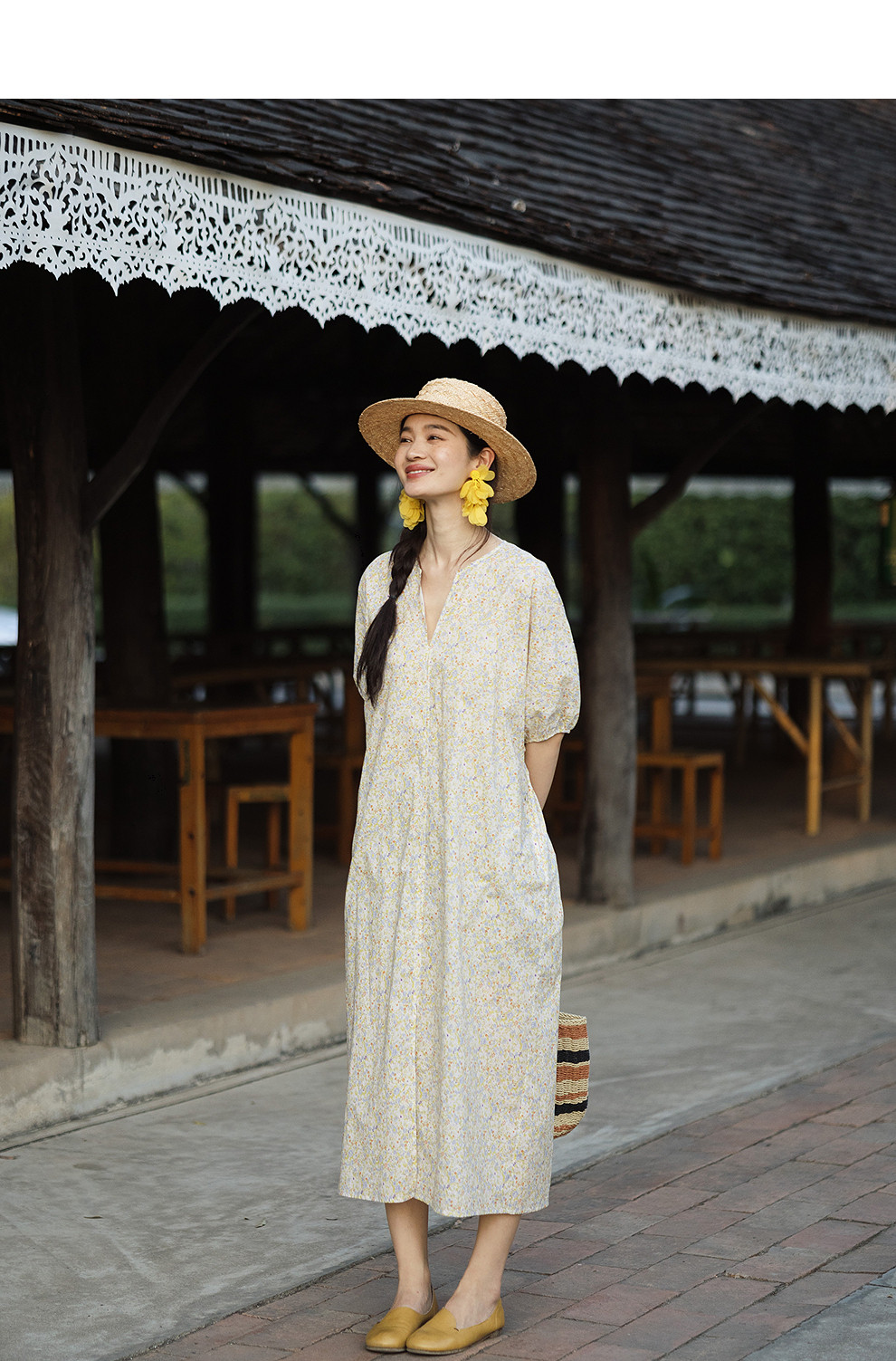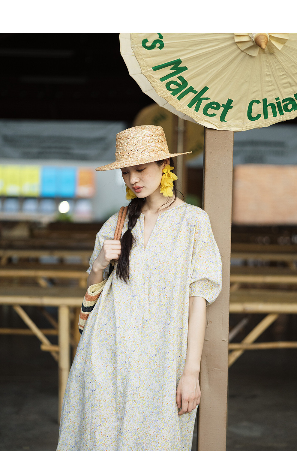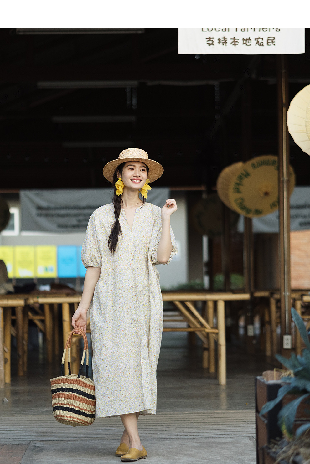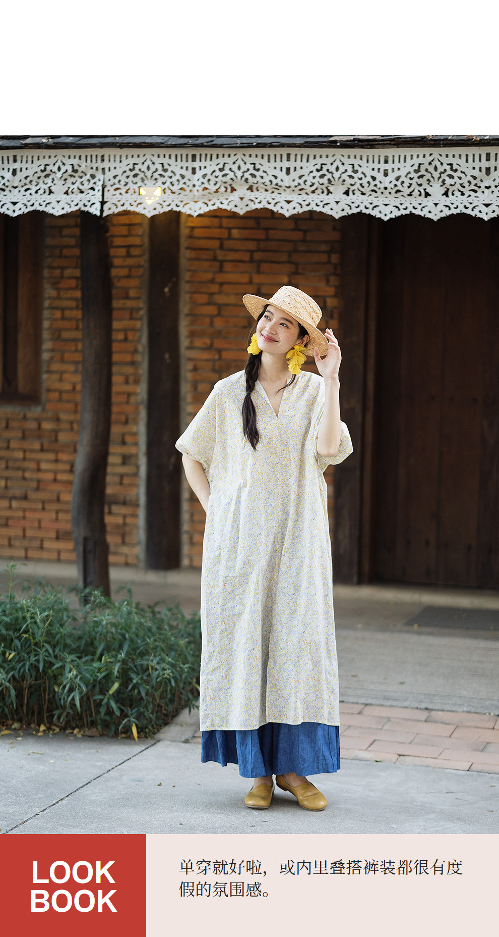 绽放164朵/纯棉复古撞色碎花v领中袖连衣裙松弛感宽松连身袖长裙