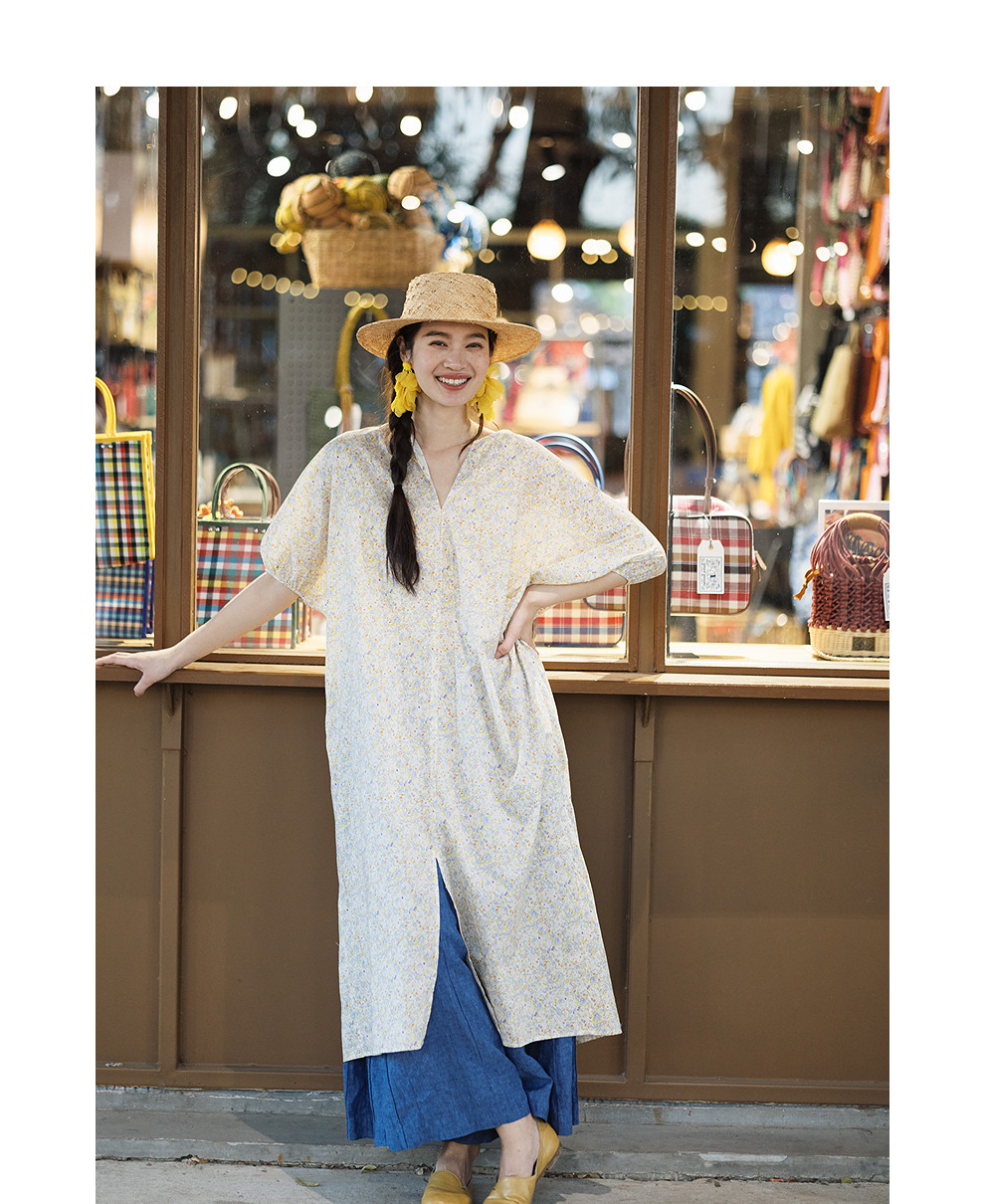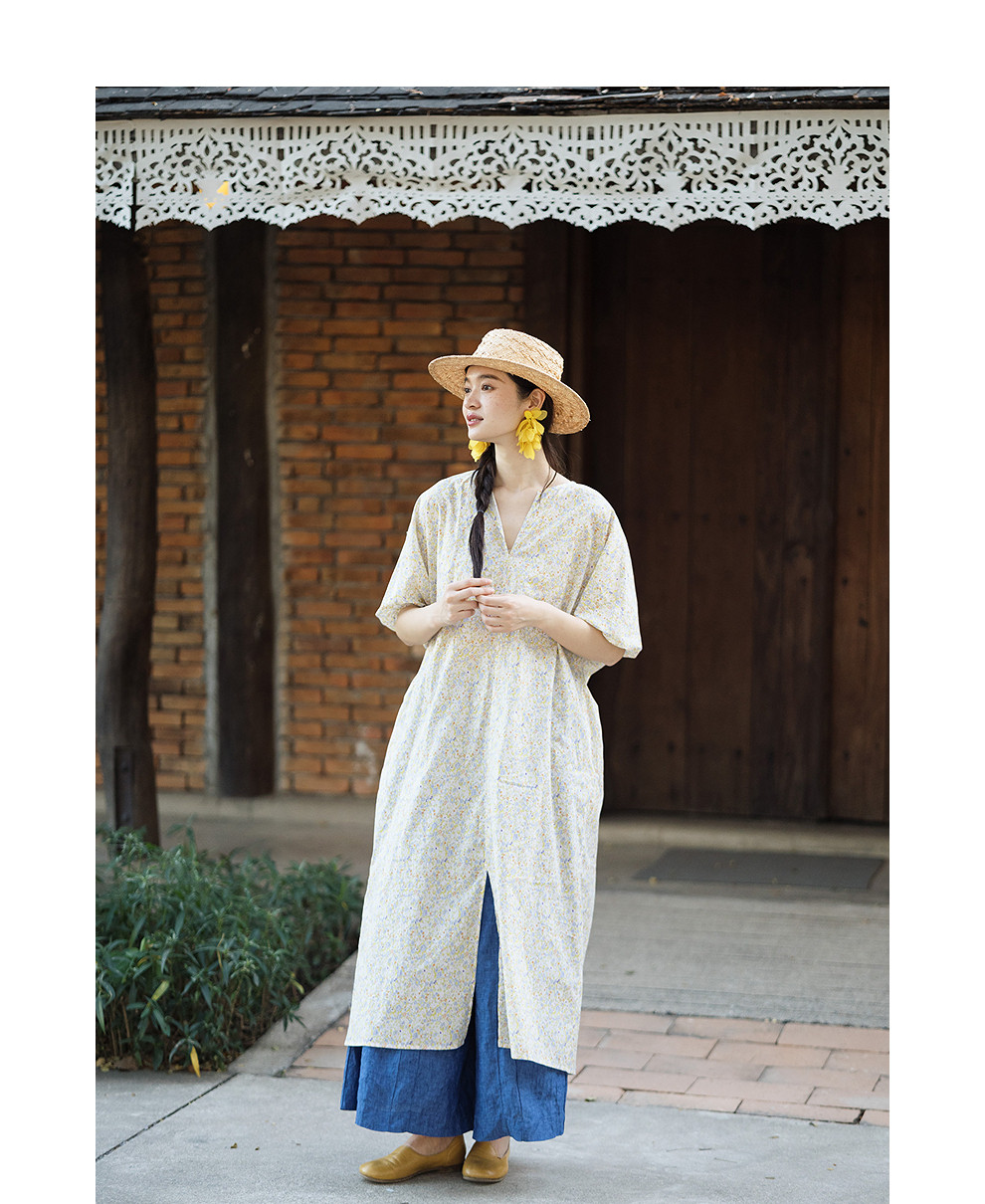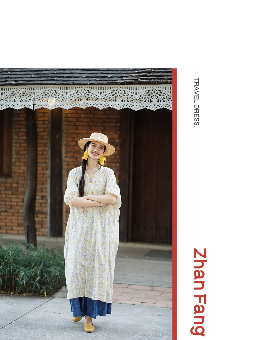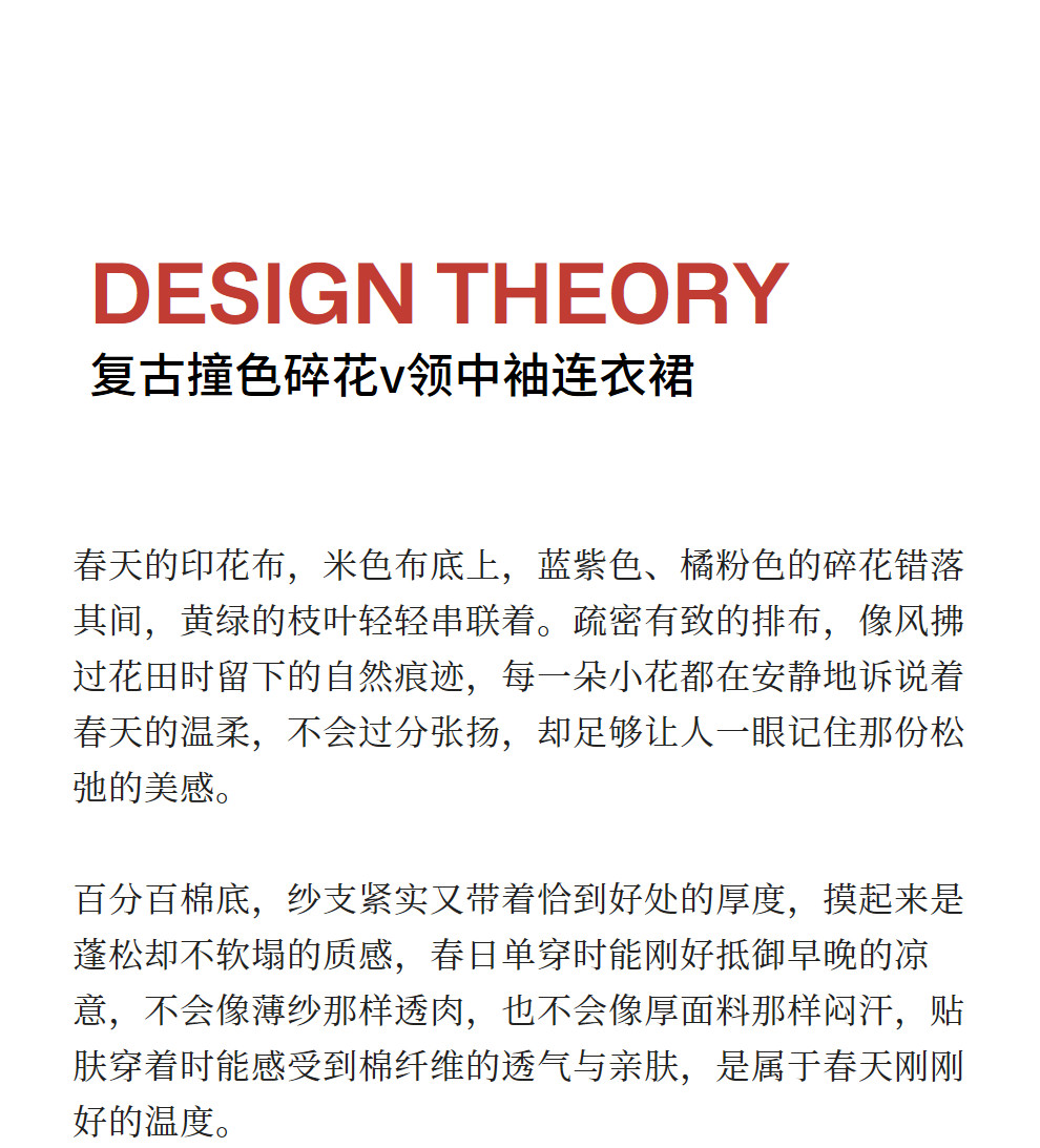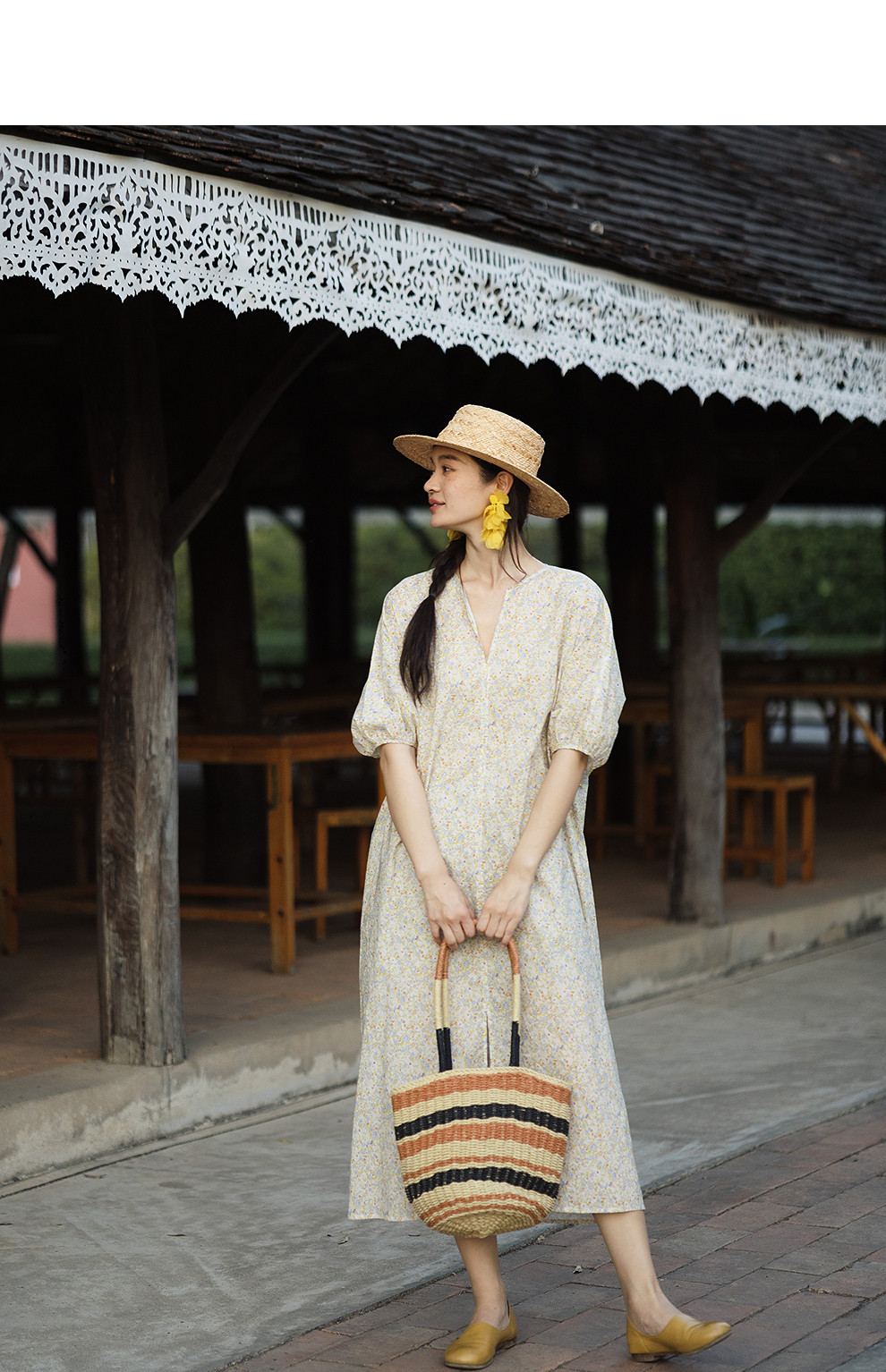 绽放164朵/纯棉复古撞色碎花v领中袖连衣裙松弛感宽松连身袖长裙