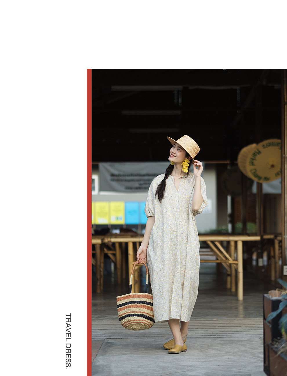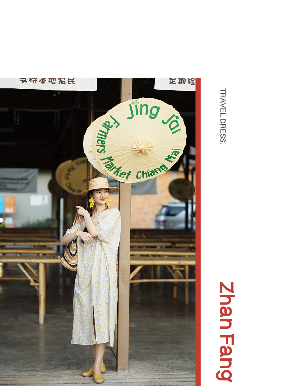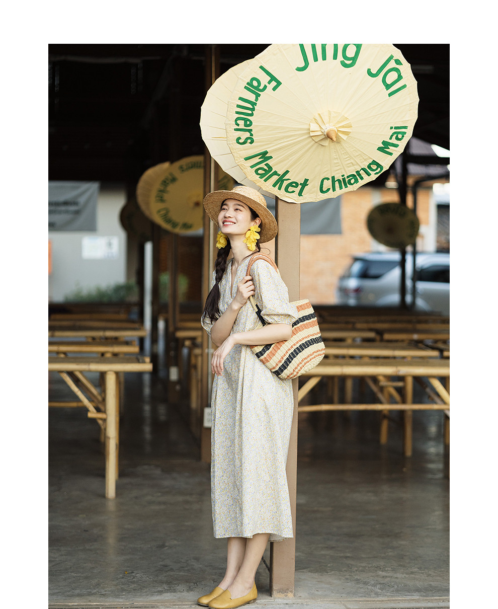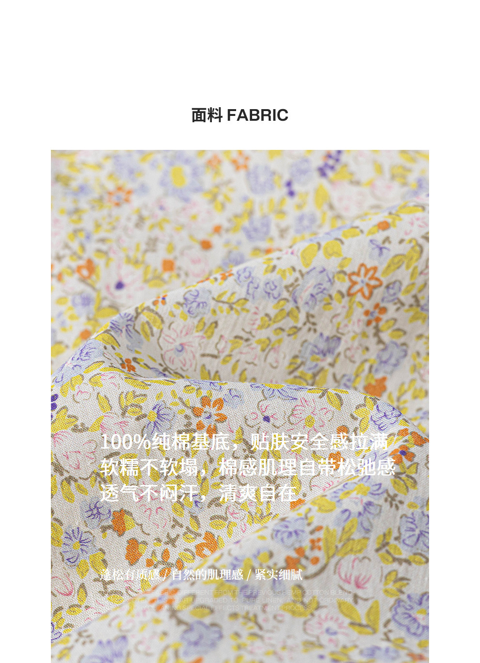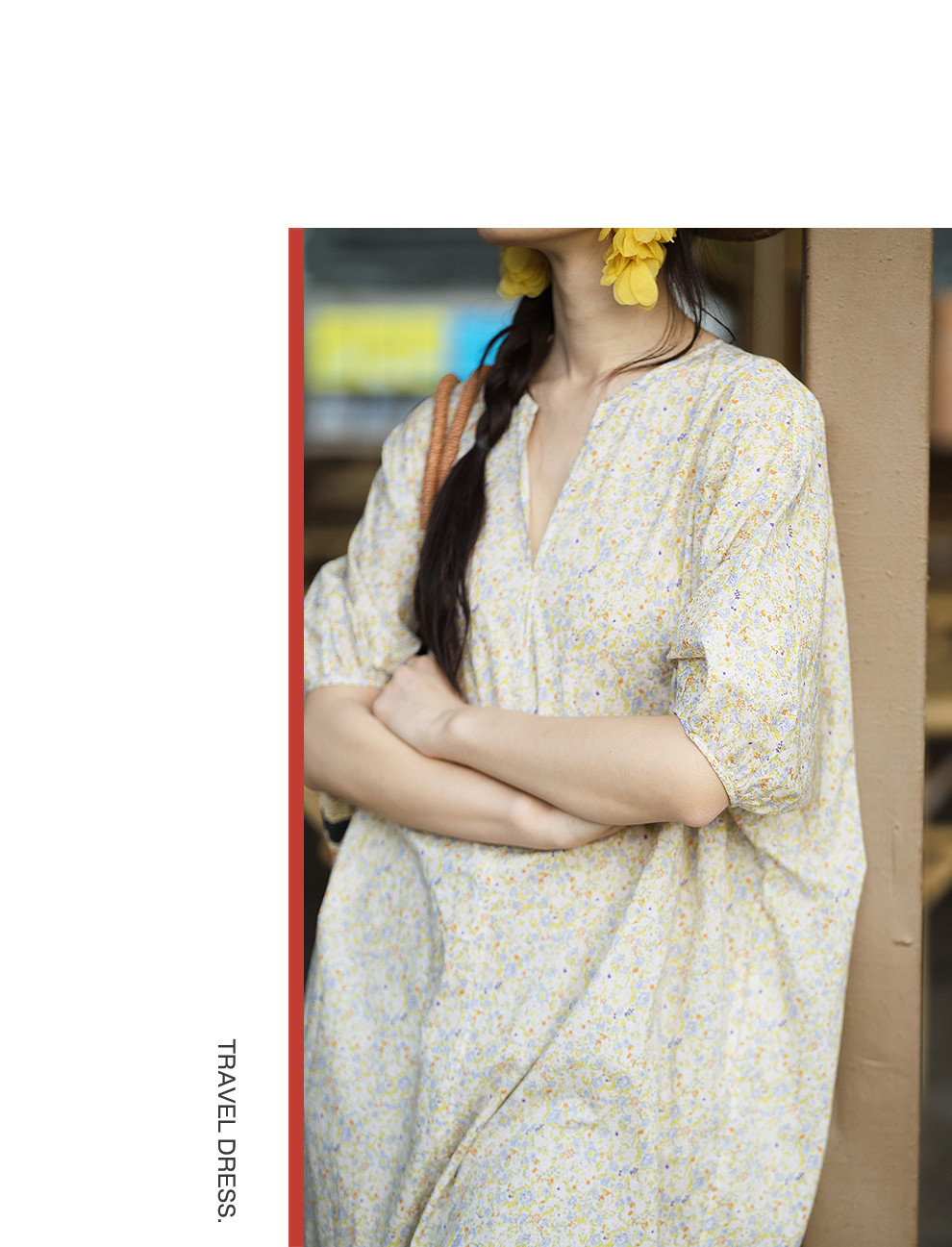 绽放164朵/纯棉复古撞色碎花v领中袖连衣裙松弛感宽松连身袖长裙