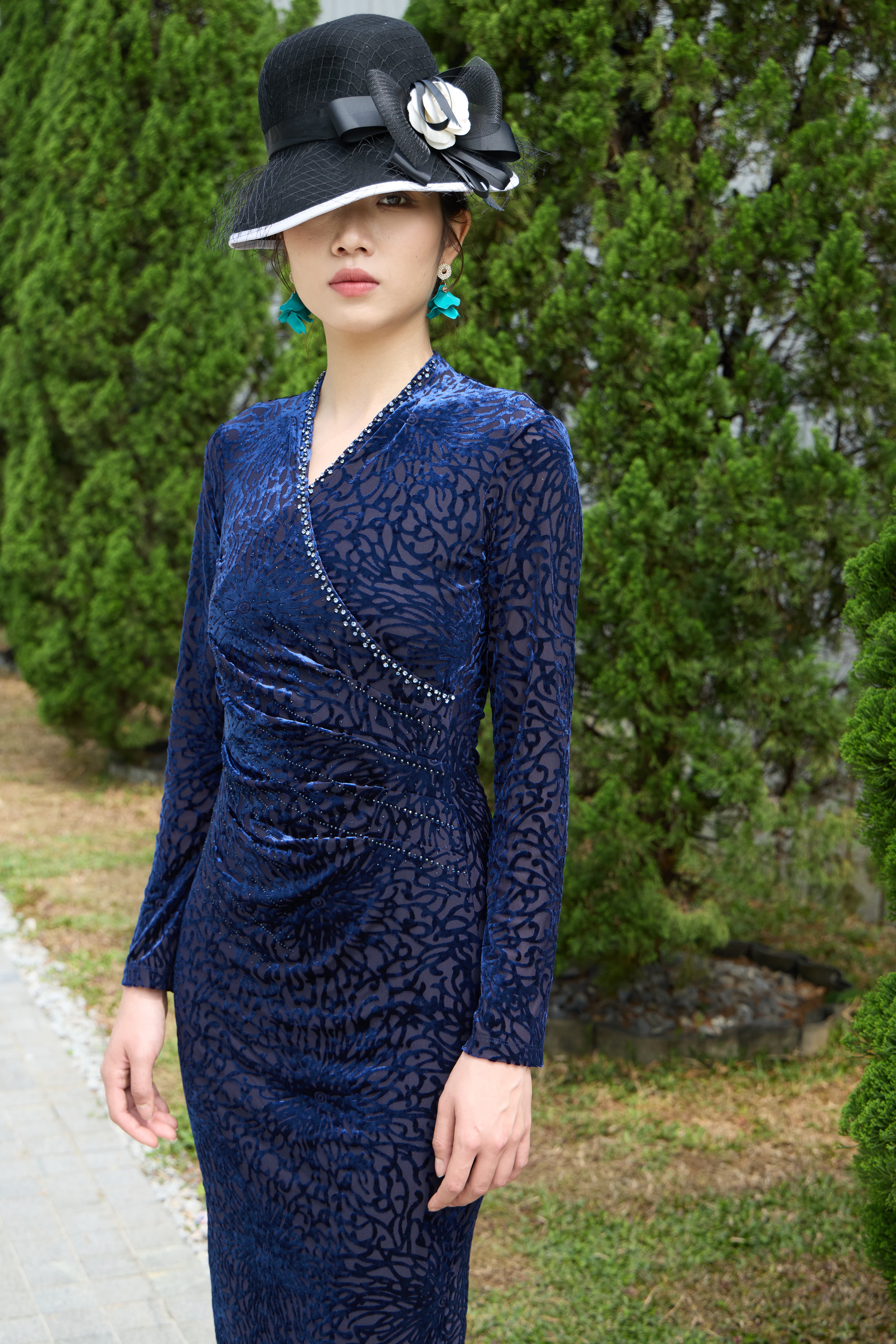 SZ1S56_帝释青色_、连衣裙_春季_V领交叉襟烫钻收腰褶皱丝绒提花_高级女装_BERNIEELEN 伯妮斯茵