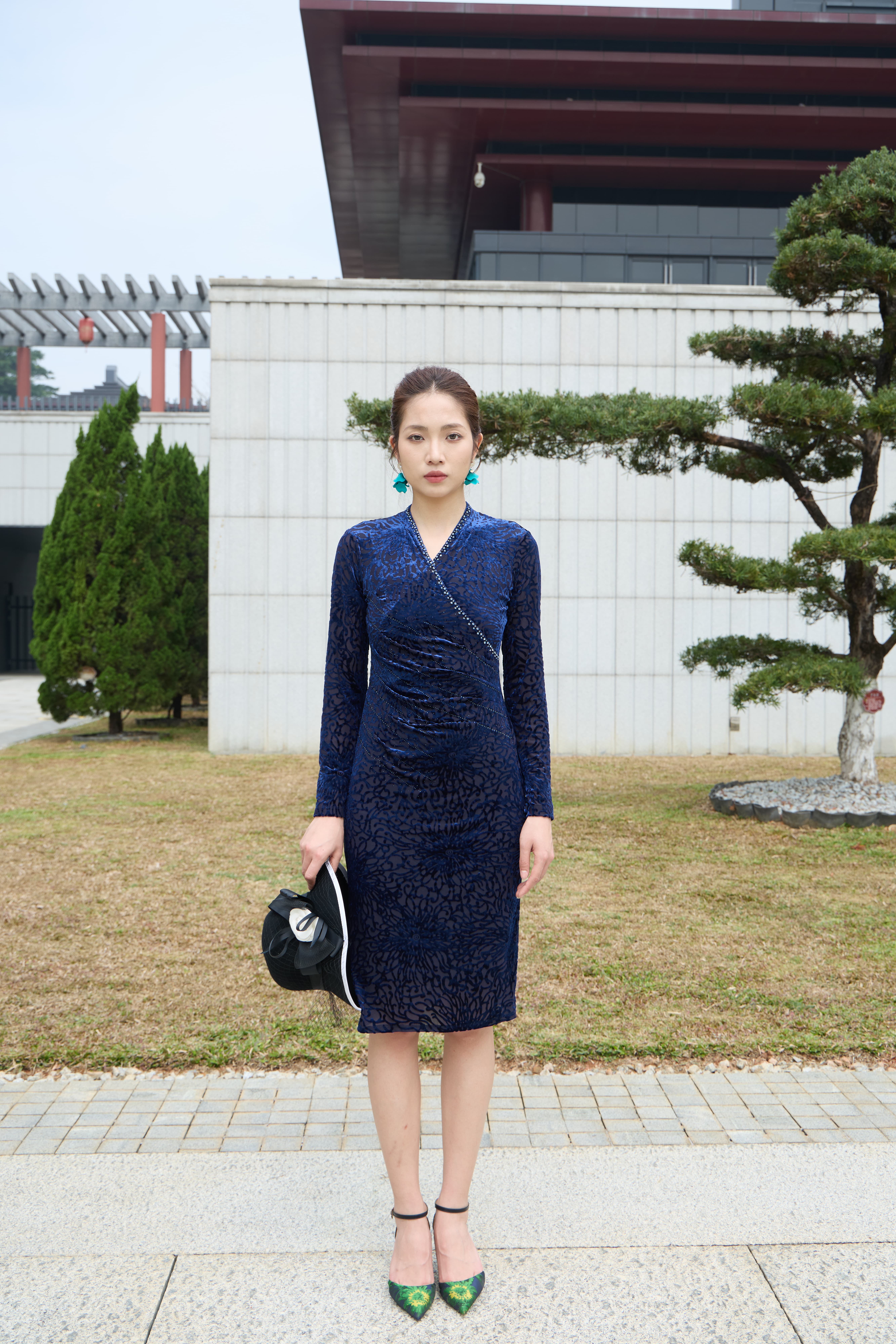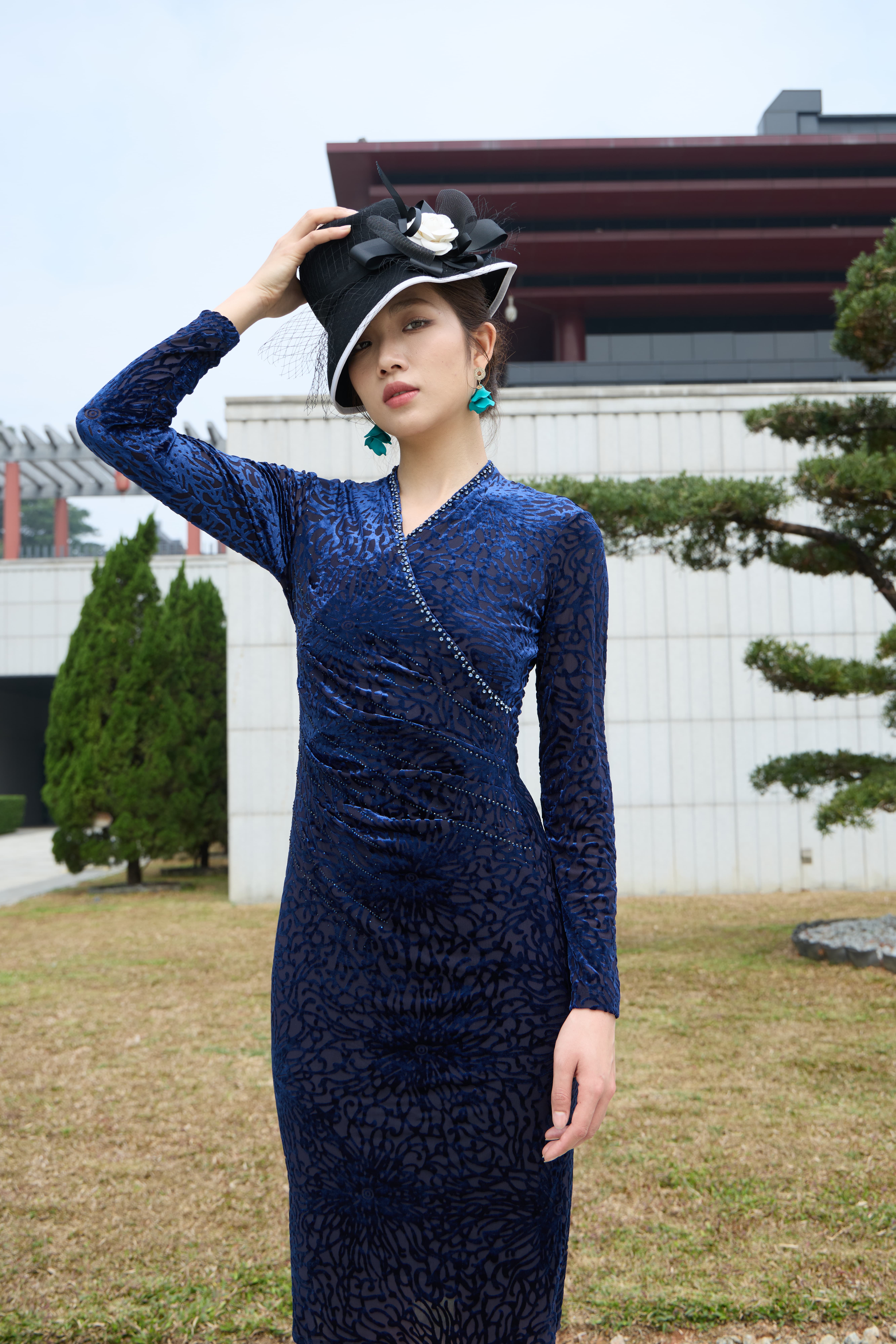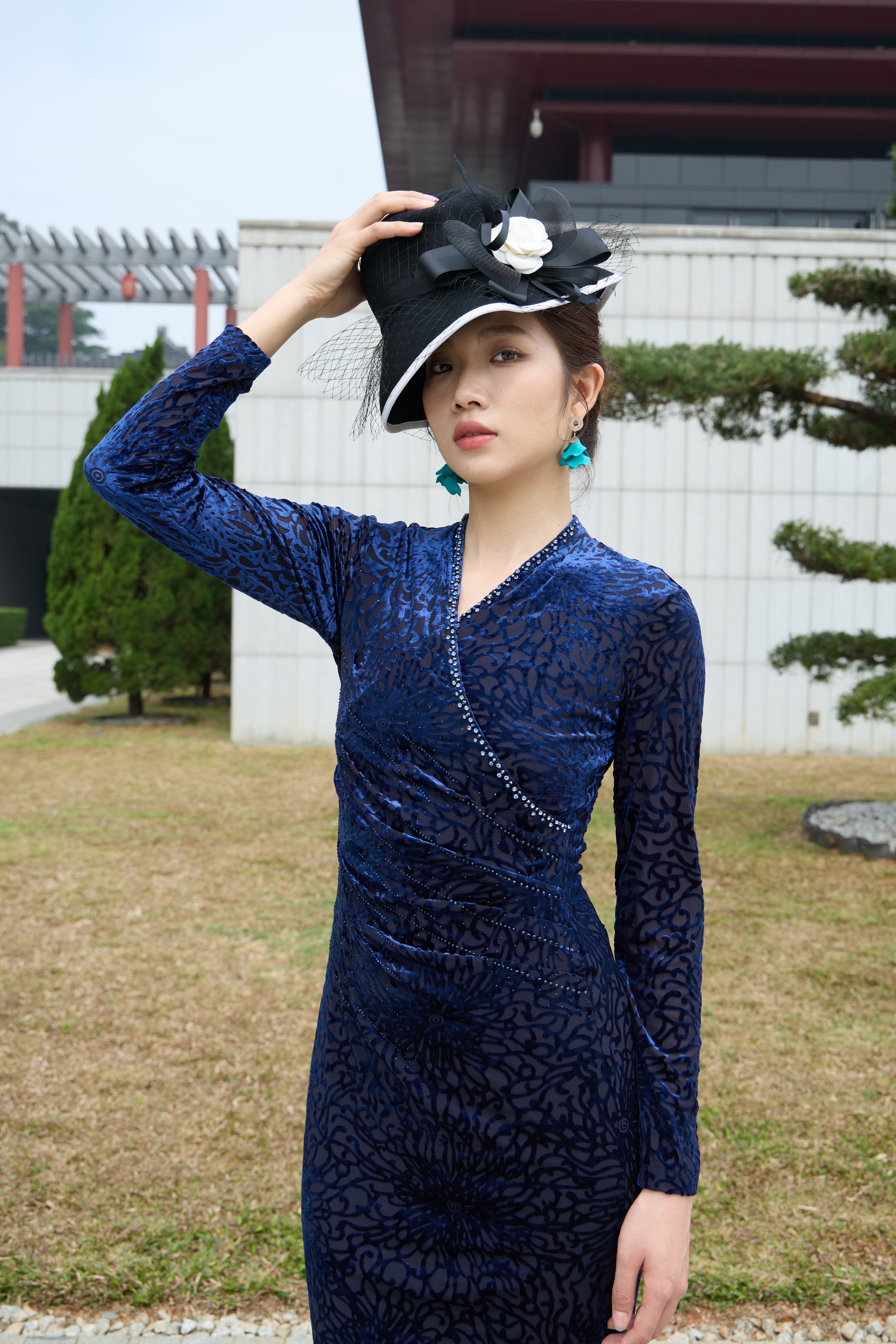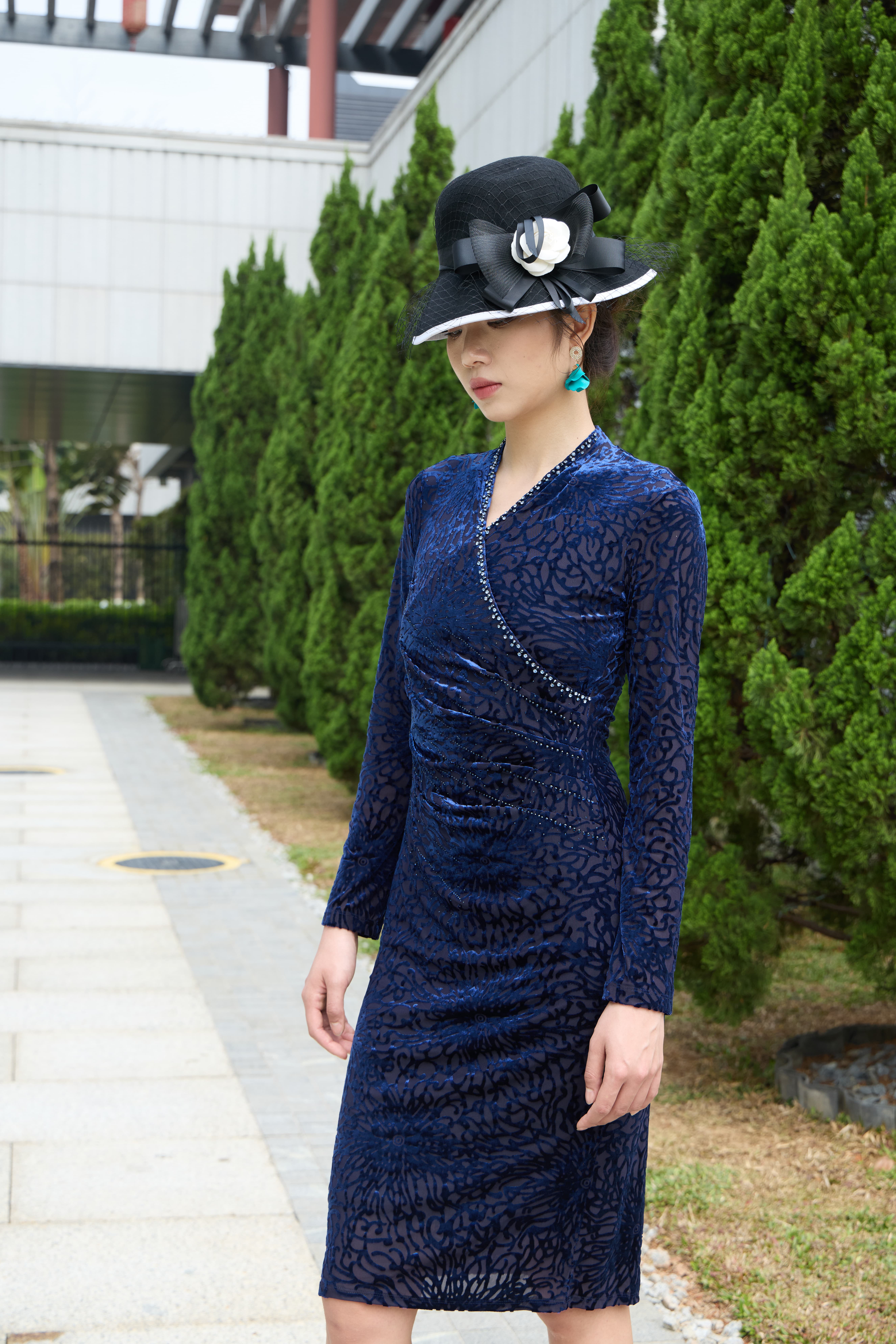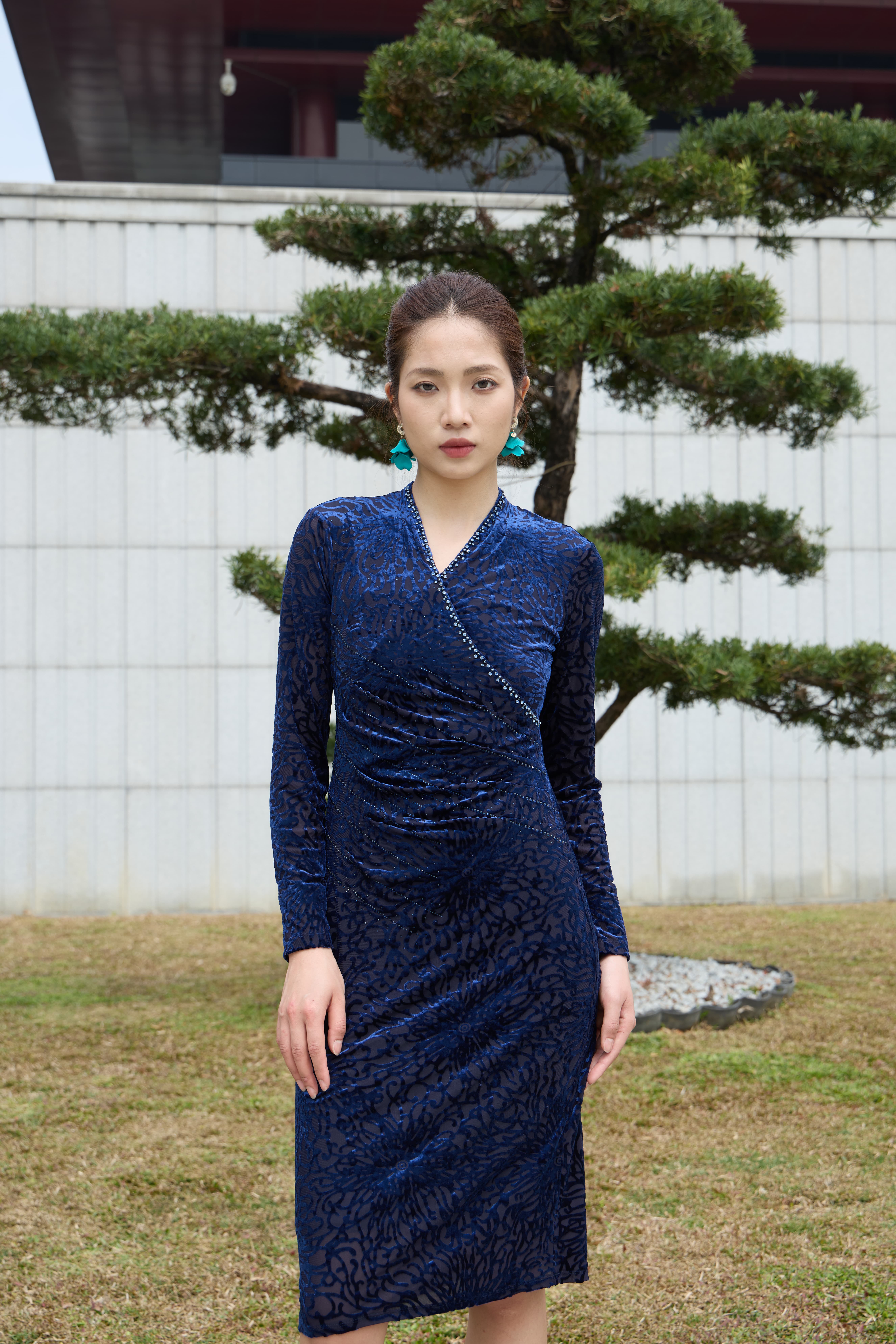 斜襟镶珠勾勒东方韵味,弹力剪裁塑出曼妙曲线,及膝长度优雅知性。