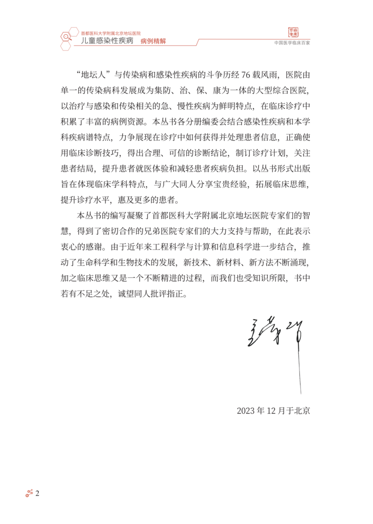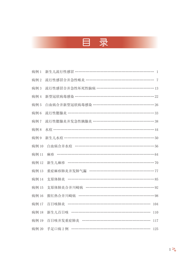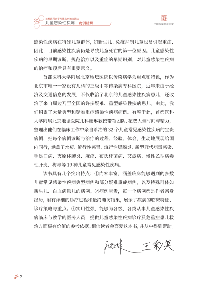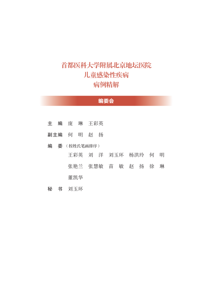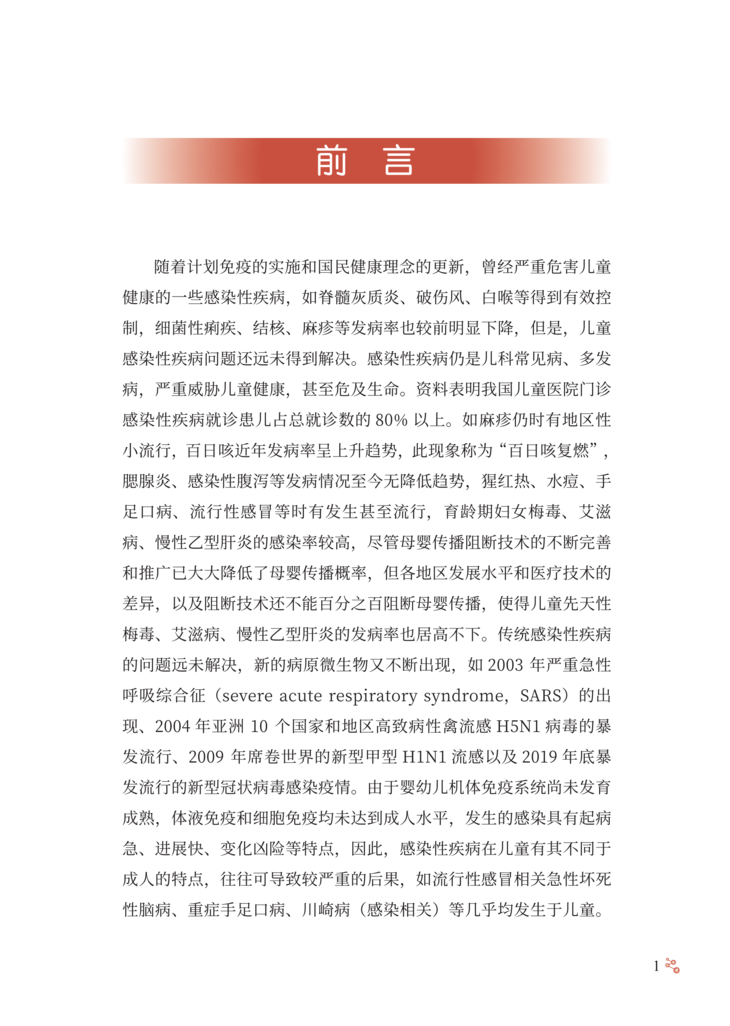 随着计划免疫的实施和国民健康理念的更新,曾经严重危害儿童 健康的一些感染性疾病,如脊髓灰质炎、破伤风、白喉等得到有效控 制,细菌性痢疾、结核、麻疹等发病率也较前明显下降,但是,儿童 感染性疾病问题还远未得到解决。感染性疾病仍是儿科常见病、多发 病,严重威胁儿童健康,甚至危及生命。资料表明我国儿童医院门诊 感染性疾病就诊患儿占总就诊数的 80% 以上。如麻疹仍时有地区性 小流行,百日咳近年发病率呈上升趋势,此现象称为“百日咳复燃”, 腮腺炎、感染性腹泻等发病情况至今无降低趋势,猩红热、水痘、手 足口病、流行性感冒等时有发生甚至流行,育龄期妇女梅毒、艾滋 病、慢性乙型肝炎的感染率较高,尽管母婴传播阻断技术的不断完善 和推广已大大降低了母婴传播概率,但各地区发展水平和医疗技术的 差异,以及阻断技术还不能百分之百阻断母婴传播,使得儿童先天性 梅毒、艾滋病、慢性乙型肝炎的发病率也居高不下。传统感染性疾病 的问题远未解决,新的病原微生物又不断出现,如 2003 年严重急性 呼吸综合征(severe acute respiratory syndrome,SARS)的出 现、2004 年亚洲 10 个国家和地区高致病性禽流感 H5N1 病毒的暴 发流行、2009 年席卷世界的新型甲型 H1N1 流感以及 2019 年底暴 发流行的新型冠状病毒感染疫情。由于婴幼儿机体免疫系统尚未发育 成熟,体液免疫和细胞免疫均未达到成人水平,发生的感染具有起病 急、进展快、变化凶险等特点,因此,感染性疾病在儿童有其不同于 成人的特点,往往可导致较严重的后果,如流行性感冒相关急性坏死 性脑病、重症手足口病、川崎病(感染相关)等几乎均发生于儿童。 感染性疾病在特殊儿童群体,如新生儿、免疫抑制儿童也易引起重症, 因此,目前感染性疾病仍是导致儿童死亡的第一位原因。儿童感染性 疾病的早期诊断、规范治疗以及重症的早期识别,对儿童感染性疾病 的治疗和预后具有重要意义。 首都医科大学附属北京地坛医院以传染病学为重点和特色,作为 北京市唯一一家设有儿科的三级甲等传染病专科医院,近年来由于经 济及交通信息的发展,不仅收治了北京的儿童感染性疾病患儿,还收 治了来自周边乃至全国的许多疑难、重型感染性疾病患儿。由此,我 们积累了大量典型和疑难重症感染性疾病病例。有鉴于此,首都医科 大学附属北京地坛医院儿科庞琳教授带领团队,花费大量时间与精力, 整理出他们在临床工作中亲自诊治的 32 个儿童常见感染性疾病的宝贵 病例,把每个病例诊断与治疗的过程、经验、体会,生动地展现给国 内同行,涵盖了水痘、流行性感冒、流行性腮腺炎、新型冠状病毒感染、 手足口病、支原体肺炎、麻疹、布氏杆菌病、艾滋病、慢性乙型病毒 性肝炎、梅毒等 19 种儿童常见感染性疾病。 该书具有几个突出特点:①内容丰富,涵盖临床能够遇到的多数 儿童常见感染性疾病典型病例和部分疑难重症病例,以及特殊群体如 新生儿、白血病患儿的病例。②病例宝贵,每一个病例都是作者亲身 经历,附有详细的诊疗过程和最终随访结果,展示了疾病的临床特征、 诊疗策略与重点。③实用性强,能够为各级、各类从事儿童感染性疾 病临床与教学的医务人员,提供儿童感染性疾病诊疗及危重症患儿救 治方面极有价值的参考依据。相信读者会喜爱这本书,并从中得到帮助。