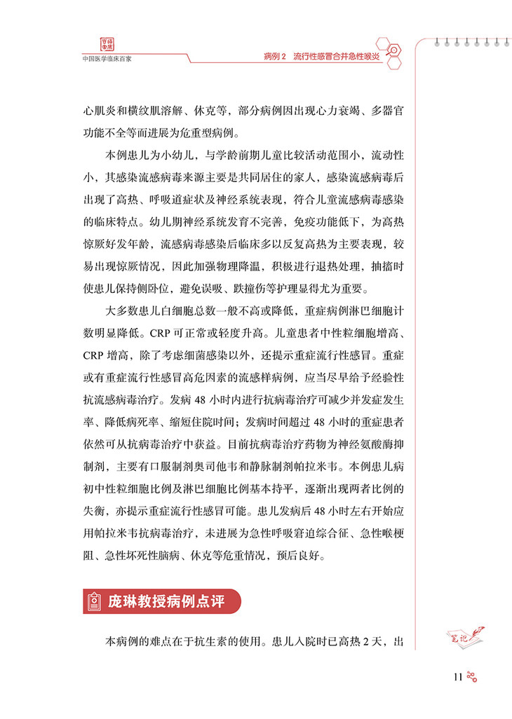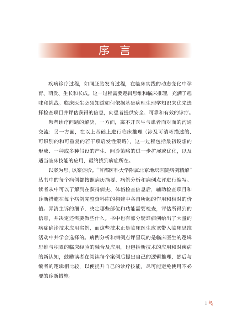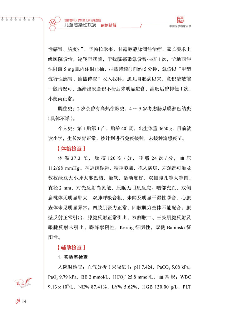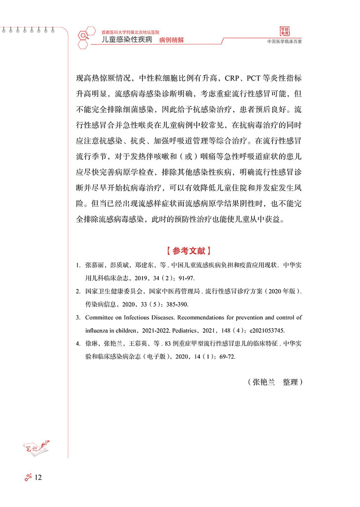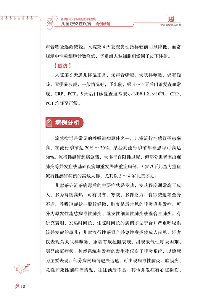 随着计划免疫的实施和国民健康理念的更新,曾经严重危害儿童 健康的一些感染性疾病,如脊髓灰质炎、破伤风、白喉等得到有效控 制,细菌性痢疾、结核、麻疹等发病率也较前明显下降,但是,儿童 感染性疾病问题还远未得到解决。感染性疾病仍是儿科常见病、多发 病,严重威胁儿童健康,甚至危及生命。资料表明我国儿童医院门诊 感染性疾病就诊患儿占总就诊数的 80% 以上。如麻疹仍时有地区性 小流行,百日咳近年发病率呈上升趋势,此现象称为“百日咳复燃”, 腮腺炎、感染性腹泻等发病情况至今无降低趋势,猩红热、水痘、手 足口病、流行性感冒等时有发生甚至流行,育龄期妇女梅毒、艾滋 病、慢性乙型肝炎的感染率较高,尽管母婴传播阻断技术的不断完善 和推广已大大降低了母婴传播概率,但各地区发展水平和医疗技术的 差异,以及阻断技术还不能百分之百阻断母婴传播,使得儿童先天性 梅毒、艾滋病、慢性乙型肝炎的发病率也居高不下。传统感染性疾病 的问题远未解决,新的病原微生物又不断出现,如 2003 年严重急性 呼吸综合征(severe acute respiratory syndrome,SARS)的出 现、2004 年亚洲 10 个国家和地区高致病性禽流感 H5N1 病毒的暴 发流行、2009 年席卷世界的新型甲型 H1N1 流感以及 2019 年底暴 发流行的新型冠状病毒感染疫情。由于婴幼儿机体免疫系统尚未发育 成熟,体液免疫和细胞免疫均未达到成人水平,发生的感染具有起病 急、进展快、变化凶险等特点,因此,感染性疾病在儿童有其不同于 成人的特点,往往可导致较严重的后果,如流行性感冒相关急性坏死 性脑病、重症手足口病、川崎病(感染相关)等几乎均发生于儿童。 感染性疾病在特殊儿童群体,如新生儿、免疫抑制儿童也易引起重症, 因此,目前感染性疾病仍是导致儿童死亡的第一位原因。儿童感染性 疾病的早期诊断、规范治疗以及重症的早期识别,对儿童感染性疾病 的治疗和预后具有重要意义。 首都医科大学附属北京地坛医院以传染病学为重点和特色,作为 北京市唯一一家设有儿科的三级甲等传染病专科医院,近年来由于经 济及交通信息的发展,不仅收治了北京的儿童感染性疾病患儿,还收 治了来自周边乃至全国的许多疑难、重型感染性疾病患儿。由此,我 们积累了大量典型和疑难重症感染性疾病病例。有鉴于此,首都医科 大学附属北京地坛医院儿科庞琳教授带领团队,花费大量时间与精力, 整理出他们在临床工作中亲自诊治的 32 个儿童常见感染性疾病的宝贵 病例,把每个病例诊断与治疗的过程、经验、体会,生动地展现给国 内同行,涵盖了水痘、流行性感冒、流行性腮腺炎、新型冠状病毒感染、 手足口病、支原体肺炎、麻疹、布氏杆菌病、艾滋病、慢性乙型病毒 性肝炎、梅毒等 19 种儿童常见感染性疾病。 该书具有几个突出特点:①内容丰富,涵盖临床能够遇到的多数 儿童常见感染性疾病典型病例和部分疑难重症病例,以及特殊群体如 新生儿、白血病患儿的病例。②病例宝贵,每一个病例都是作者亲身 经历,附有详细的诊疗过程和最终随访结果,展示了疾病的临床特征、 诊疗策略与重点。③实用性强,能够为各级、各类从事儿童感染性疾 病临床与教学的医务人员,提供儿童感染性疾病诊疗及危重症患儿救 治方面极有价值的参考依据。相信读者会喜爱这本书,并从中得到帮助。