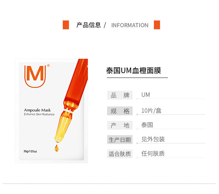 〖泰国〗进口UM血橙面膜补水保湿舒缓肌肤收缩毛孔熬夜急救面膜10片装