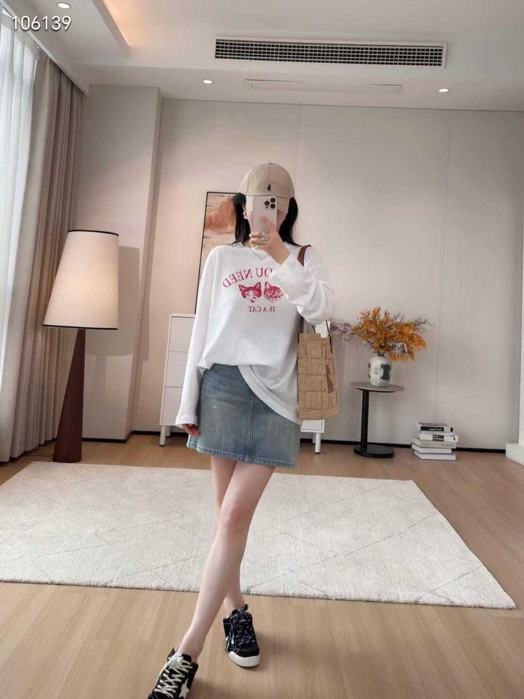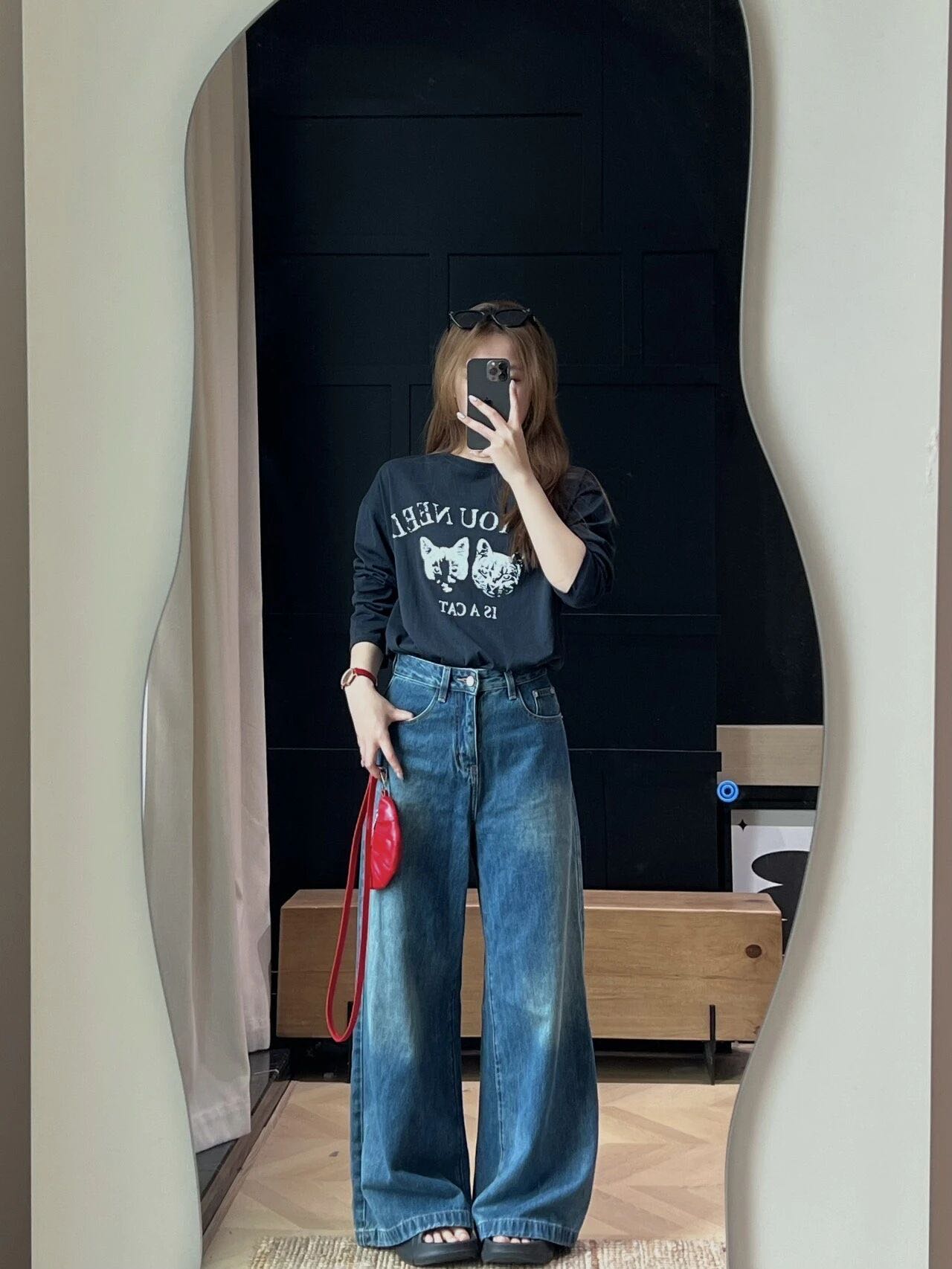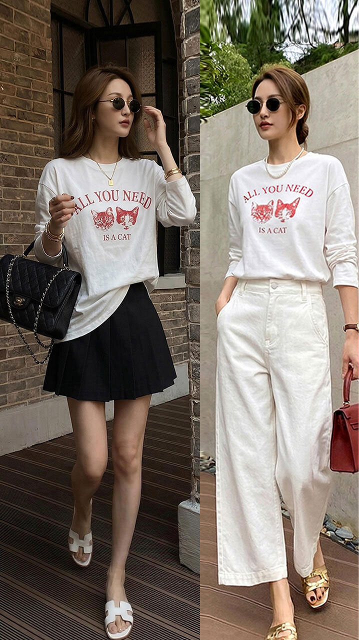 宽松的直身版型,适度的衣身空间,上身遮肉不拖沓圆领领型风格随性休闲,对各种脸型的包容度也很好。