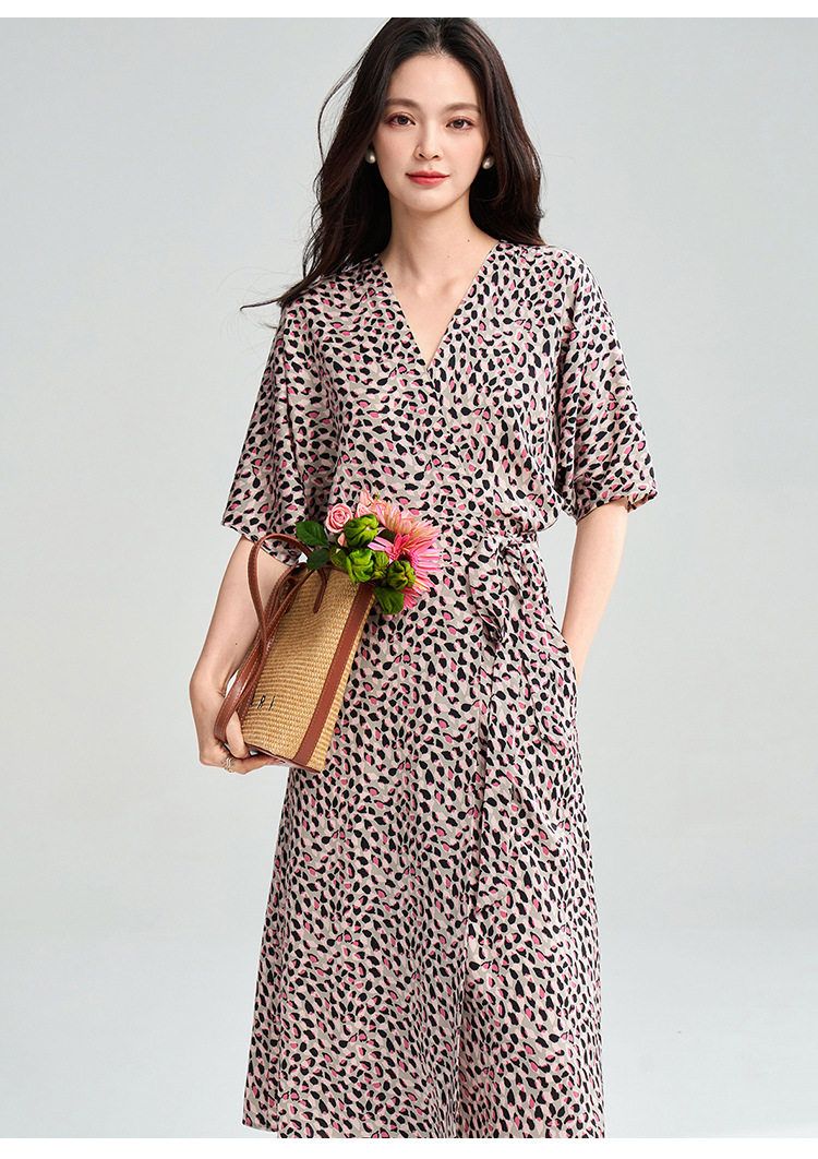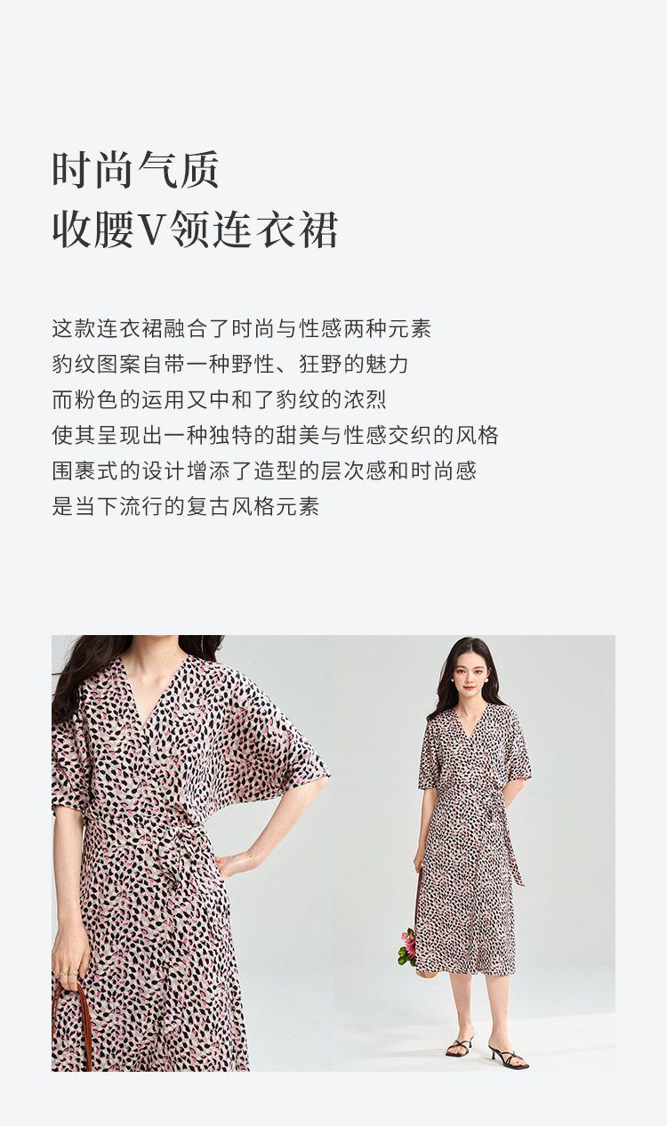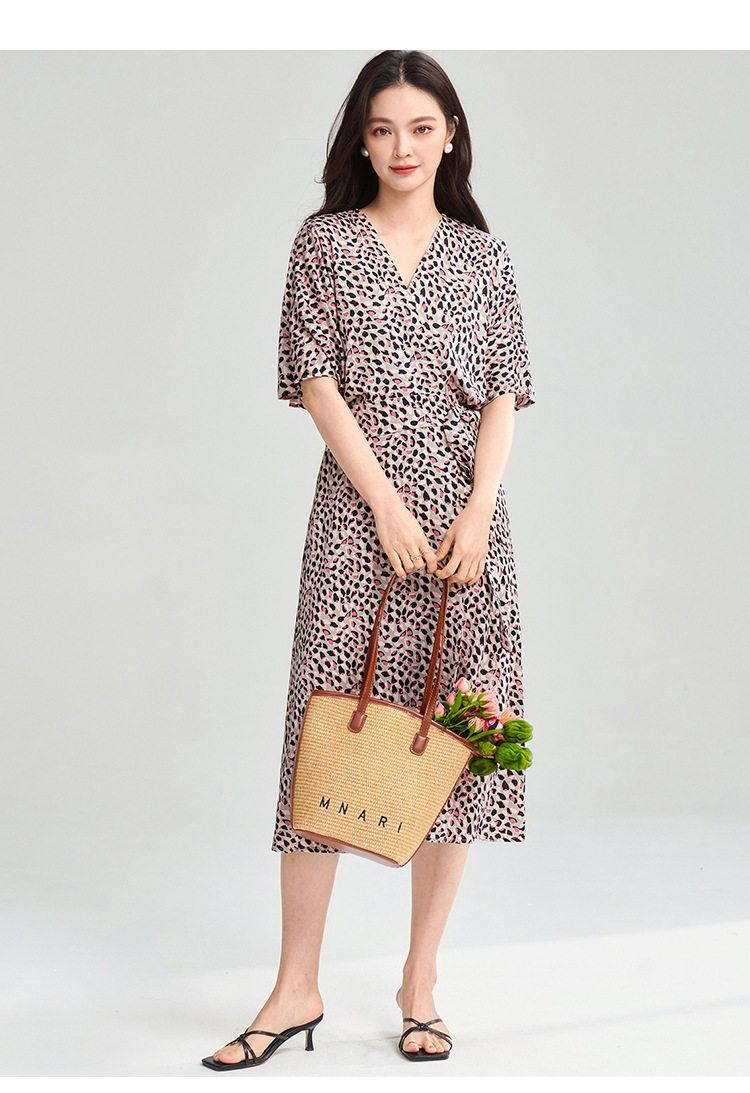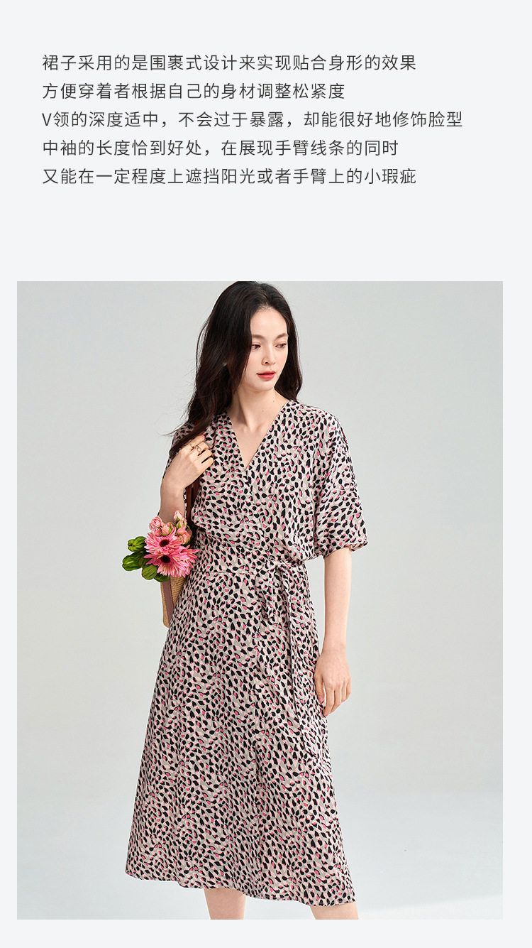 25夏季时尚气质粉色豹纹印花茶歇裙V领收腰一片式围裹连衣裙25088