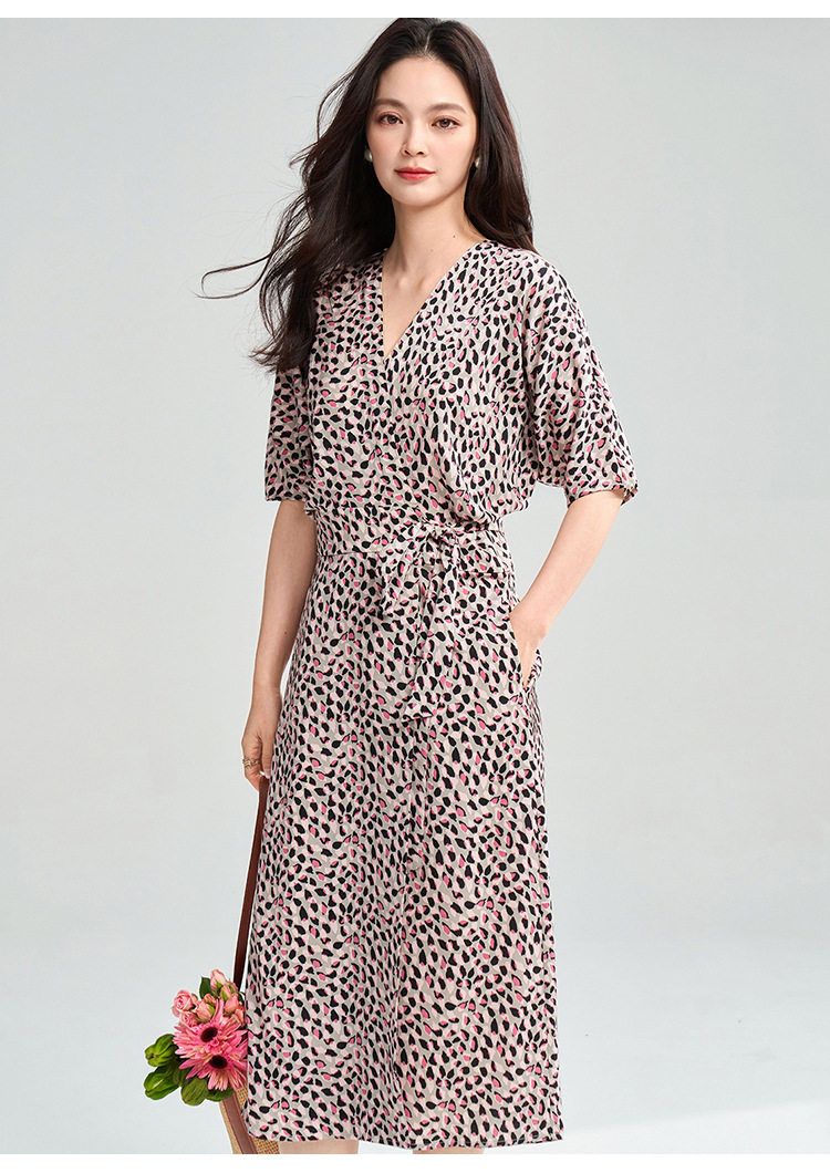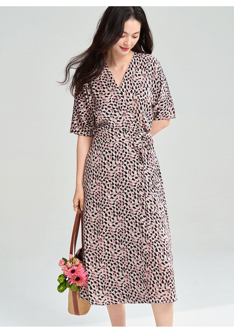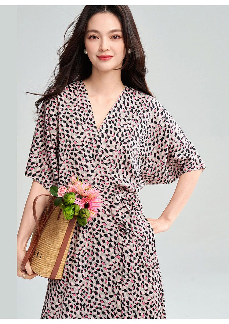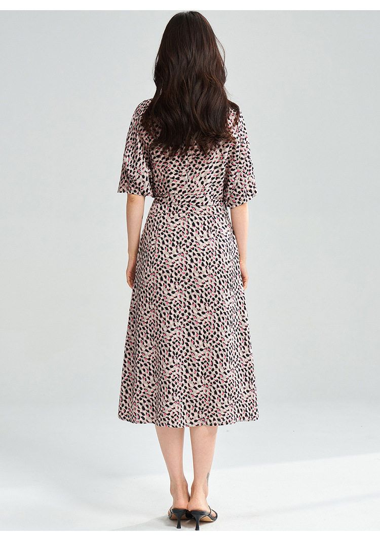 25夏季时尚气质粉色豹纹印花茶歇裙V领收腰一片式围裹连衣裙25088