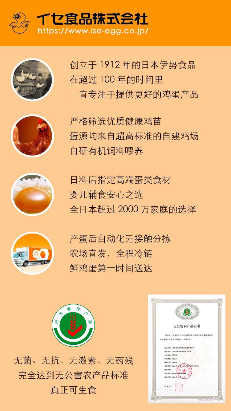 ISE egg Japan,是全日本销量最大的鸡蛋品牌,超过2000万日本家庭选择伊势;也是北美畅销的鸡蛋品牌;并在全球超过17个国家建有农场。