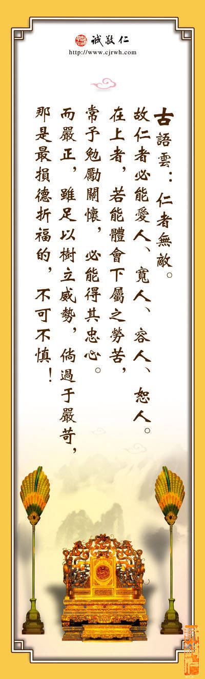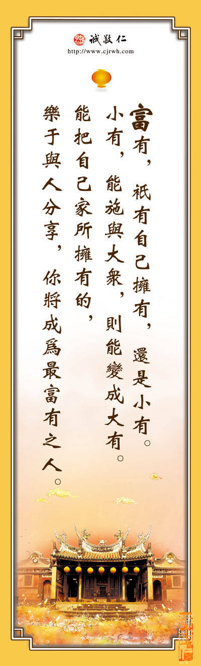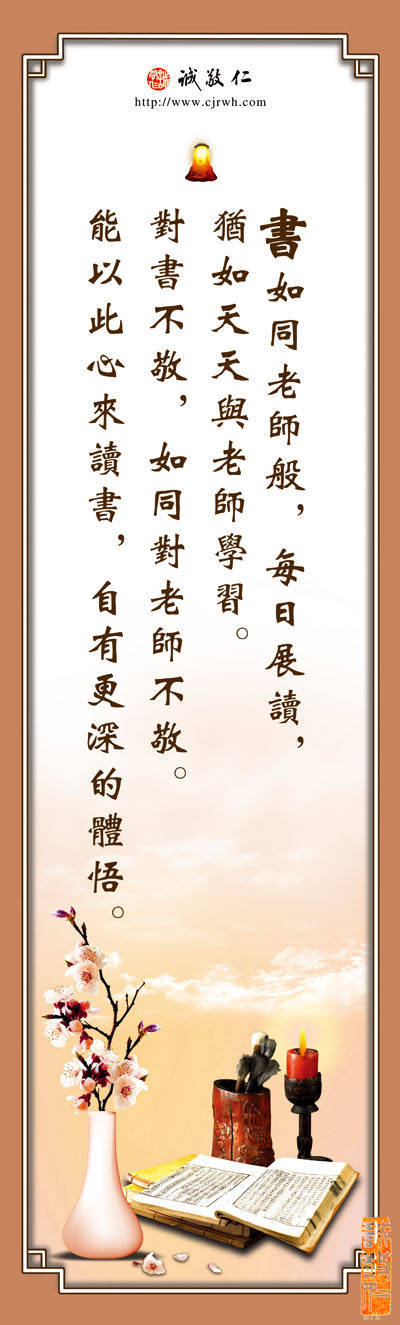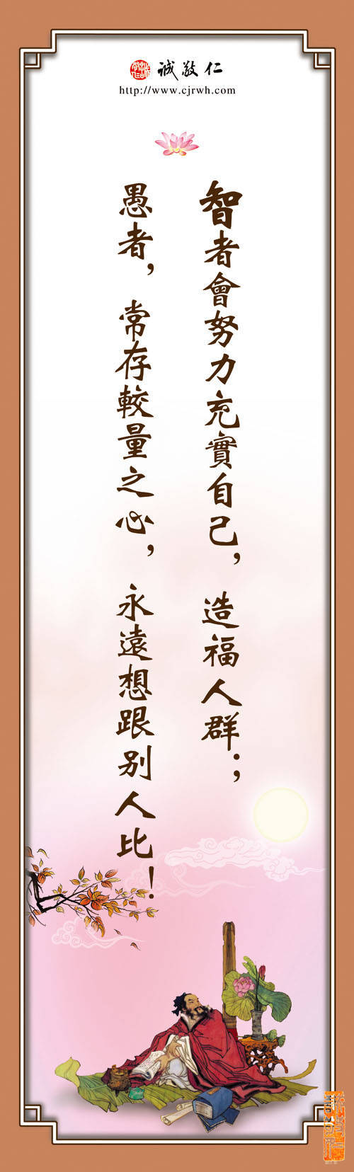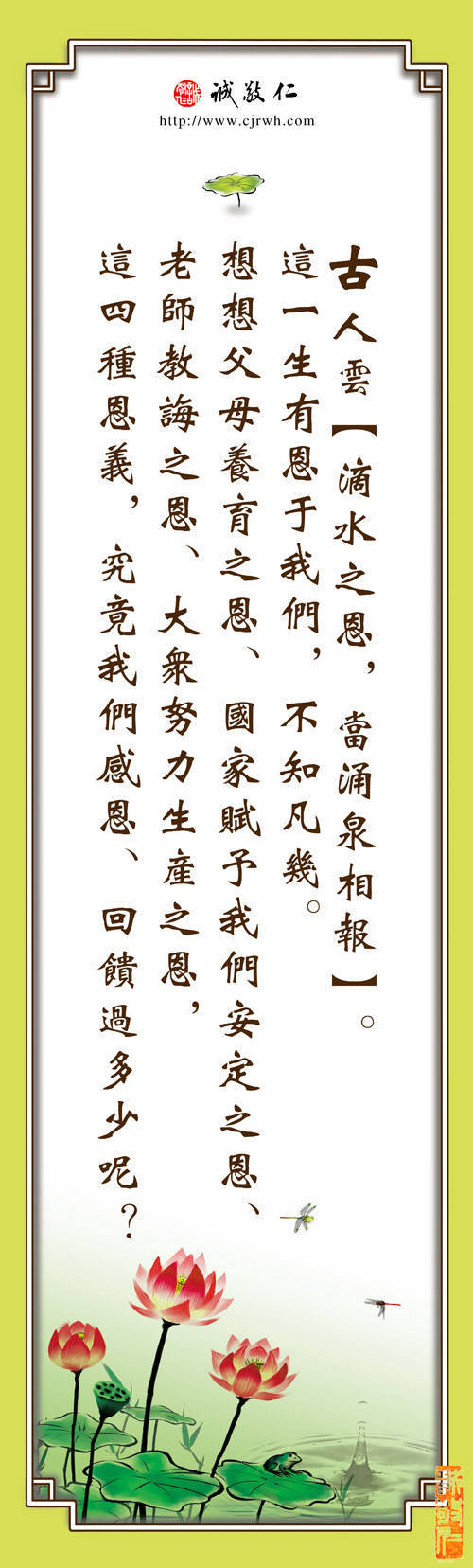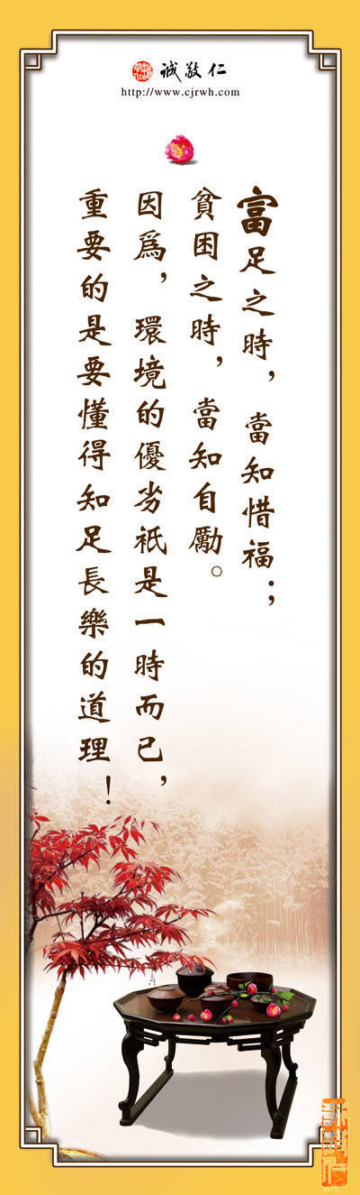 【基本信息】: 产品材质:高清写真印刷 产品规格:45*150cm 一套20幅 各不相同 精心编辑印制,适用于传统文化论坛、学校、办公室、家庭 【产品文化】: 1、尽心竭力孝父母,孝亲亲责莫回言。诸事不顺因不孝,怎知孝能感动天。 2、古人云:“滴水之恩当涌泉相报”,这一生有恩于我们,不知凡几。想想父母养育之恩、国家赋予我们安定之恩、老师教诲之恩、大众努力生产之恩,这四种恩义,究竟我们感恩回馈多少呢? 3、志于道 据于德 依于仁 游于艺 4、富足之时,当知惜福;贫困之时,当知自励。因为,环境的优劣只是一时而已,重要的是要懂得知足长乐的道理! 5、尽古人云:仁者无敌。故仁者必能爱人、宽人、容人、恕人。在上者,若能体会下属之劳苦,常予勉励关怀,必能得其忠心。而严正,虽足以树立威势,倘过于严苛,那是损德折福的,不可不慎。 6、健康十训:少肉多菜 少盐多醋 少糖多果 少食多嚼 少衣多浴 少车多行 少忧多眠 少怒多笑 少言多行 少欲多施 7、当别人对我不好时,是否曾想过,我亦曾欺负、刻薄于人。同样的道理,在面对委屈、受辱之时,只有能完全放下怨恨的人,才能从中体悟包容宽恕的伟大! 8、人一能之,已百之。人十能之,已千之。果能此道者,虽愚必明,虽柔必强。 9、一个人的福分就在一言一行中积累形成。能掌握情绪,才能掌握命运的未来。人生的福是知恩报恩,人生的折福是忘恩负义。 10、智者会努力充实自己,造福人群;愚者,常存较量之心,永远想跟别人比! 11、勇于认错,承担责任,并非懦弱。直不认错,不敢面对现实,才是弱者。 12、六大长寿秘诀:一、性格乐观,笑口常开 二、起居有规律,睡眠质量好 三、饮食有节,不挑食 四、喜欢劳作,闲不住 五、爱干净,讲卫生 六、子女孝顺,生活无忧 13、富有,只有自己拥有,还是小有。小有,能施与大众,则能变成大有,能把自己家所拥有的,乐于与人分享,你将成为富有之人。 14、奢华长养欲望。若平素能少欲知足,那么名利当头也会如如不为所动。 15、生财有大道,生之者众,食之者寡,为之者疾,用之者舒,则财恒足矣。 16、书如同老师般,每日晨读,犹如天天与老师学习。对书不敬,如同对老师不敬。能以此心来读书,自有更深的体悟。 17、健康八宝:起得早 睡得好 七成饱 多跑跑 多笑笑 莫烦恼 天天忙 永不老 18、有德此有人,有人此有土,有土此有财,有财此有用。 19、君子九思,视思明,听思聪,色思温,貌思恭,言思忠,事思敬,疑思问,忿思难,见得思义。 20、想想父母自小养我、育我、抚我、顾我,不计一切拉拔我长大。那么理所应当我们也应该怀有感恩孝顺的反哺之情。而孝养父母更不分富贵贫贱,人人皆能为之,怕的是没有那份孝心罢了! |