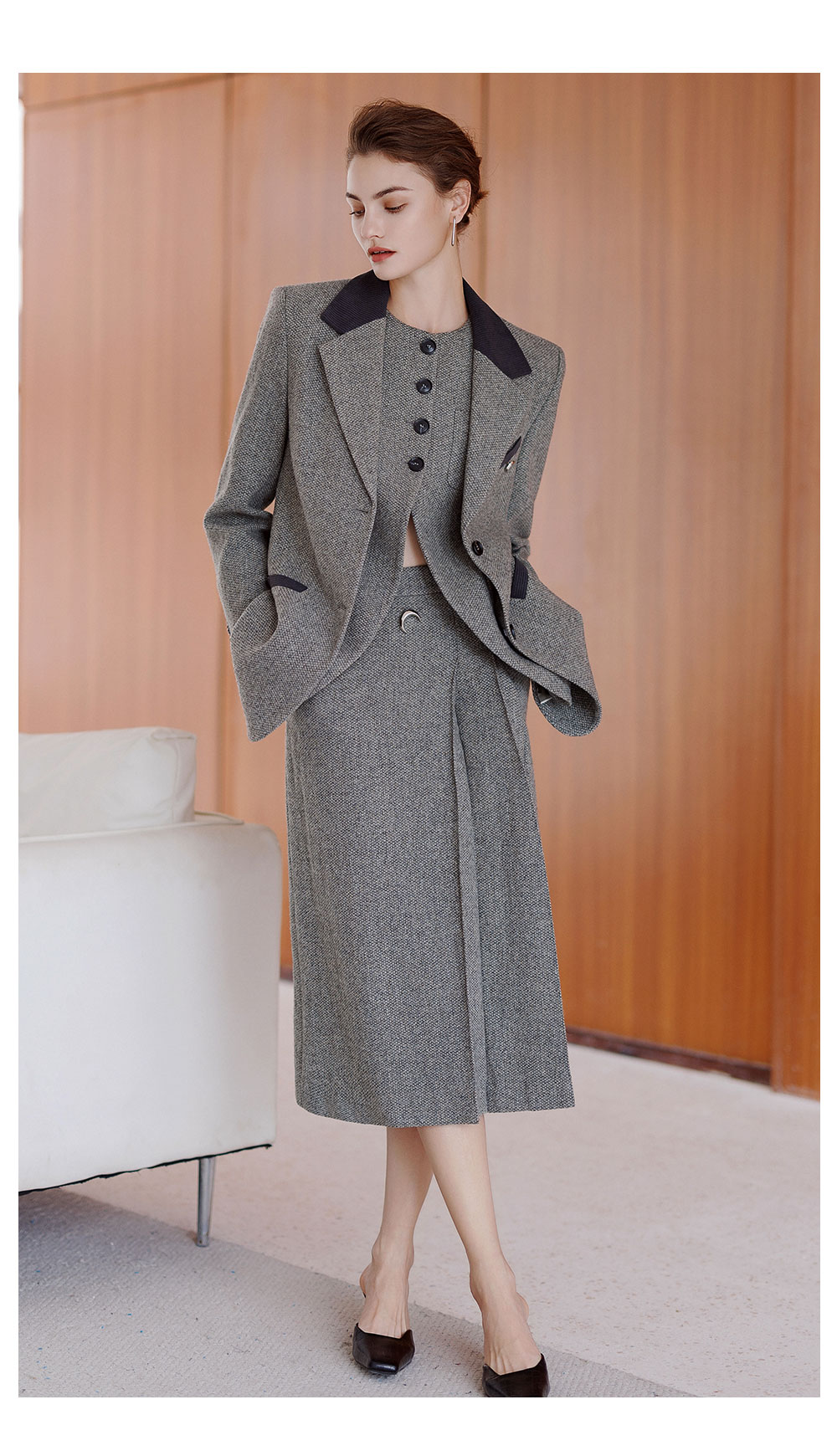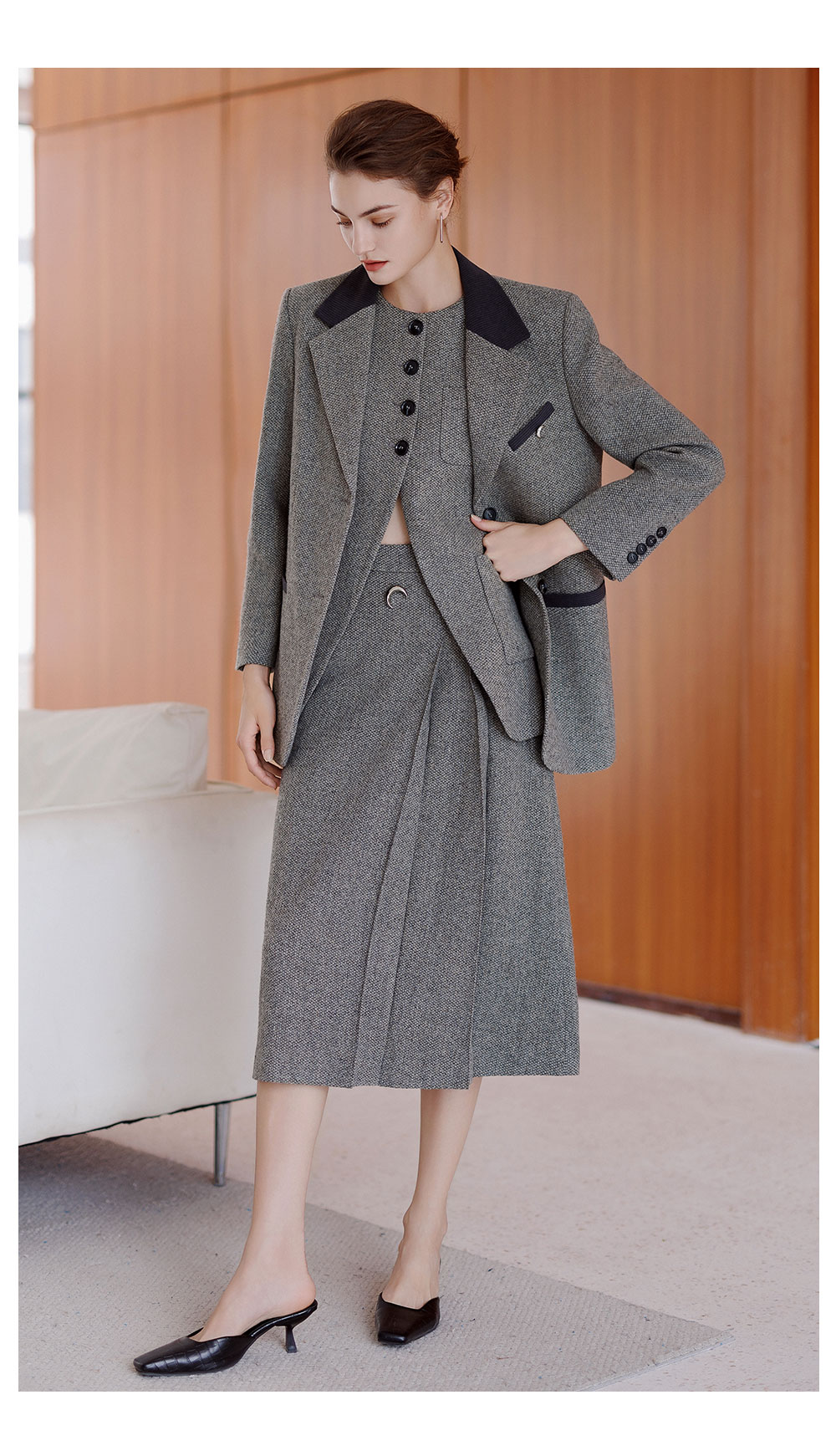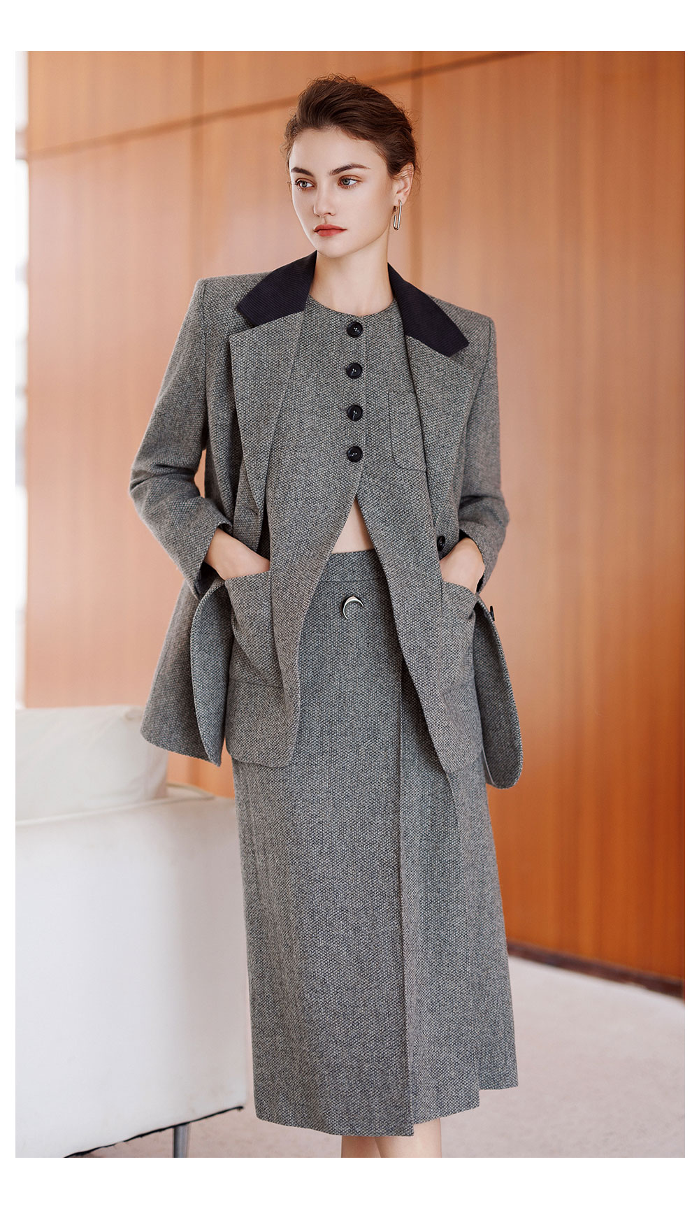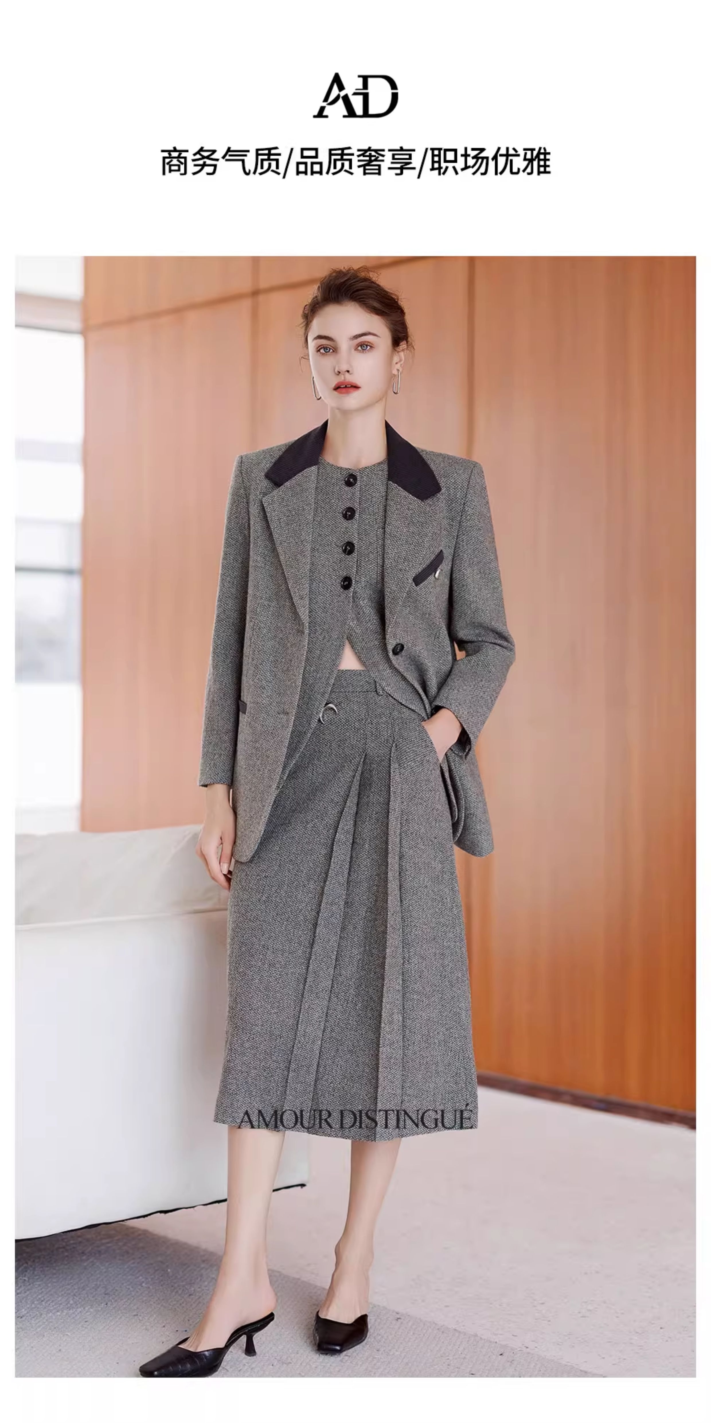 AD灰色格纹肌理感西装三件套女2025新款秋冬羊毛小香风外套半身裙