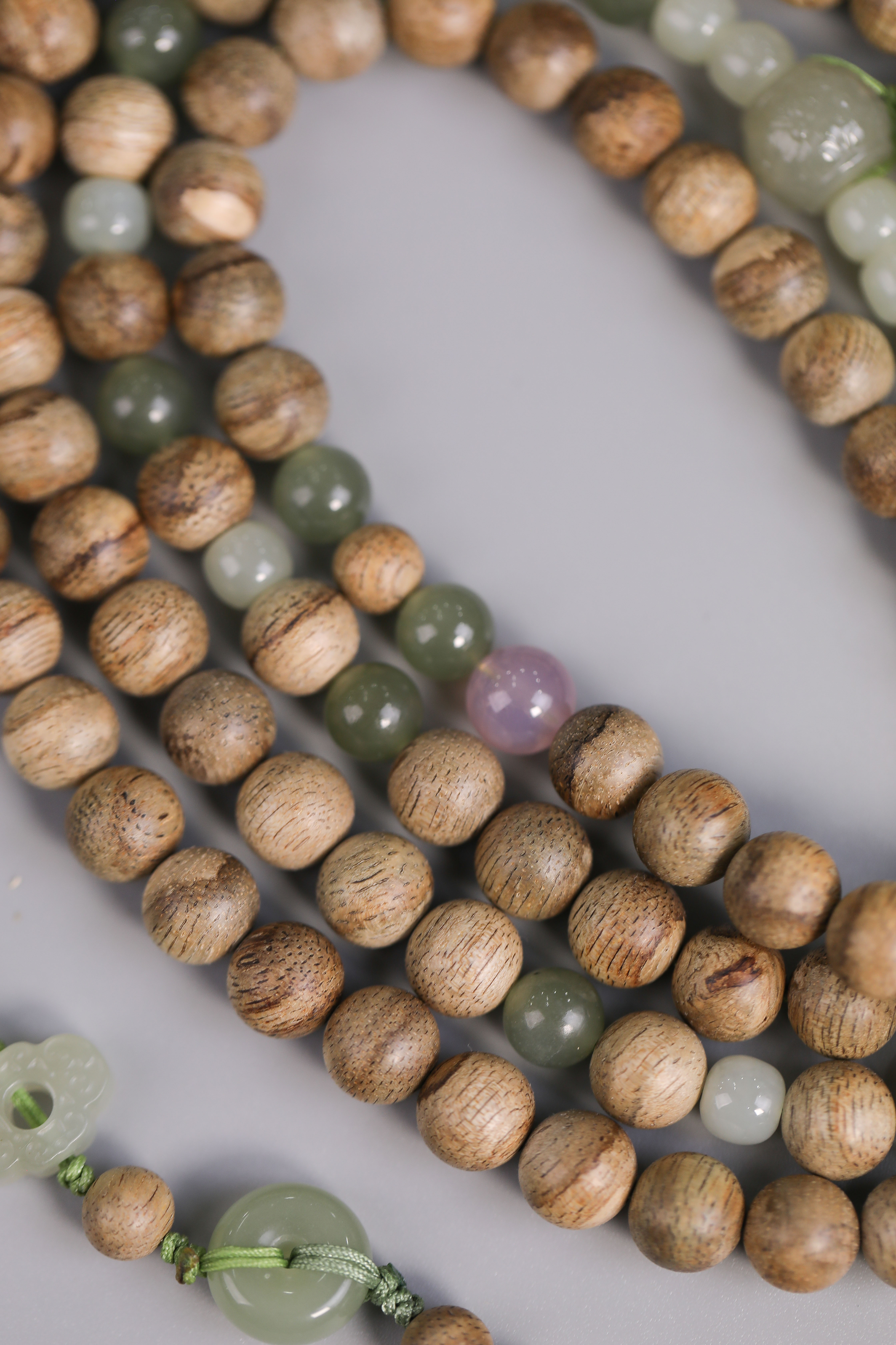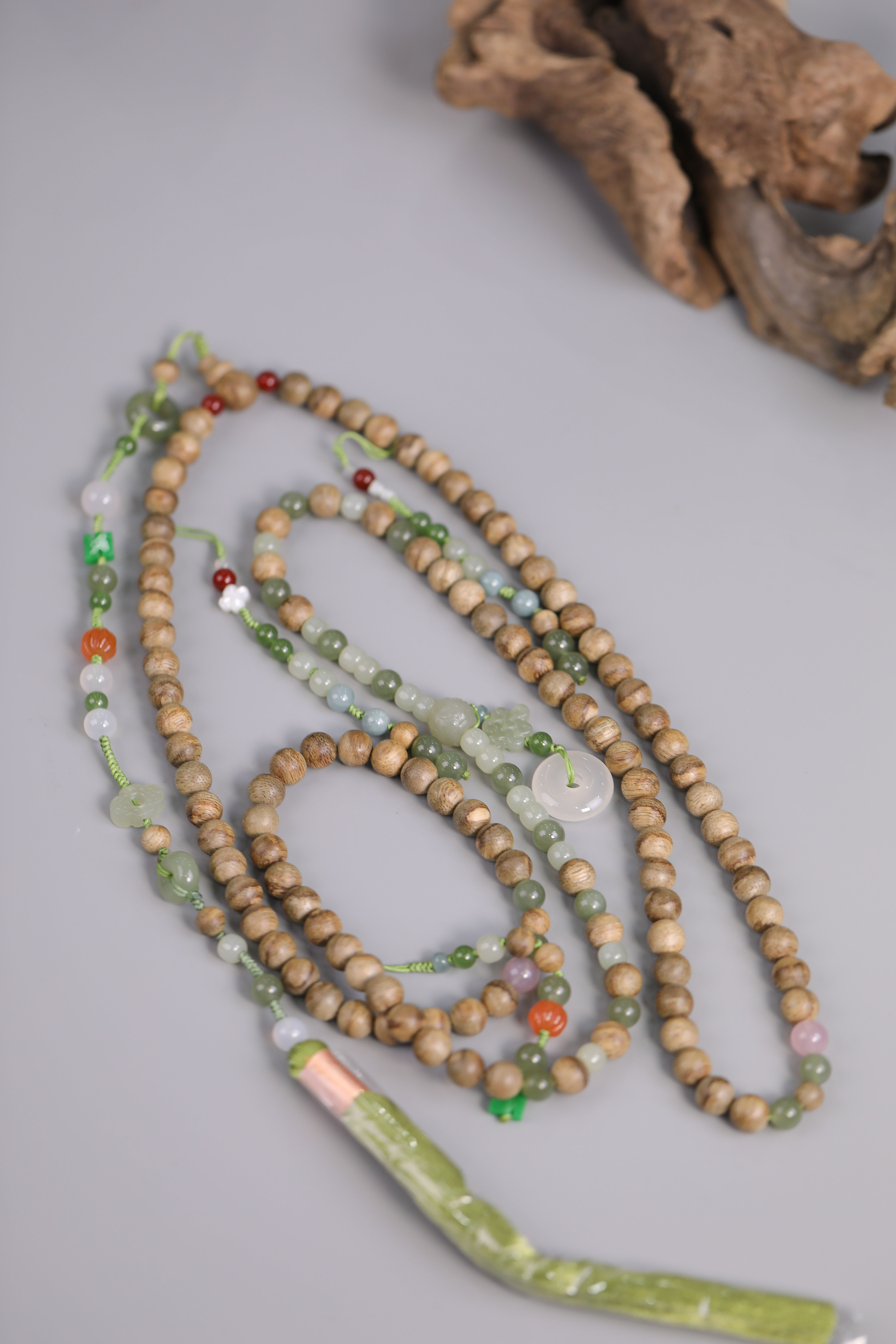这款沉香背云朝珠的设计灵感,源自清代服饰中的朝珠与背云,并结合了现代审美,使其既可以作为斜挎配饰,又能当作璎珞背云佩戴,更加贴合当代新中式风格的服饰,如旗袍、汉服及改良式长衫等。