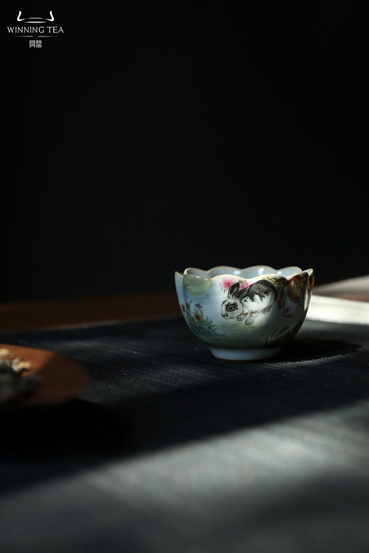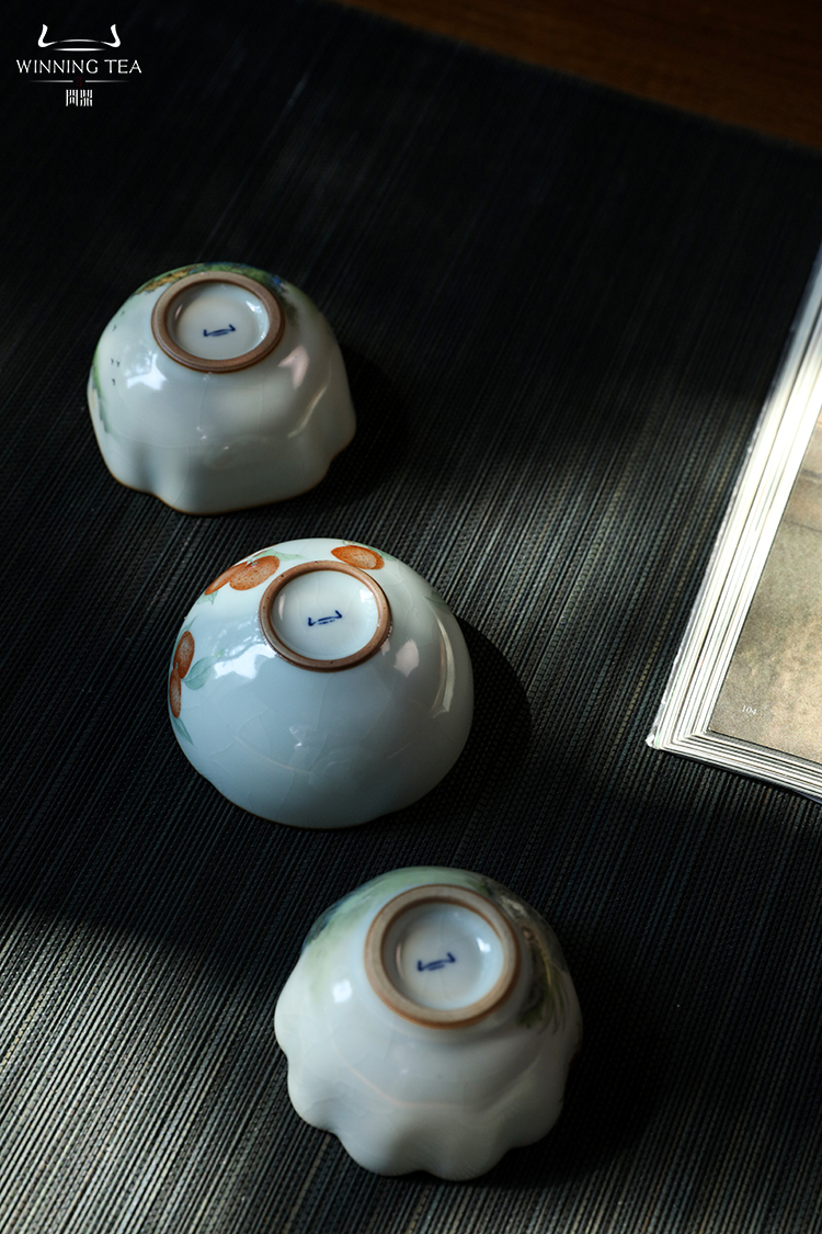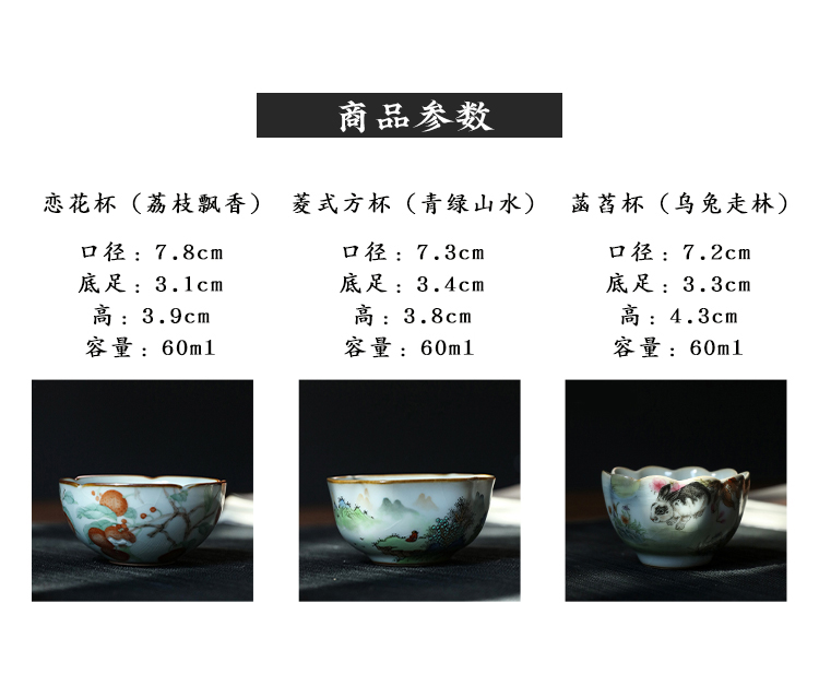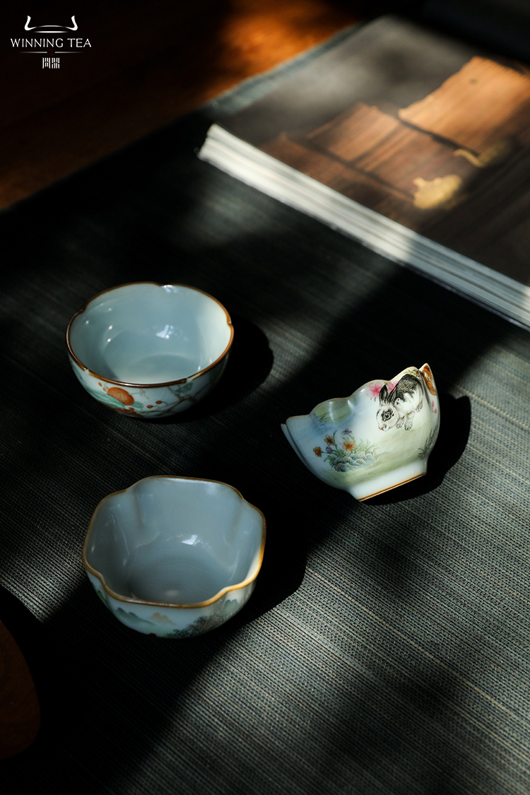 问鼎汝瓷鼎峰系列月白老款恋花杯(荔枝飘香)菡萏杯(乌兔走林) 菱式方杯(青绿山水)