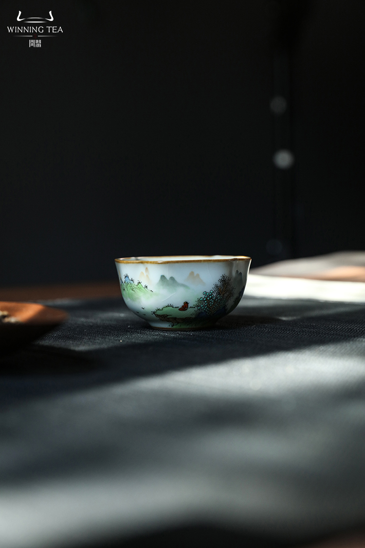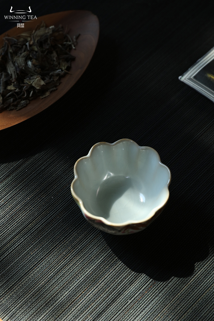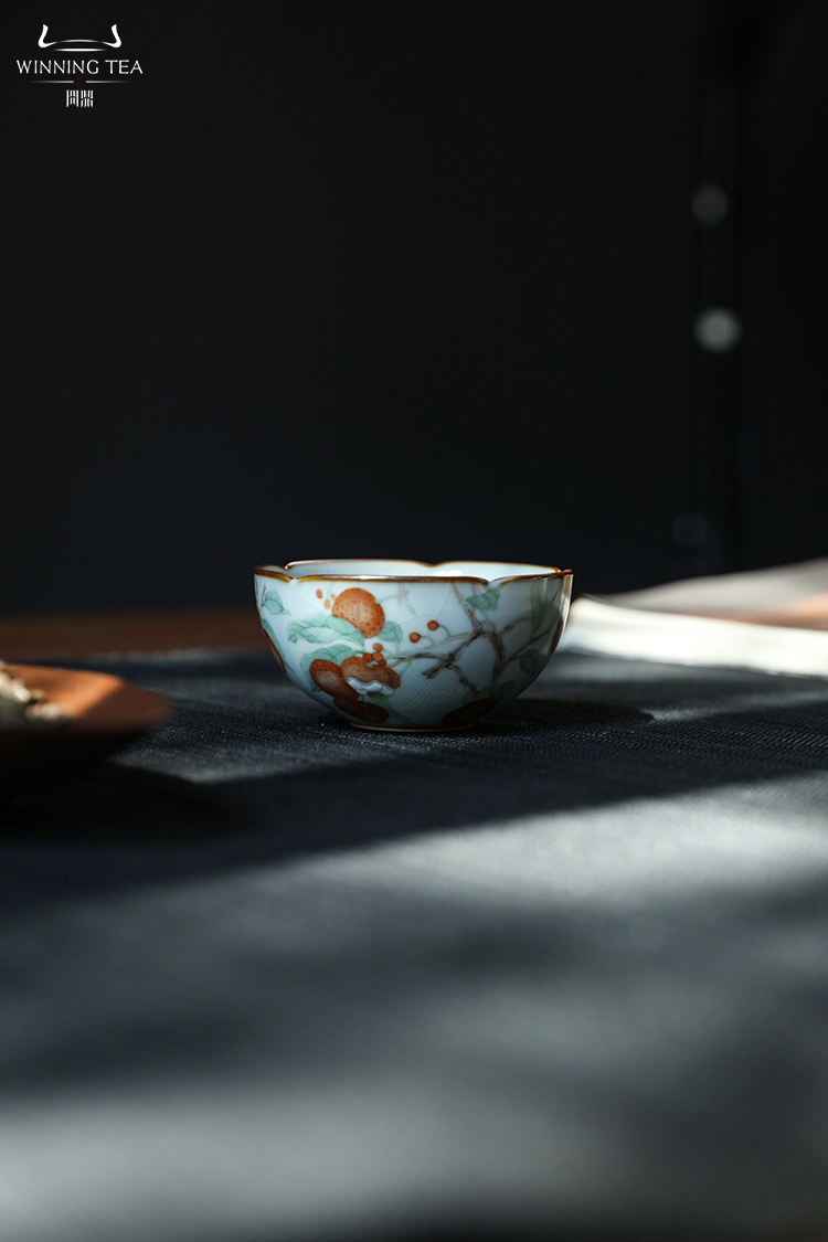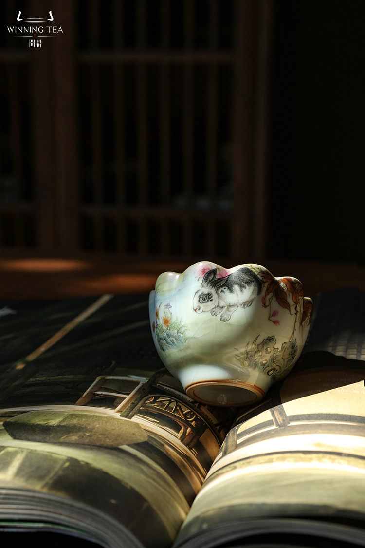 问鼎汝瓷鼎峰系列月白老款恋花杯(荔枝飘香)菡萏杯(乌兔走林) 菱式方杯(青绿山水)
