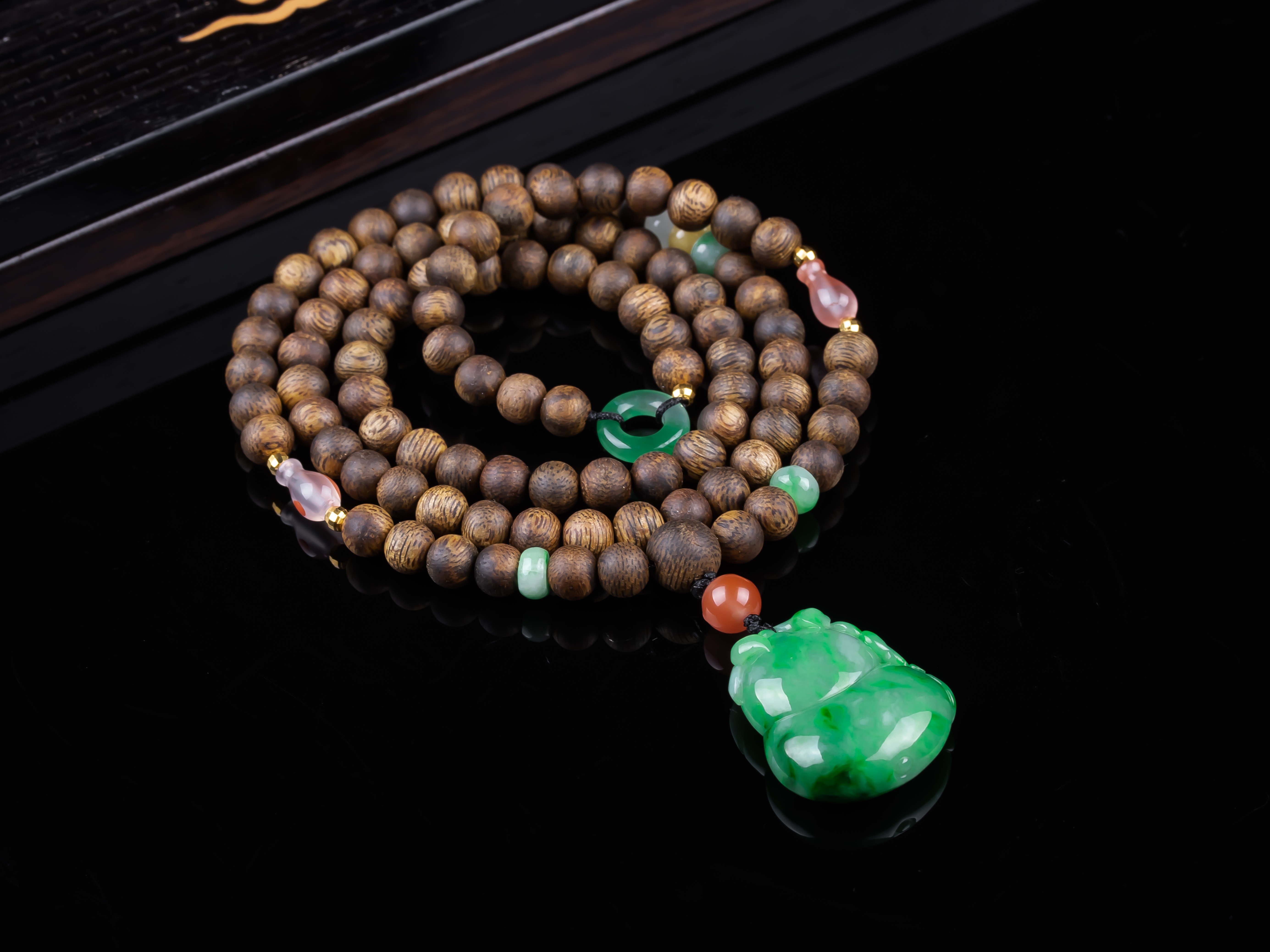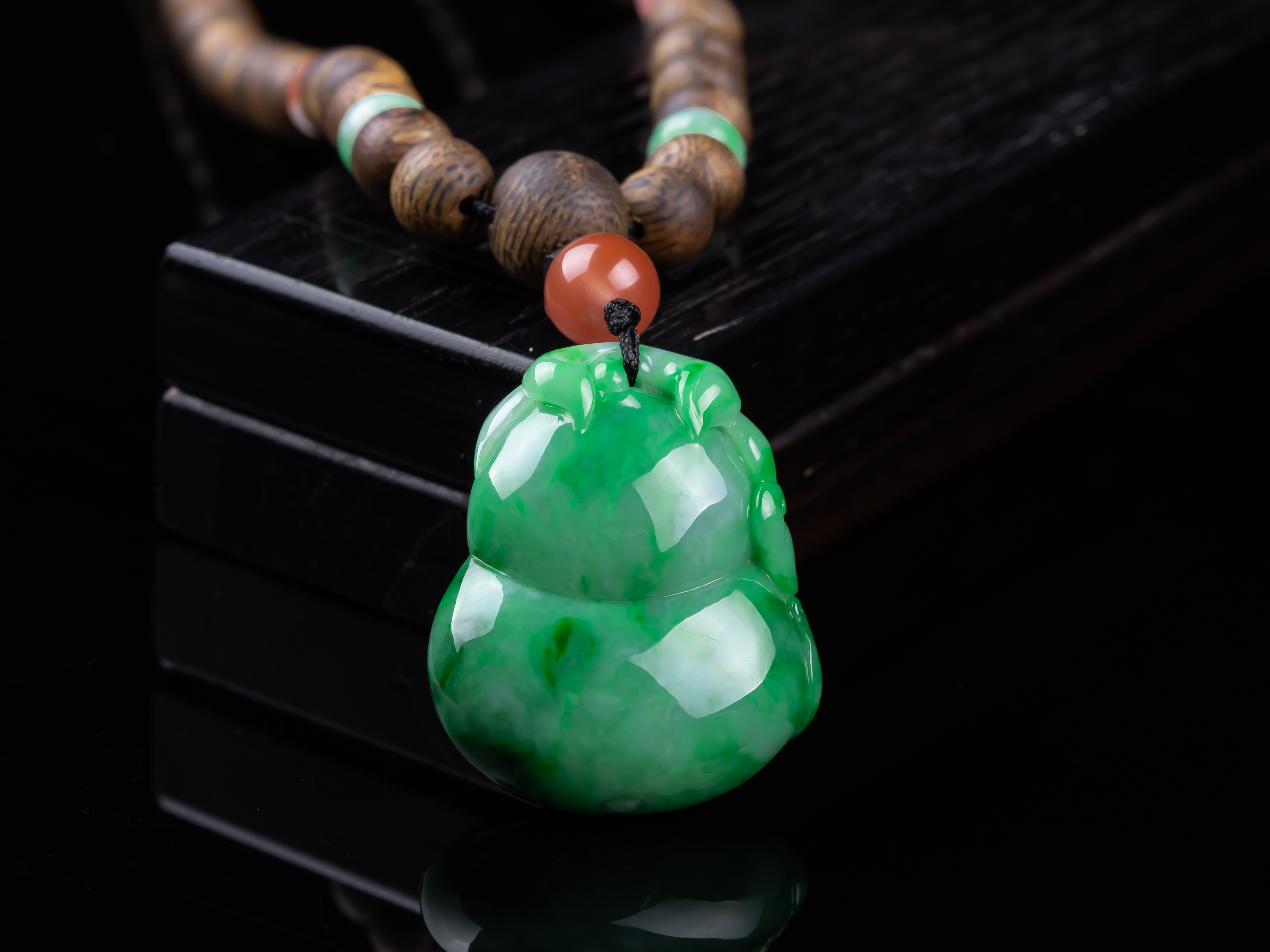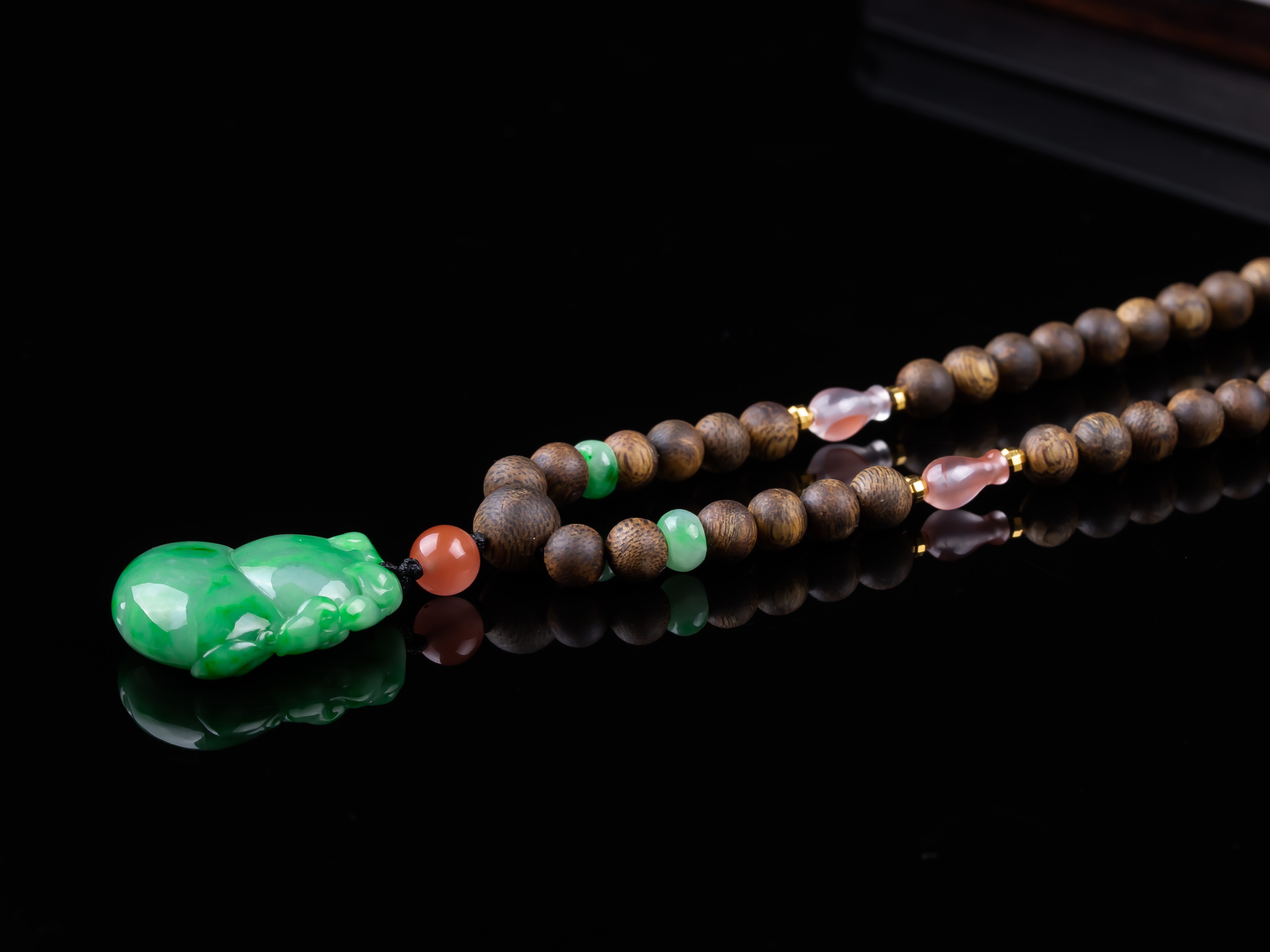 XY0259沉香+飘绿翡翠立体葫芦挂件,天然沉香主链,原色原味,香味自然清甜,配饰:南红、非洲翠、925银。非常好厚庄的立体葫芦,几乎满色,底子细腻,色泽抢眼,款式穿搭典雅有韵味,福禄双倍。