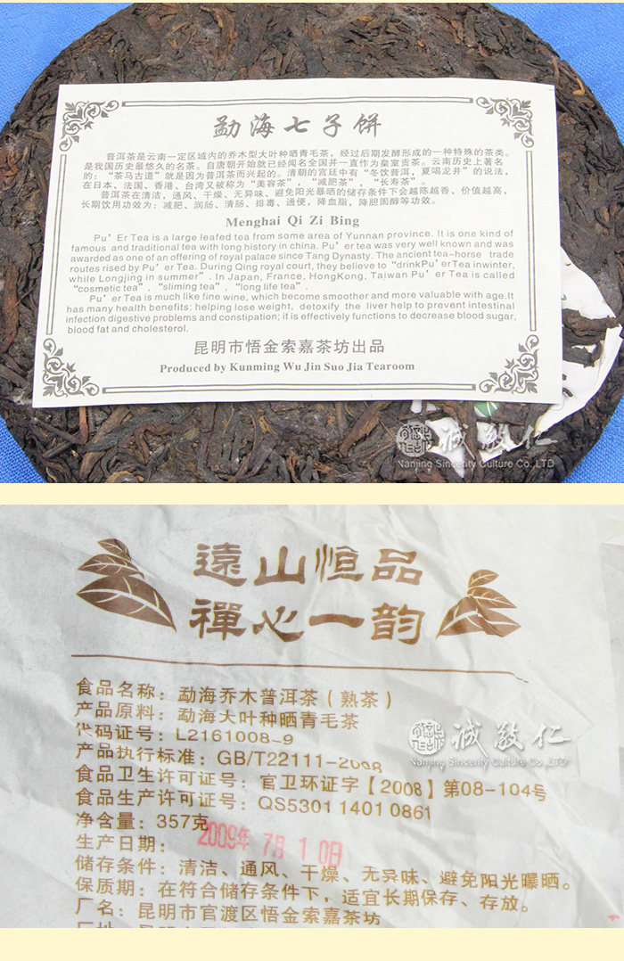 | 【基本信息】 品名:勐海乔木普洱茶(熟茶) 原料:勐海大叶种晒青毛茶 产品执行标准:GB/T22111-2008 净含量:357克 生产日期:2009年7月10日 储存条件:清洁、通风、干燥、无异味、避免阳光曝晒。 保质期:在符合储存条件下,适宜长期保存、存放。 【基本知识】 什么是普洱茶 普洱茶是历史以来形成的云南特有的地方名茶。是以云南原产地的大叶种晒青茶加工而成的,普洱茶属于后发酵茶,成品后都还持续进行着自然陈化过程,具有越陈越香的独特品质。普洱茶是“可以喝的古董”,“人人皆可饮,越旧价越高”。 普洱茶的分类 生茶:采摘后以自然方式发酵,放多年后茶性会转温和,这是历史上的传统制法,生茶自然转熟的进程相当缓慢。 熟茶:以科学加上人为发酵法使茶性温和,缩短陈化阶段,让茶水达到软水好喝,达到自然陈化5-10年的口感。 普洱茶功效: 普洱茶具有暖、减肥、降脂、防止动脉硬化、防治冠心病、降血压、抗衰老、降血糖、解酒等功效;普洱茶是所有茶叶中含有茶多酚最多的一种茶叶,茶多酚经研究具有养颜、增加皮肤抗氧化水平,可直接吸收紫外线,是皮肤的氧化水平有效保护剂。茶多酚很容易吸收空气中的水分,保持皮肤的水份含量,茶多酚还可以使皮肤增白,消除皮肤色斑。近国内外医学专家证明普洱茶对减肥瘦身有着良好的功效。普洱茶对脂肪的代谢有意想不到的效果,对降低人体所含的三酸甘油酯、胆固醇等有不同的疗效。 |