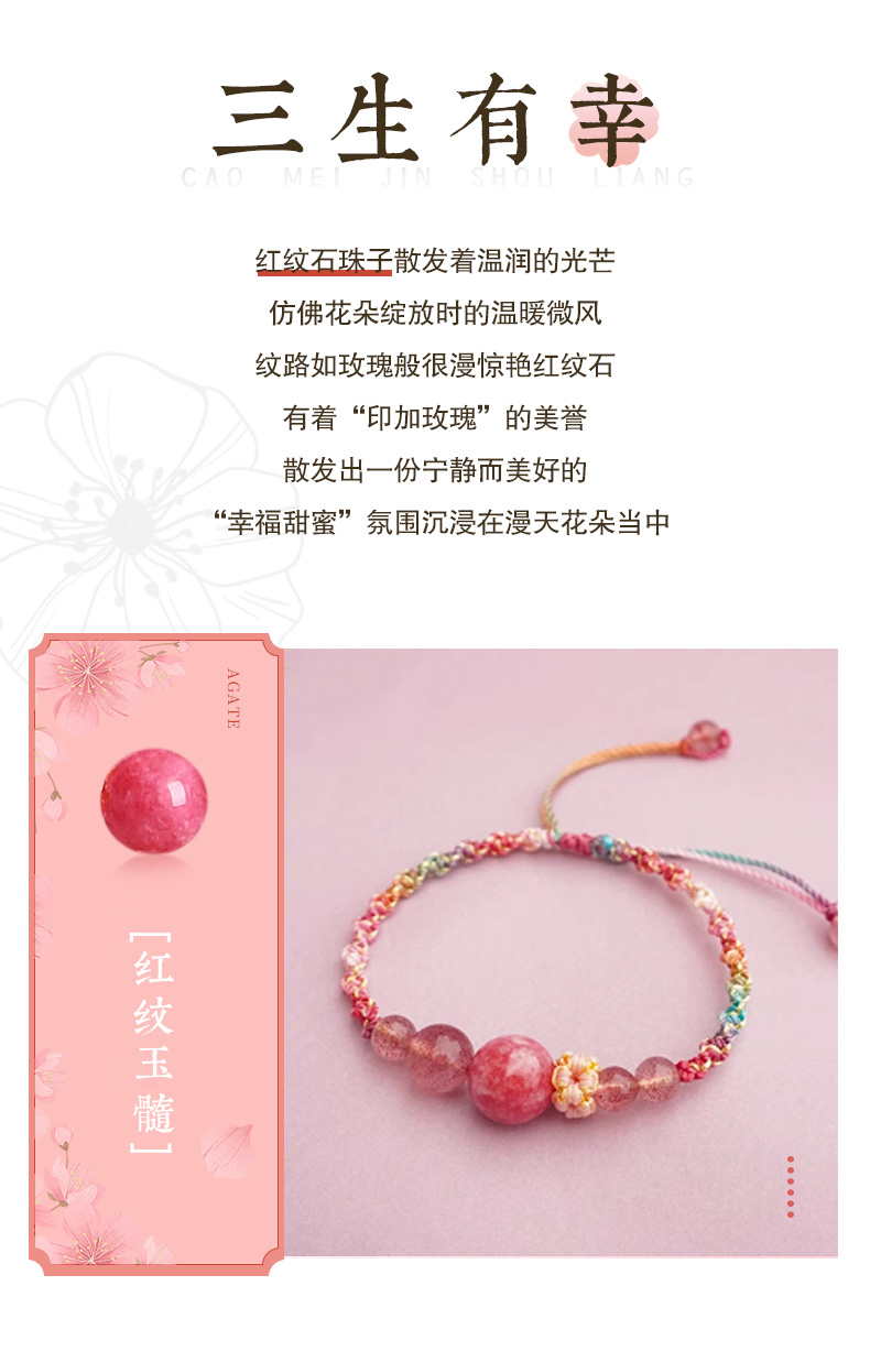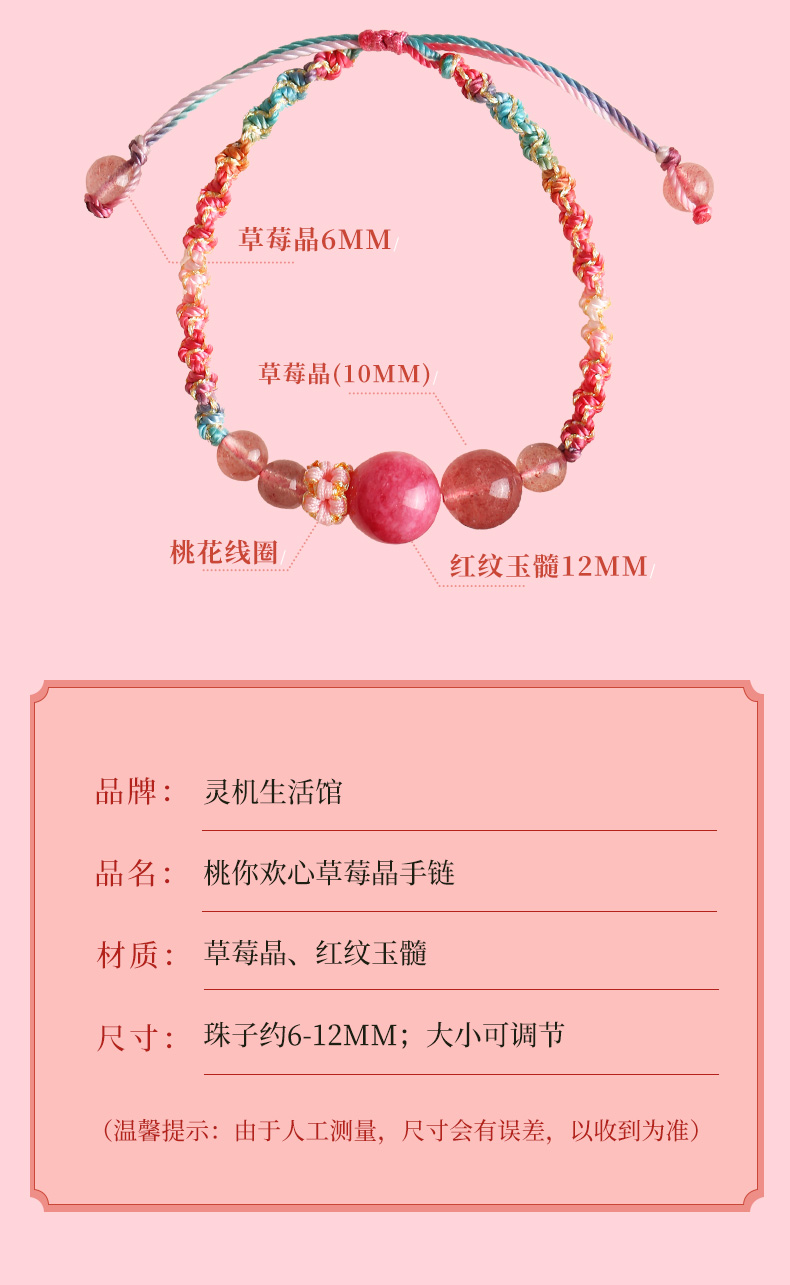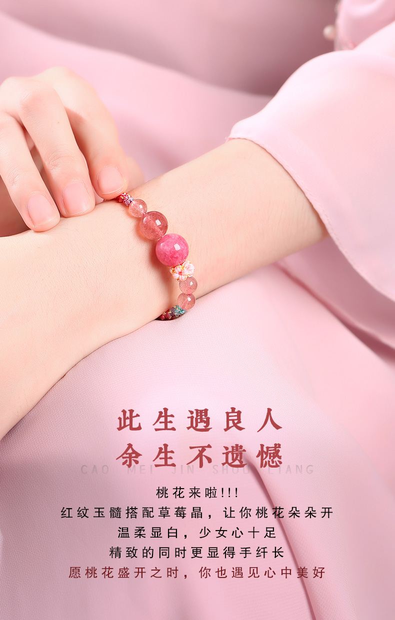 灵机吉品 桃你欢心草莓晶红纹玉髓手链粉红色桃花手绳女生闺蜜礼物编织
