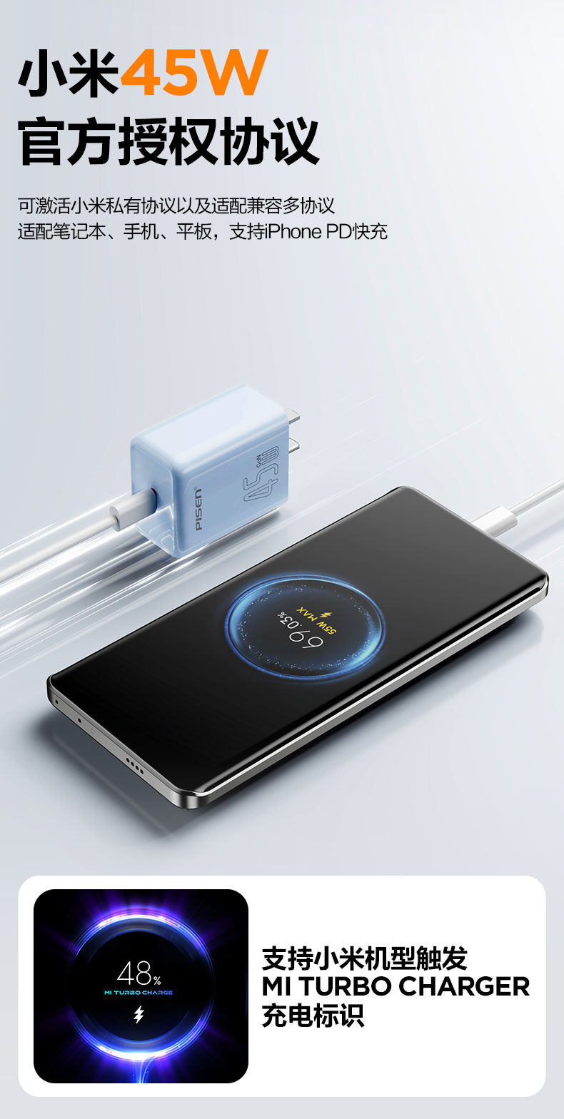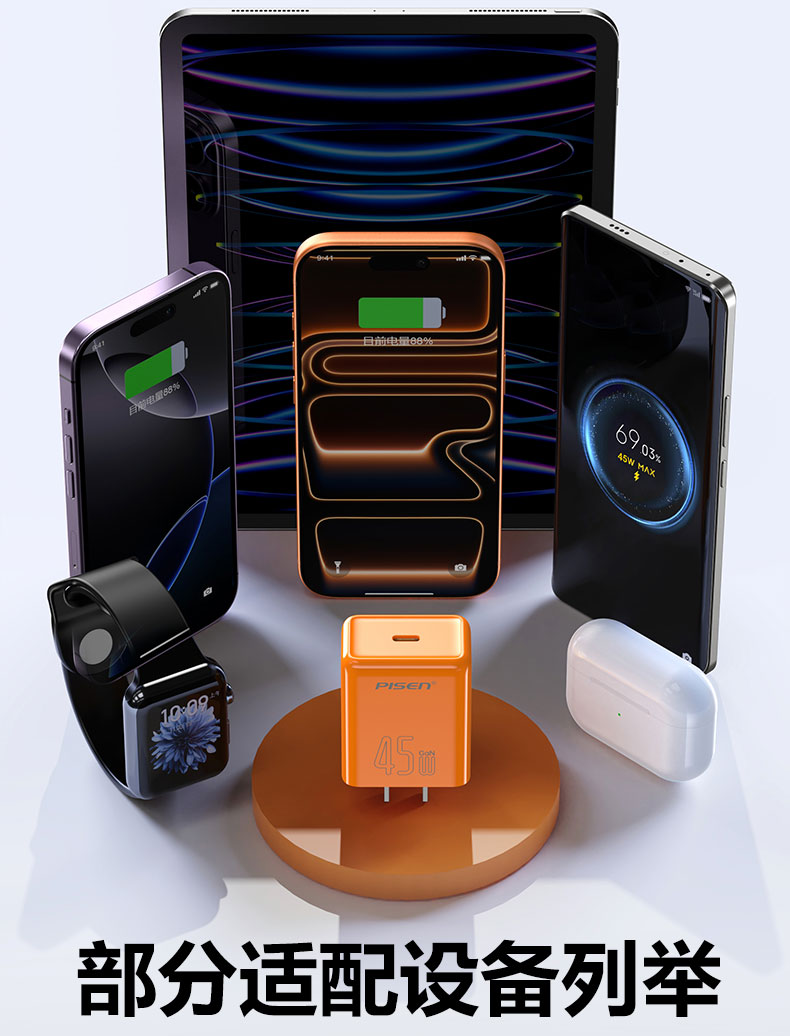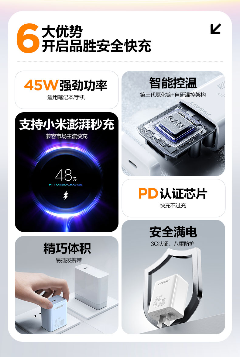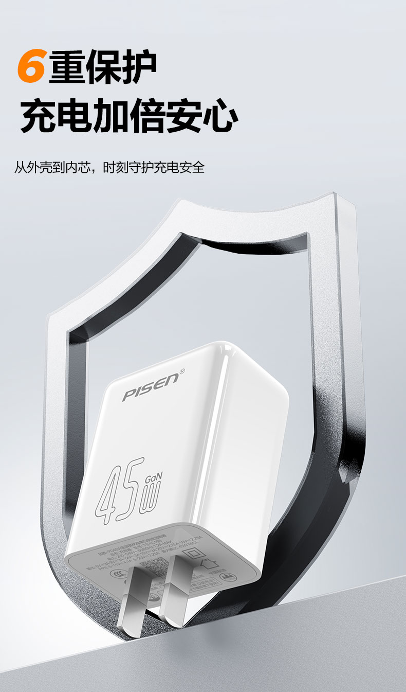品胜 PD45W澎湃氮化镓单口快速充电器Type-C快充头适用苹果16充电器iphone16e/ProMax/plus苹果华为三星手机插头