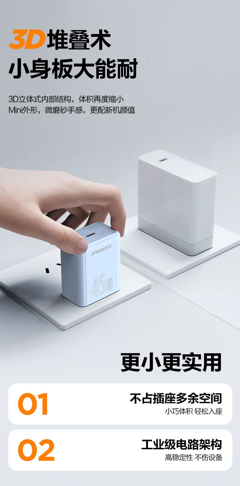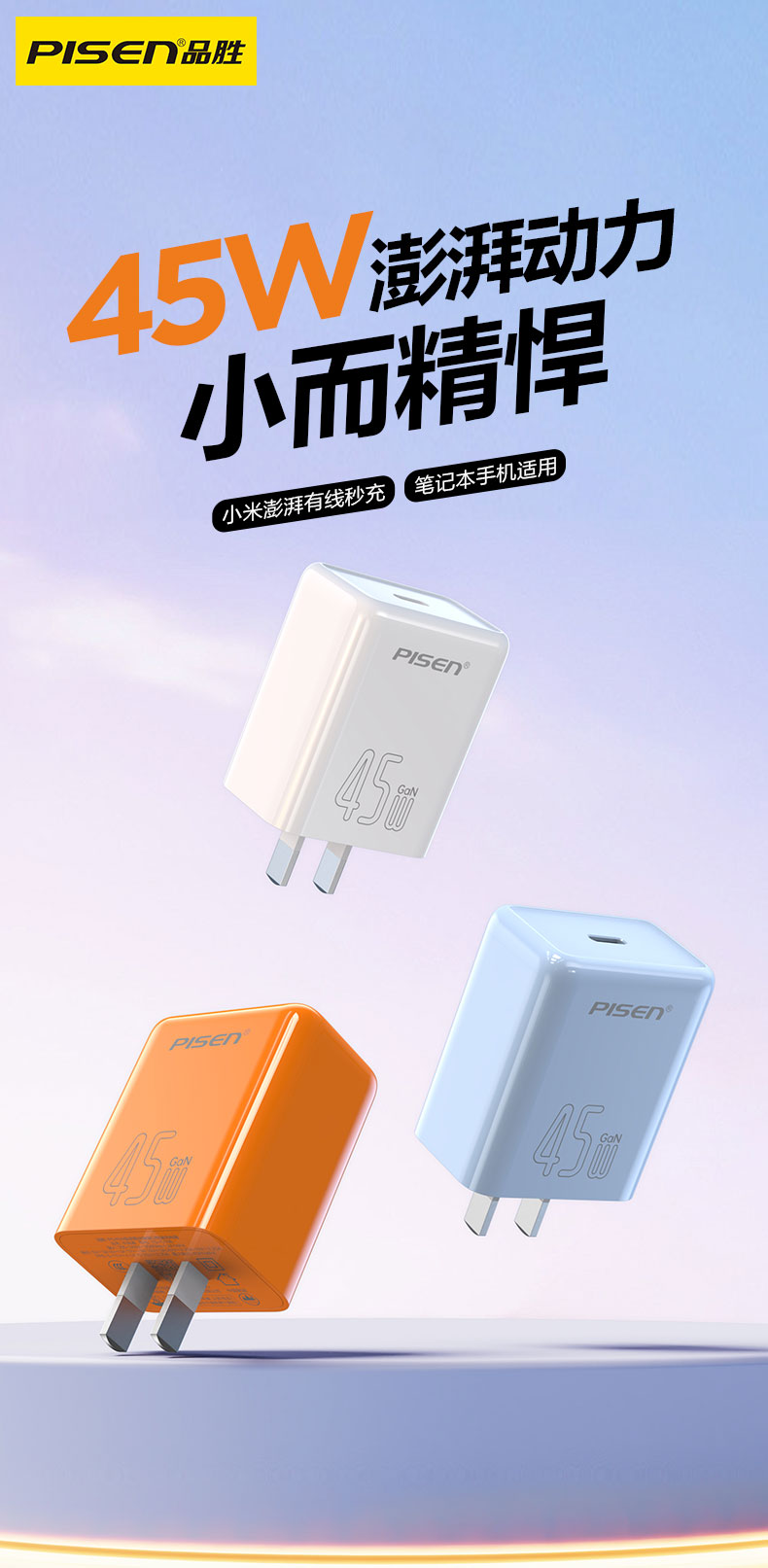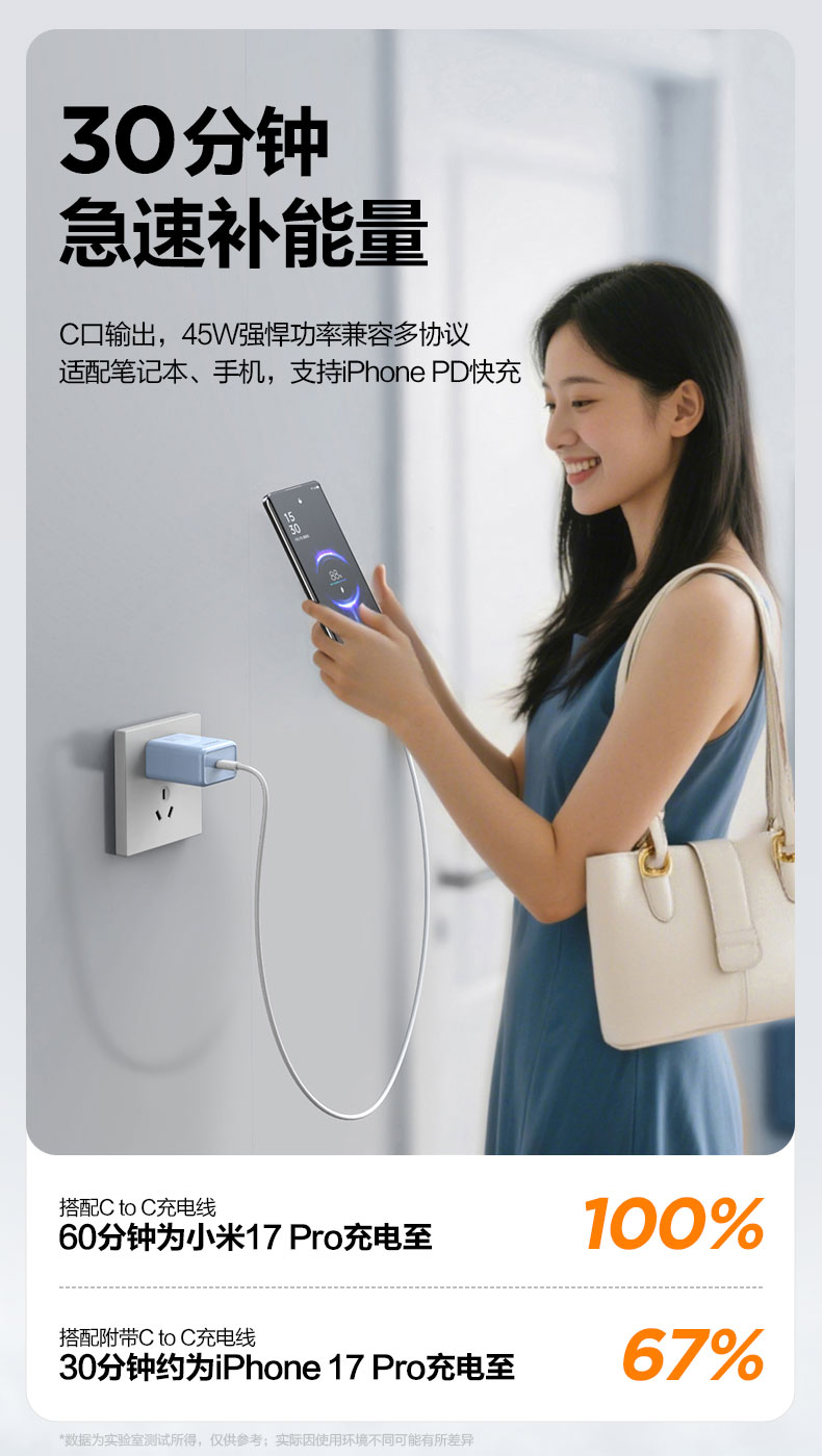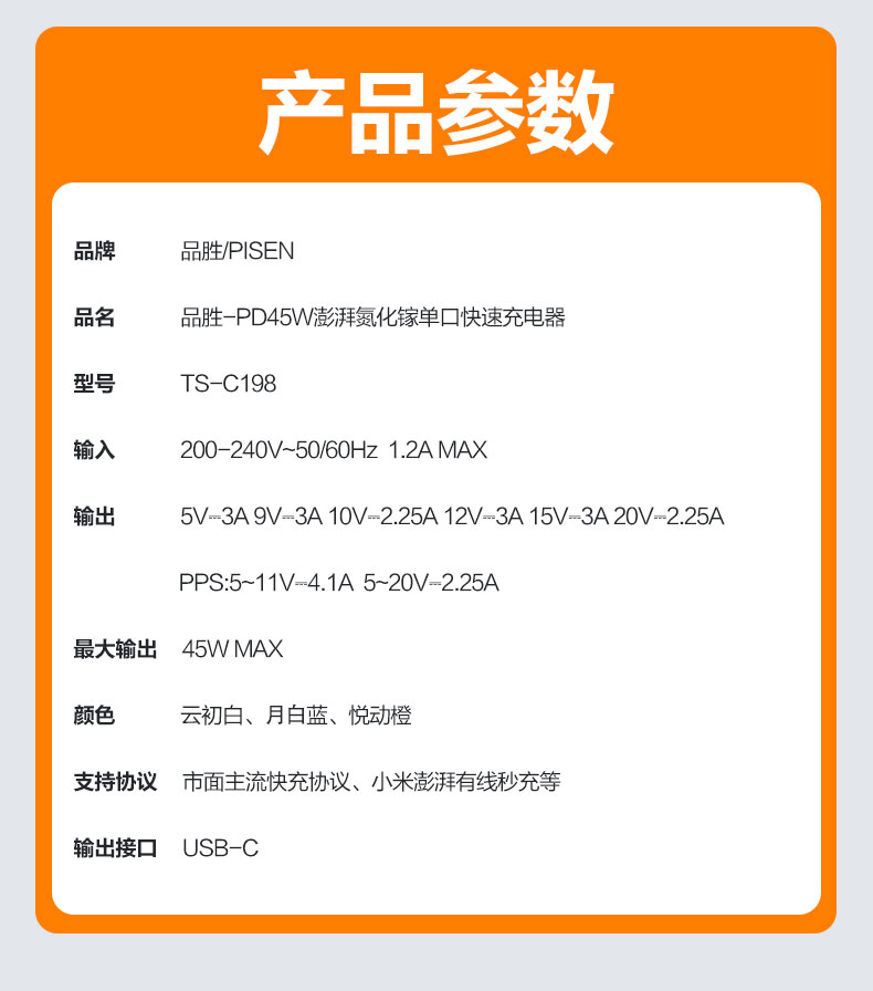 品胜 PD45W澎湃氮化镓单口快速充电器Type-C快充头适用苹果16充电器iphone16e/ProMax/plus苹果华为三星手机插头