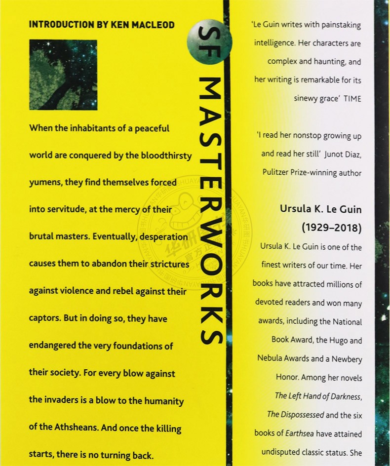 厄休拉·勒奎恩,美国幻想文学大师、文学家,“奇幻小说三巨头”之一,被称为“科幻小说女王”。她的书吸引了数以百万计的忠实读者,并赢得了许多奖项,包括国家图书奖、雨果和星云奖以及纽伯瑞奖。在她的小说中,《黑暗的左手》、《被剥夺的人》和《地海传奇》获得了无可争议的经典地位;她zui近的系列作品《西海岸编年史》为她赢得了美国钢笔中心儿童文学奖和星云奖zui佳小说奖。
