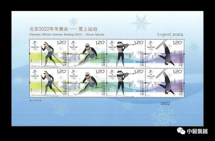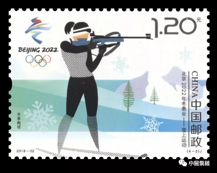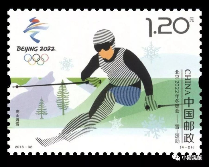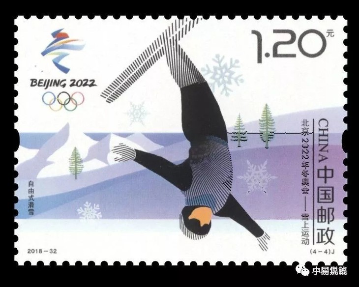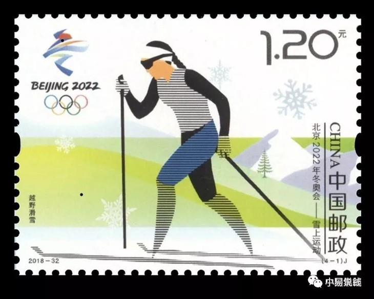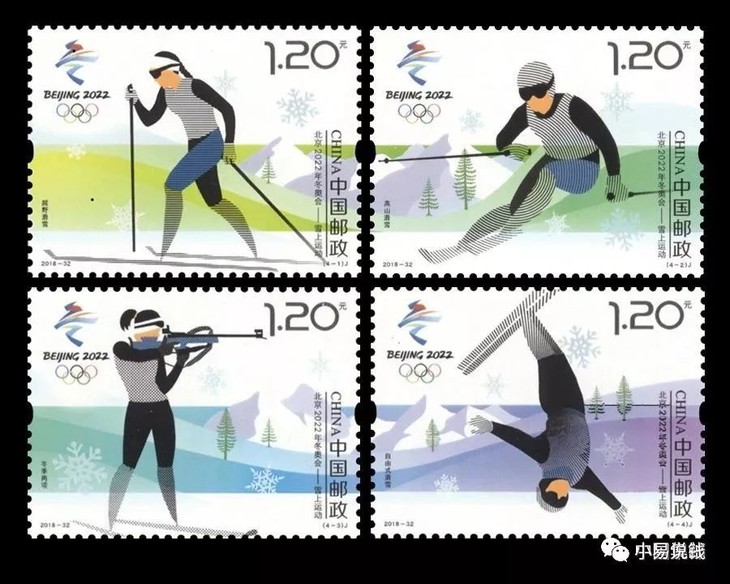中国邮政定于2018年11月16日发行《北京2022年冬奥会——雪上运动》纪念邮票1套4枚,邮票图案名称分别为:越野滑雪、高山滑雪、冬季两项、自由式滑雪。