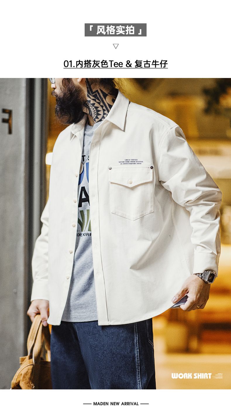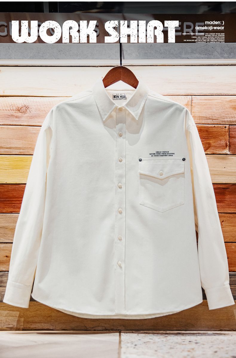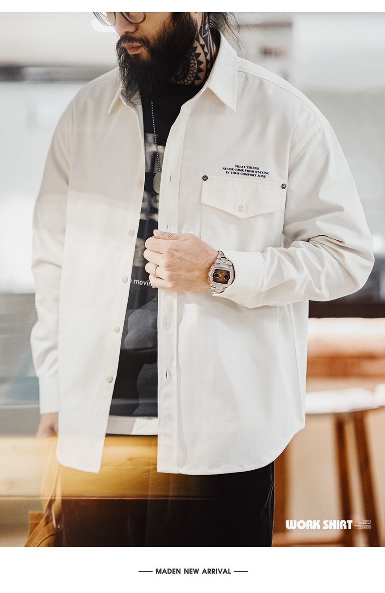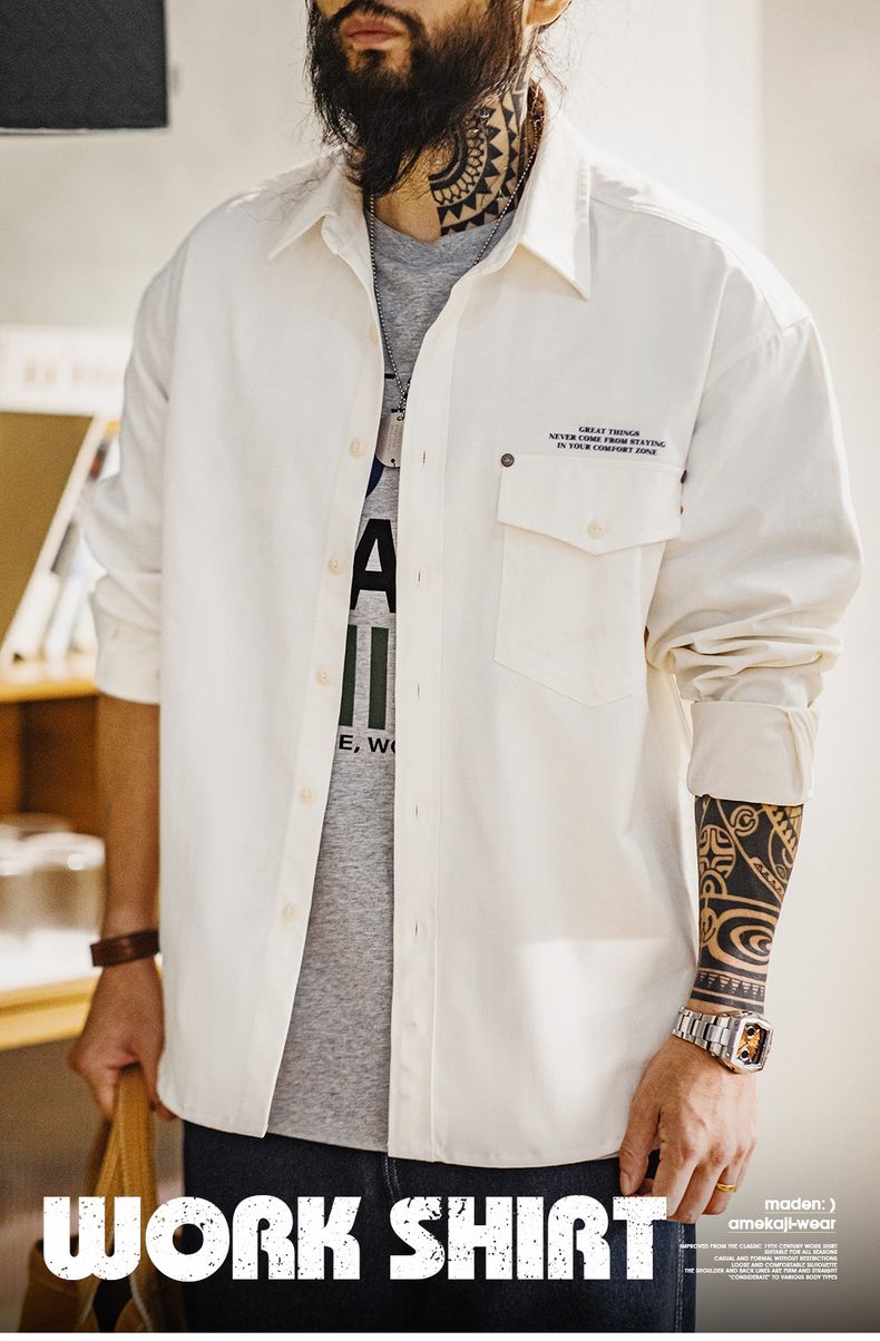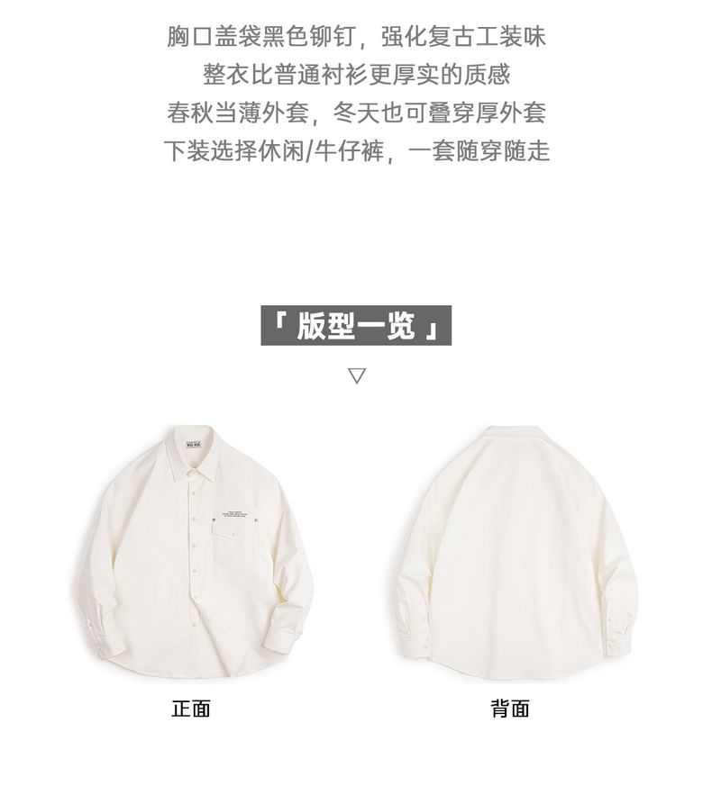 工装优选美式休闲人字纹廓形长袖衬衫印花叠穿翻领白色衬衣男秋冬