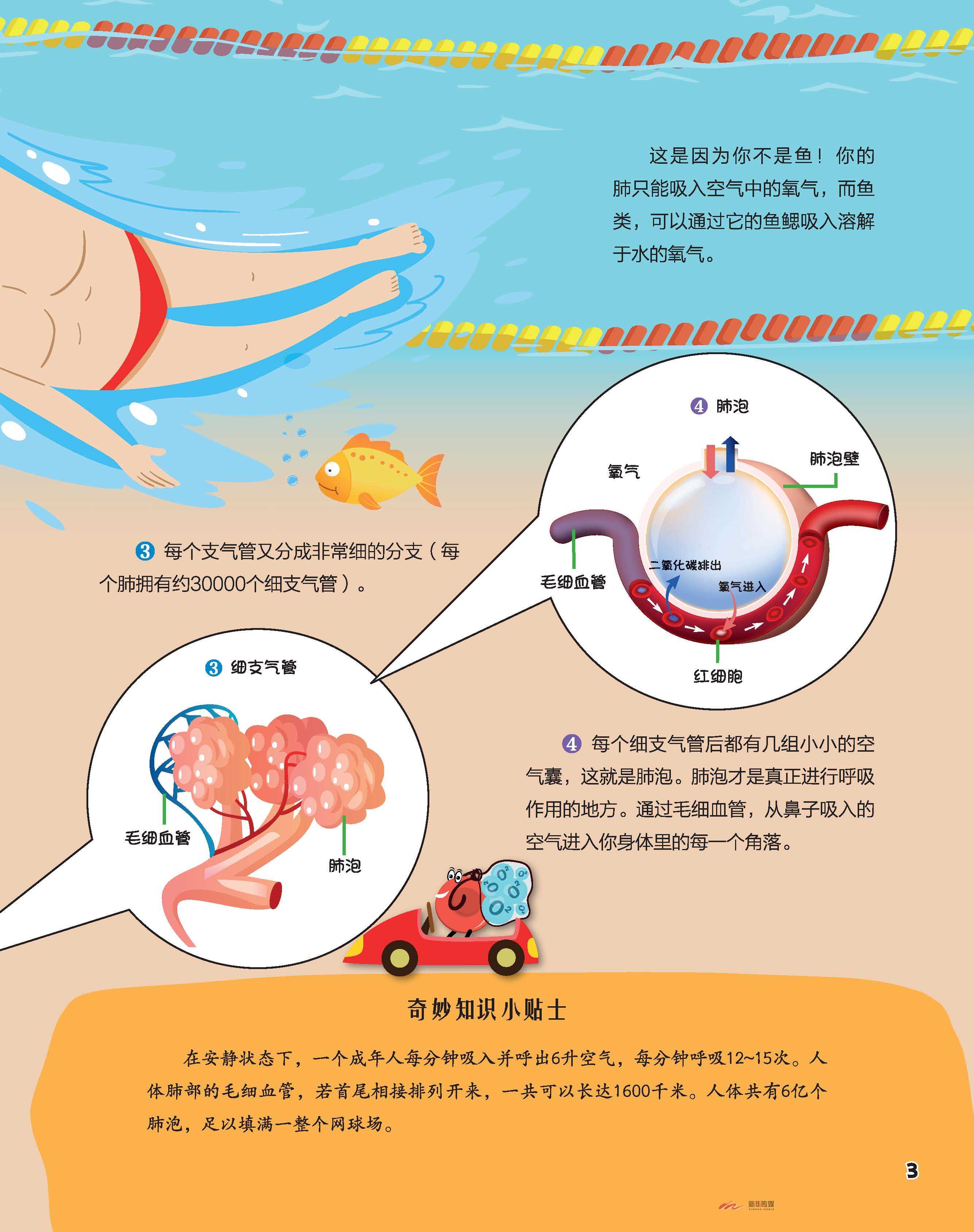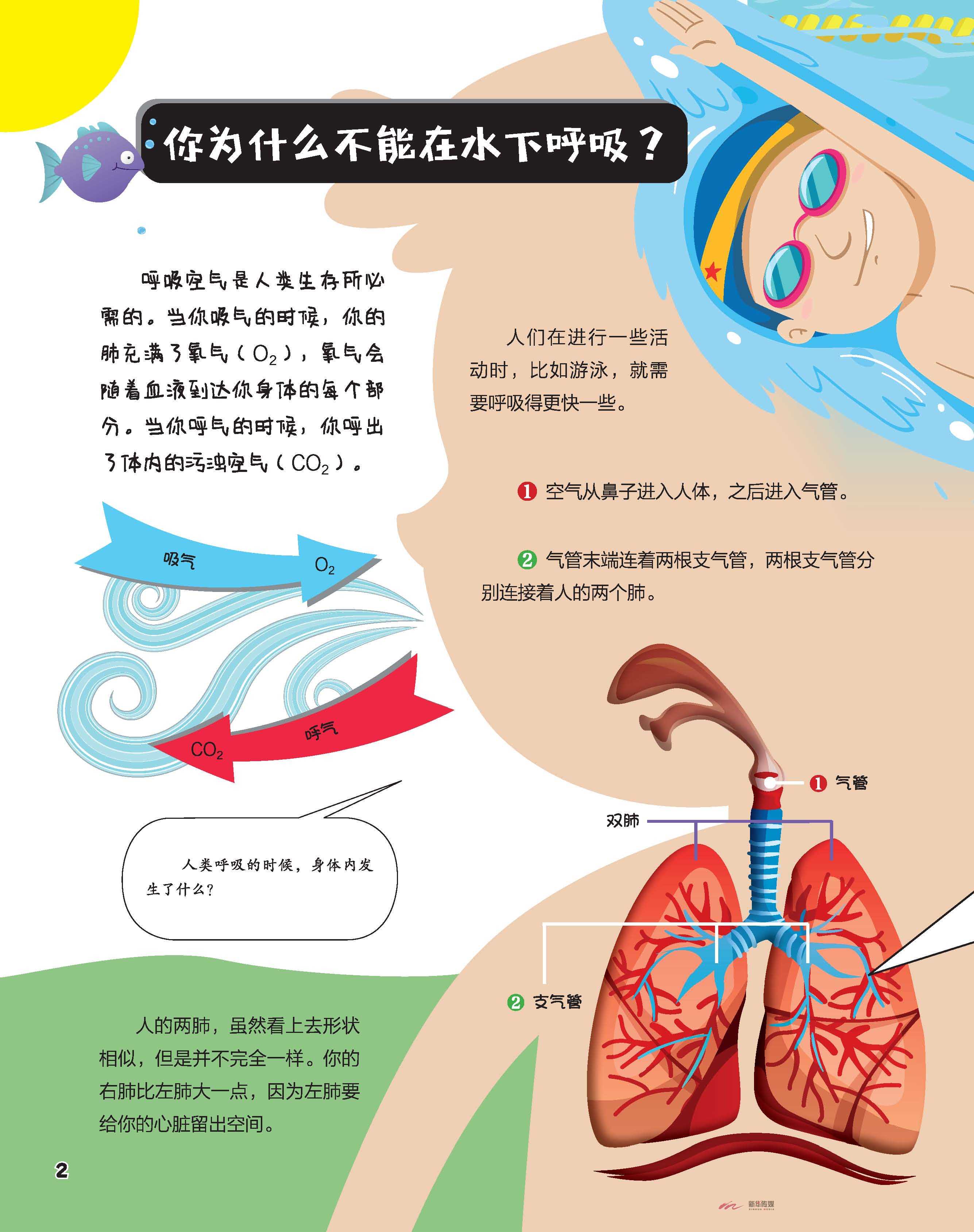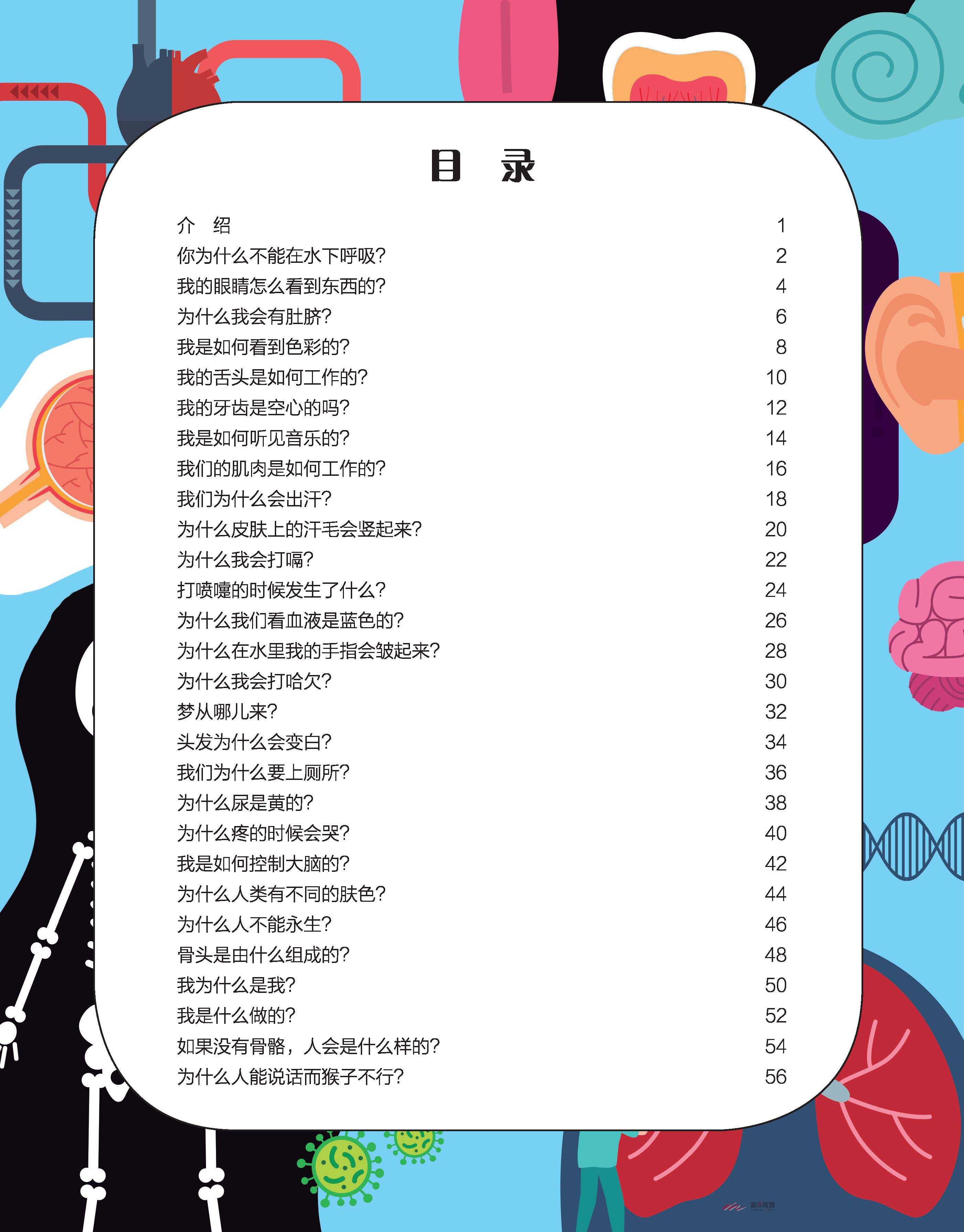 内容简介: 这是一本有关人体科学的科普作品,表面上看里面充满了一些非常专业性的词汇,但作者通过深入浅出的文字描述,以及细致、精确的插画表现,为孩子们展示了人体从细胞、原子到骨骼、器官等运行的奥秘,和他们一起经历了一场奇妙的人体旅行。本书用28个问题激发小朋友们对自己身体运转方面进行饶有兴趣的探究。如为什么不能在水下呼吸?眼睛怎么看到东西的?如何看到色彩的?舌头是如何工作的?牙齿是空心的吗?如何听见音乐的?肌肉是如何工作的?为什么我会有肚脐?为什么会出汗?汗毛为什么会坚起来?为什么会打嗝?为什么人能说话而猴子不行?等等。这些问题既包含了我们体表上能看见的器官,如眼、耳、口、鼻、皮肤、头发、汗毛、肚脐、血管等的运转情况,也包含了藏于体内,不能直接看见的身体器官的运转情况,如肌肉、骨骼、大脑等;还包括了一些生理现象的运转情况,如出汗、做梦、打嗝、打喷嚏、打哈欠、上厕所、说话等,甚至还包括有;我为什么是我?;我是什么做的?;为什么人不能永生?这样看似很深奥却又是小朋友们感兴趣又常常会提及的问题。本书以图表和图画的形式来帮助小朋友们了解这些人体运转的过程,让这些有关人体的科普知识生动有趣而不枯躁乏味。
