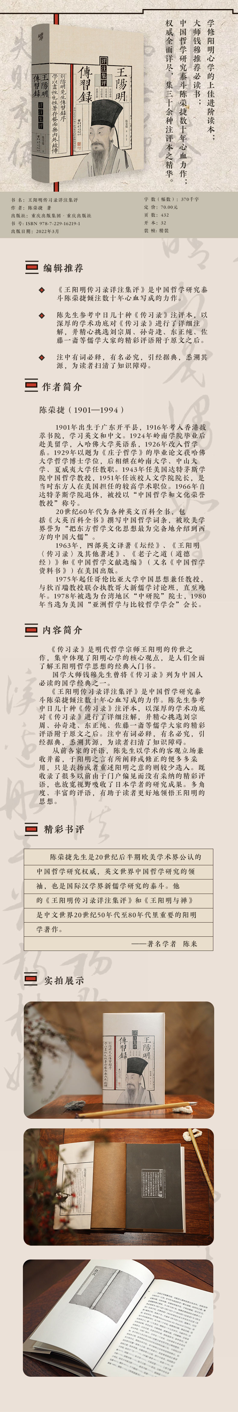 《传习录》是明代哲学宗师王阳明的传世之作,集中体现了阳明心学的核心观点,是人们全面了解王阳明哲学思想的经典入门书。 《王阳明传习录详注集评》是中国哲学研究泰斗陈荣捷倾注数十年心血写成的力作。陈先生参考中日几十种《传习录》注评本,以深厚的学术功底对《传习录》进行了详细注解,并精心挑选刘宗周、佐藤一斋等儒学大家的精彩评语附于原文之后。注中有词必释,有名必究,引经据典,悉溯其源。从前各家的评语,陈先生以学术的客观立场兼收并蓄,于阳明之言有所阐释或修正的便多多采用,只是表扬或者重述阳明之意的则较少选入。既收录了很多以前由于门户偏见而没有采纳的精彩评语,也放宽视野吸收了日本学者的研究成果。此外,陈先生从《王文成公全书》《王阳明年谱》等文本中拾遗五十一条阳明语录,为其他版本所缺。