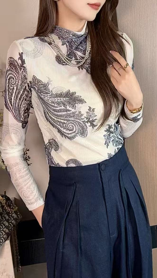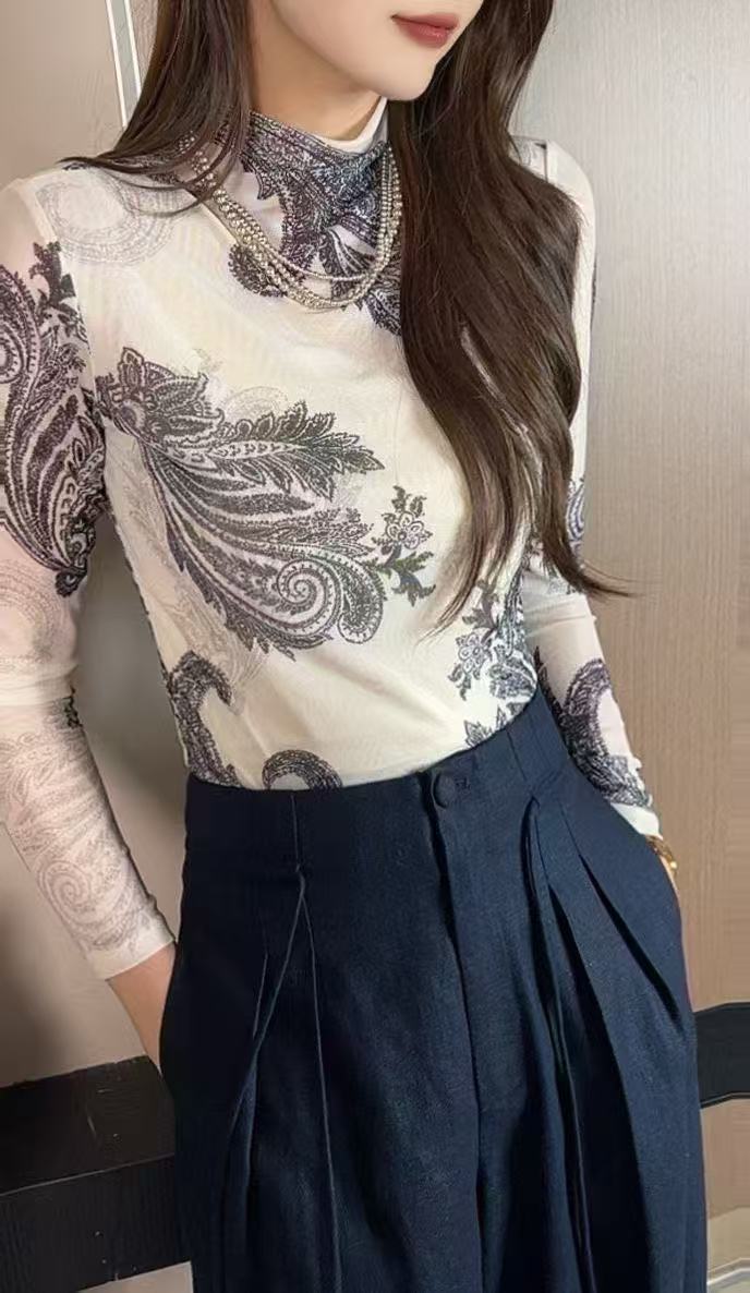 SZ3T53_皓色_T恤_秋季_半高领透视网纱腰果花印花修身长袖_高级女装_BERNIEELEN 伯妮斯茵