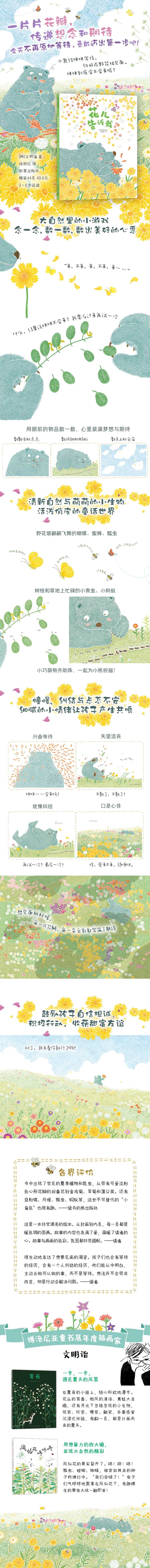 【媒体评论】书中出现了常见的夏季植物和昆虫,从带有可爱的淡粉色心形花瓣的报春花到金鸡菊、翠菊和蒲公英。还有豆粉蝶、尺蠖、瓢虫、蚂蚁等,这些不可替代的;小角色也很有趣。读书的熊出版社
