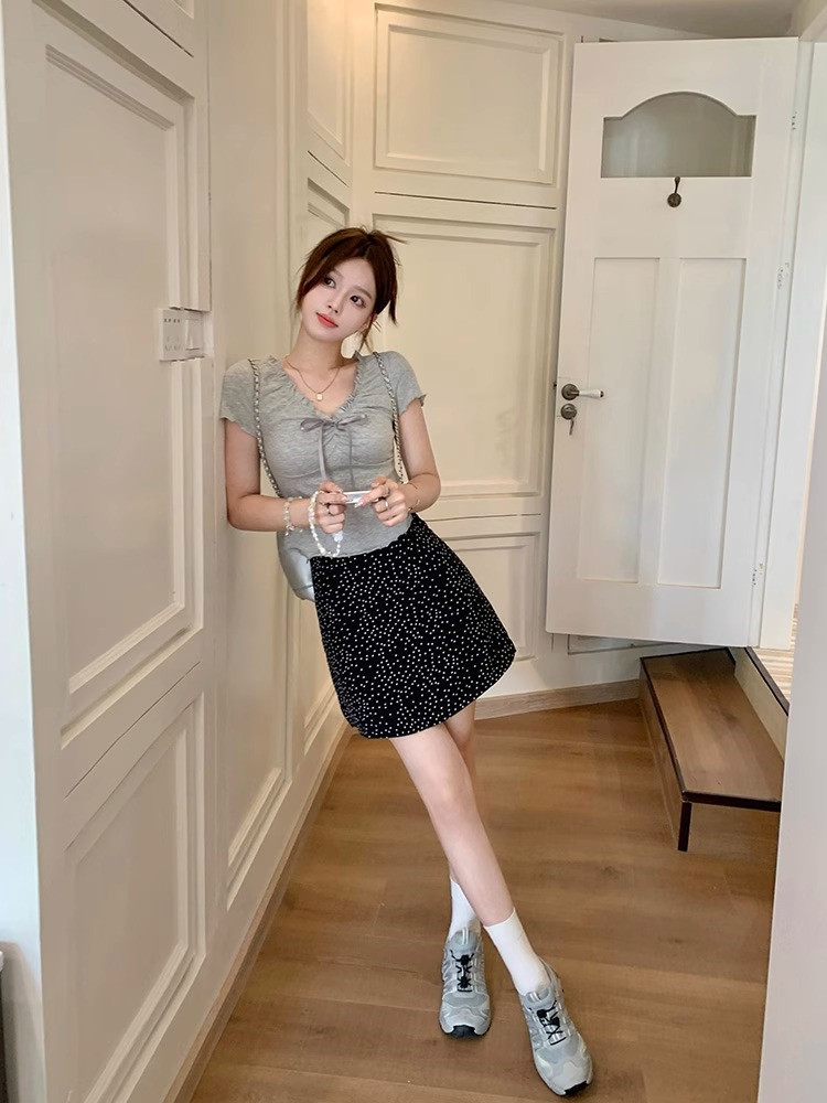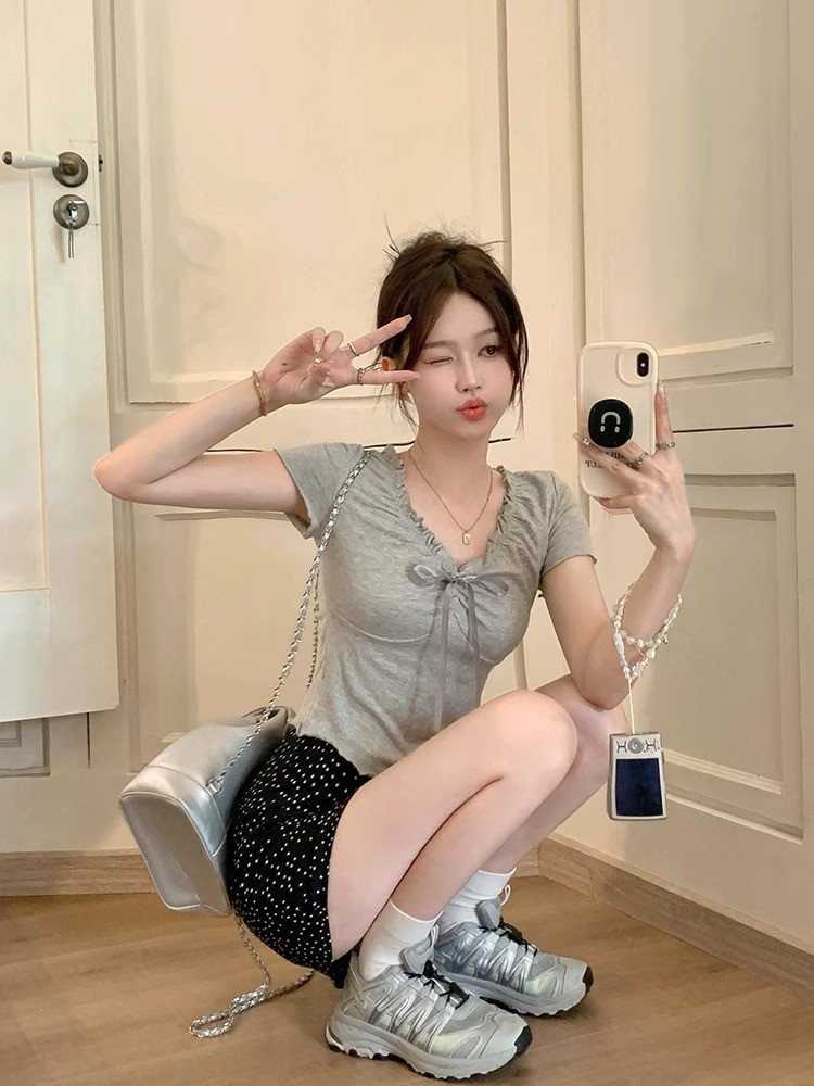 【灰色高级感❗️蝴蝶结花边短袖】修身显瘦辣妹短款上衣ins,夏季v领修身显瘦,木耳边正肩t恤女,芭蕾风甜辣短款小个子上衣服L