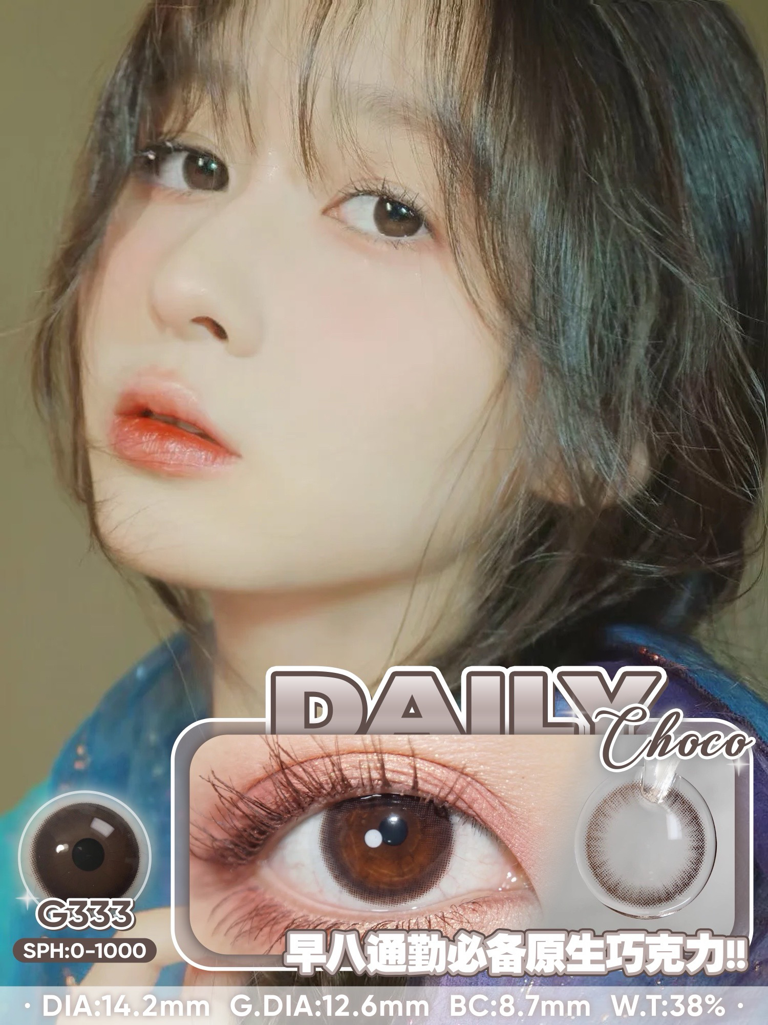 标注直径:14.2mm着色直径:12.6mm含水量:38%佩戴期限:半年型(建议六个月)可配:0-1000度(有525/575)材质韩产含硅水凝胶