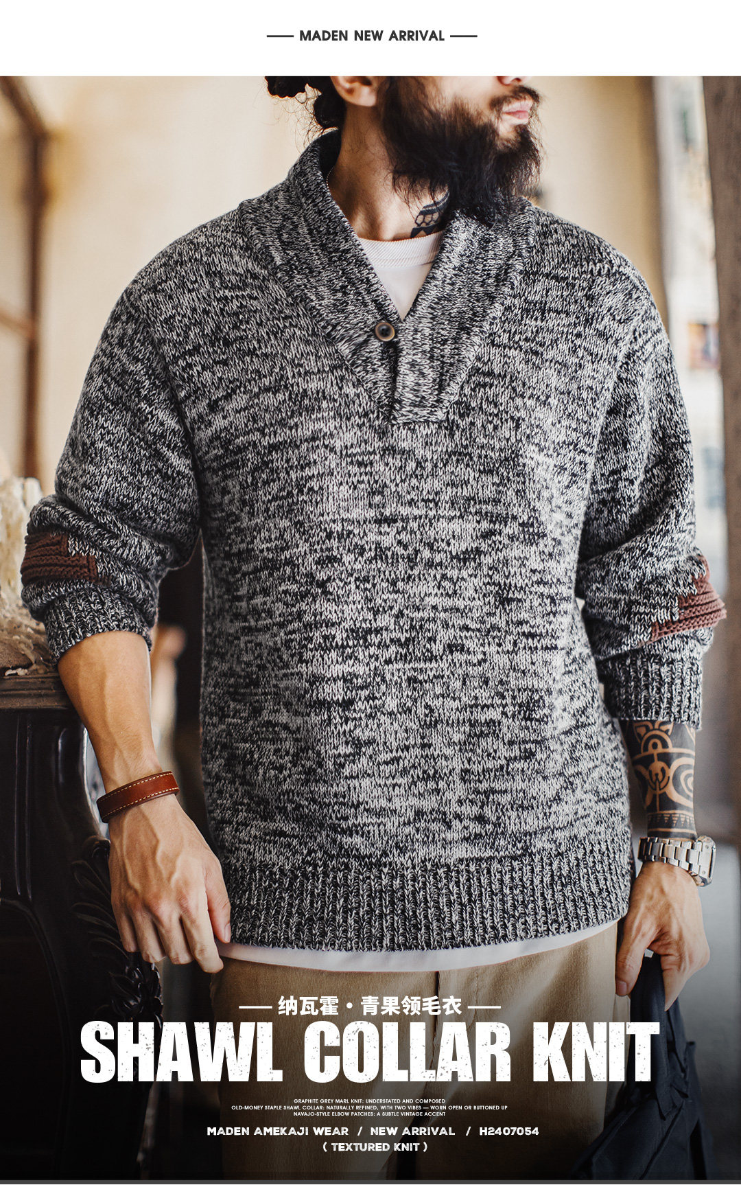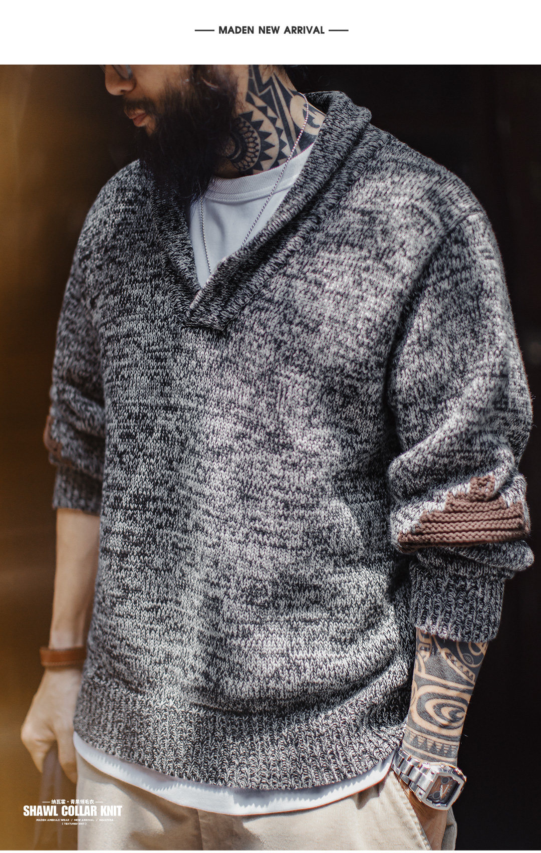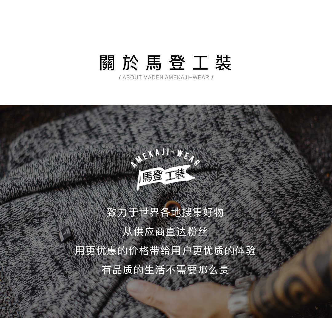 马登工装美式复古青果领毛衫老钱风套头毛衣针织衫灰色外套男冬