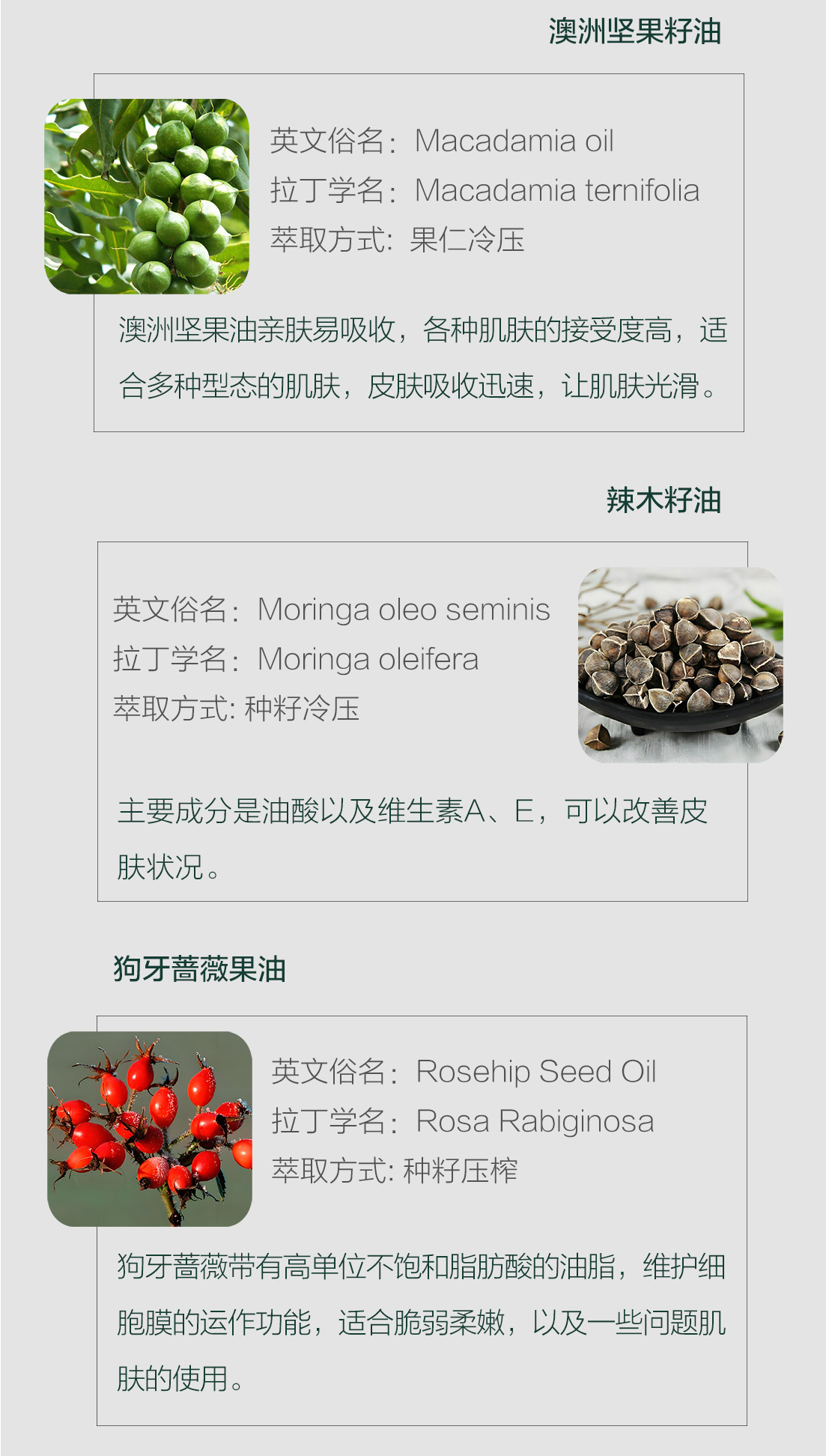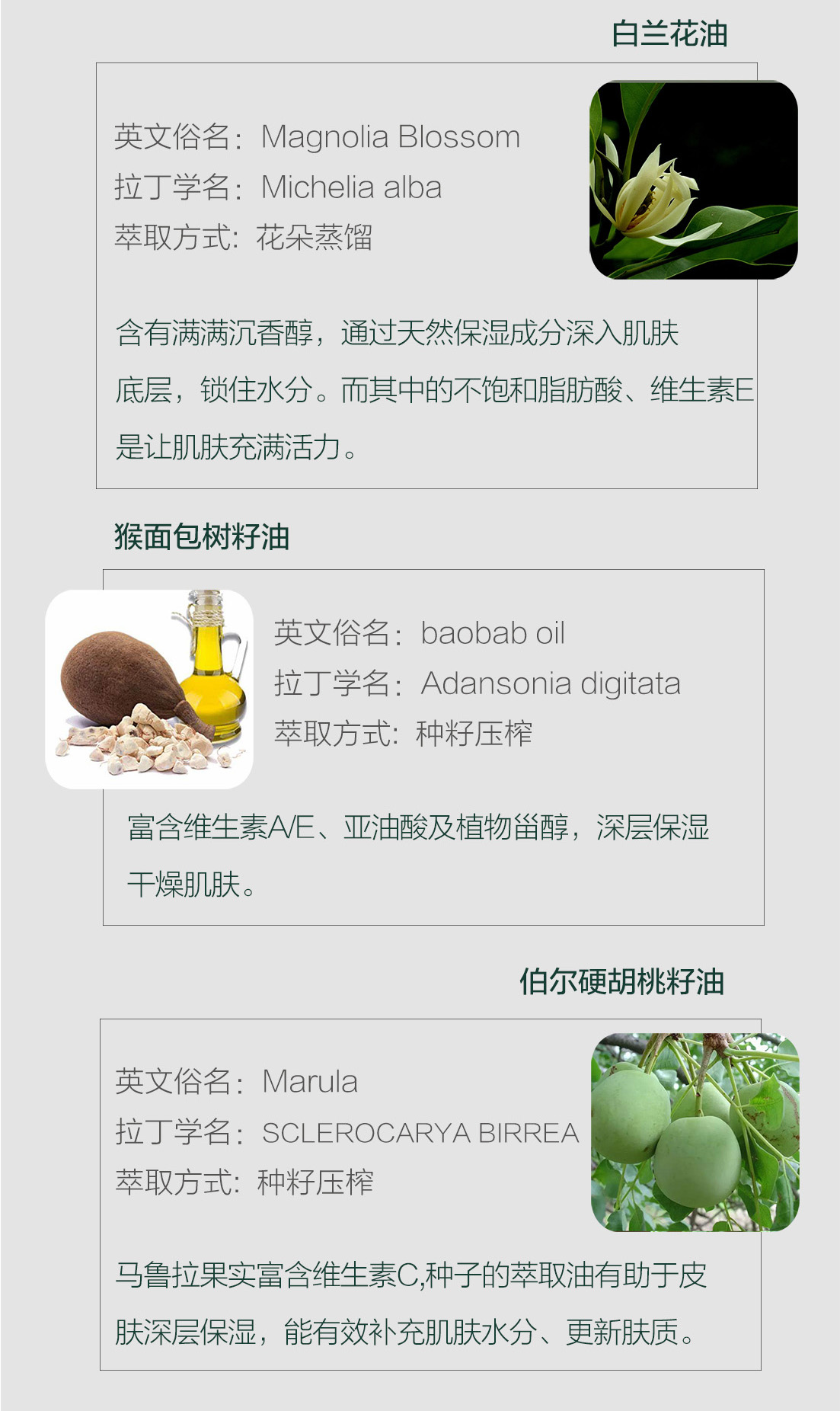成分:霍霍巴(SIMMONDSIA CHINENSIS)籽油、澳洲坚果(MACADAMIA TERNIFOLIA)籽油、辣木(MORINGA OLEIFERA)籽油、狗牙蔷薇(ROSA CANINA)果油、白兰(MICHELIA ALBA)花油、猴面包树(ADANSONIA DIGITATA)籽油、伯尔硬胡桃(SCLEROCARYA BIRREA)籽油、鳄梨(PERSEA GRATISSIMA)油、玫瑰草(CYMBOPOGON MARTINI)油。