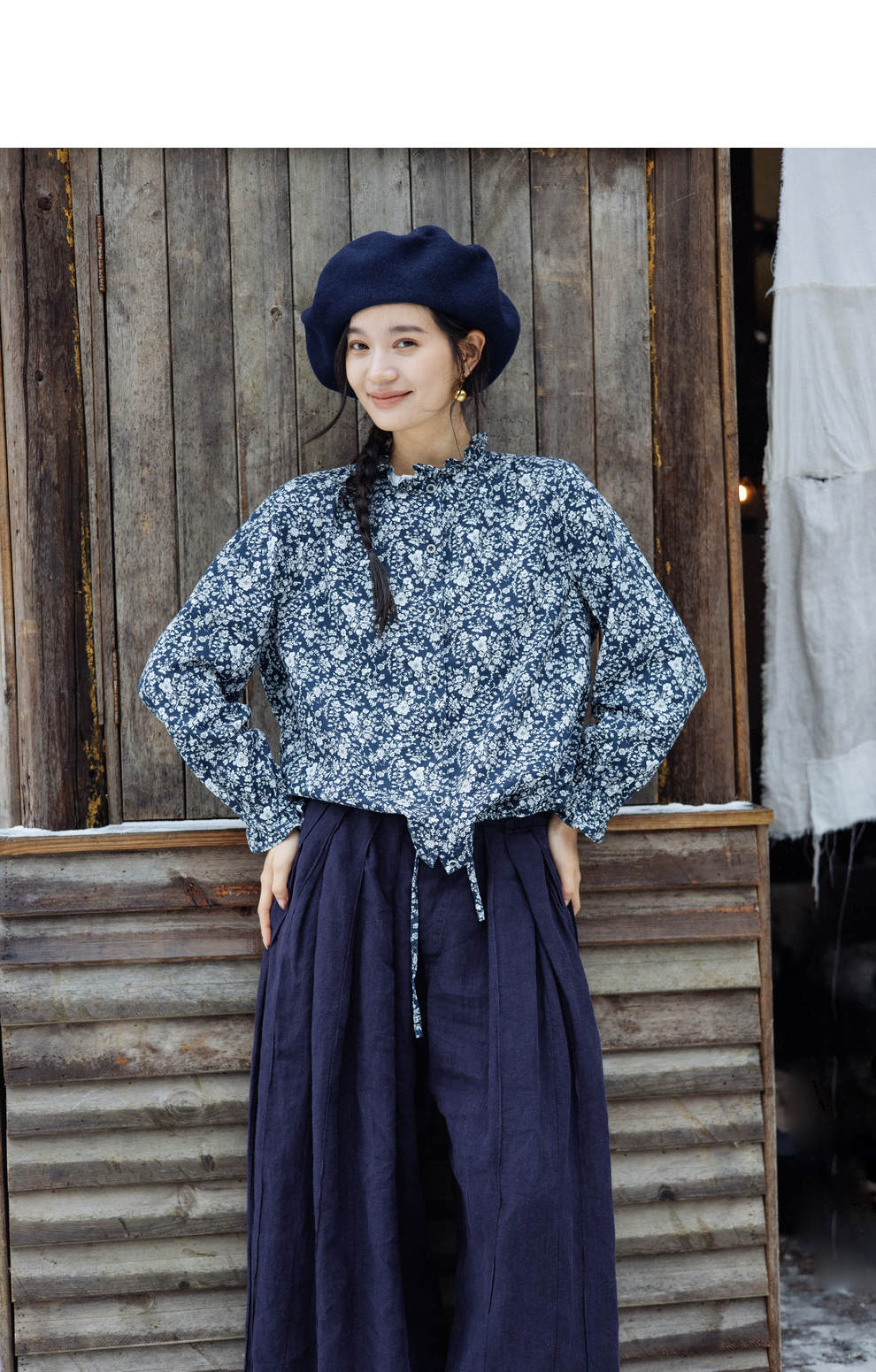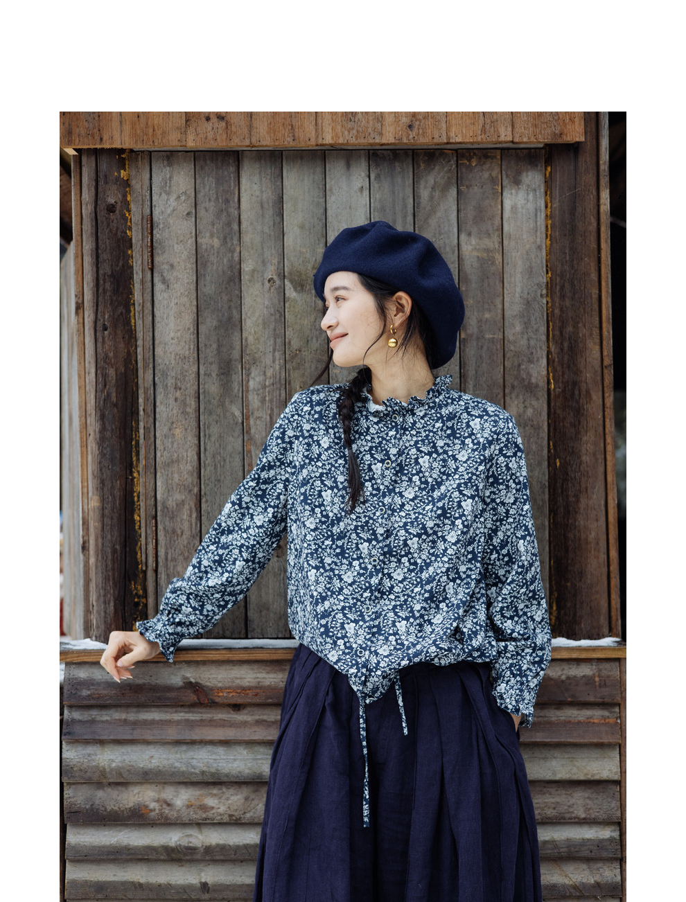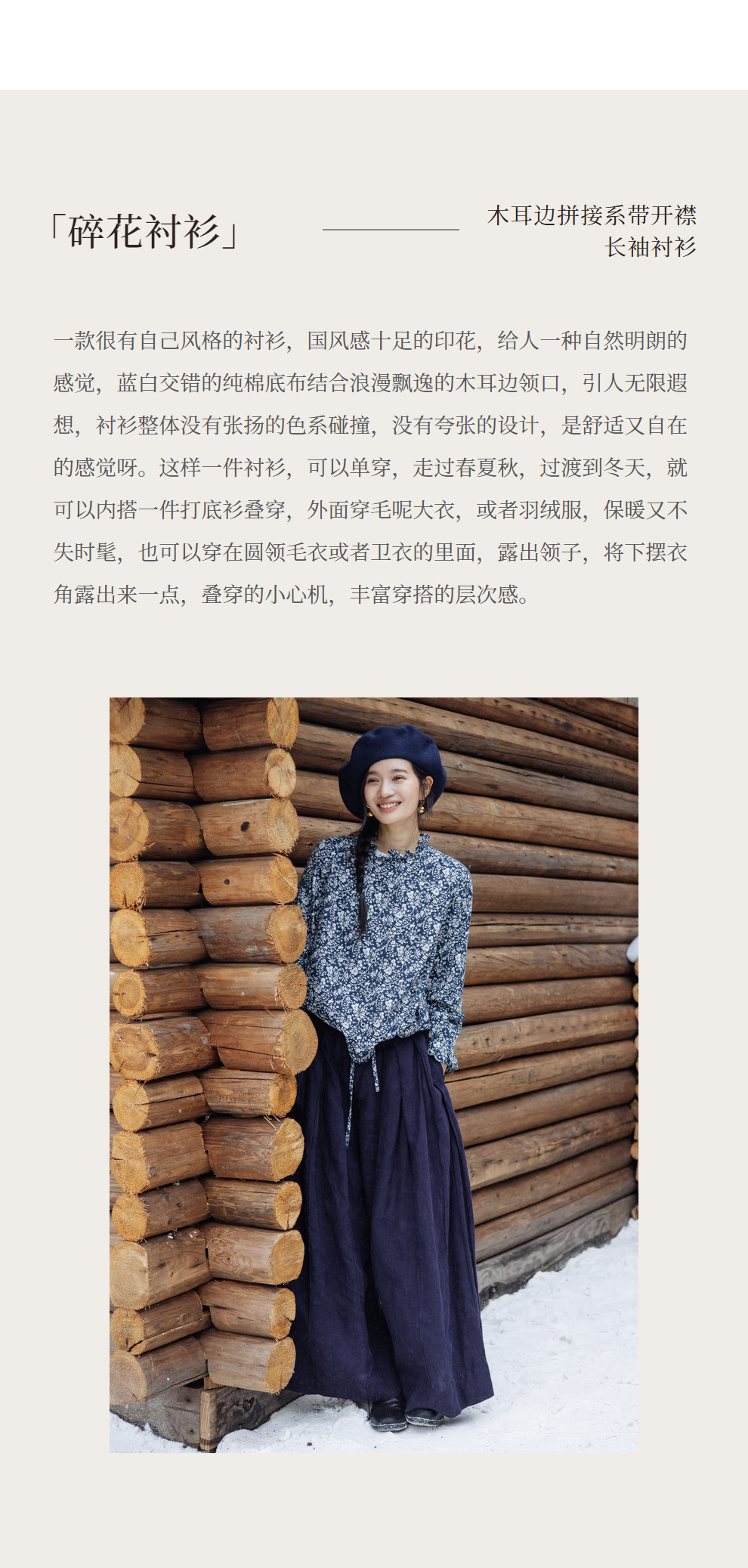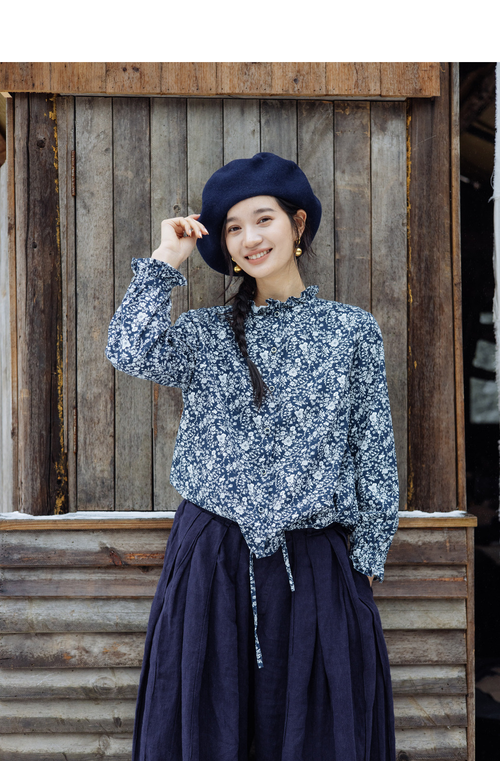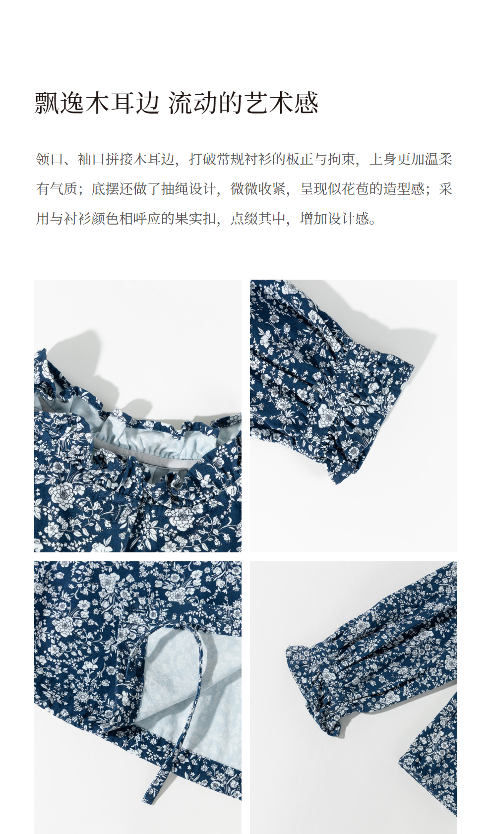 绽放735朵/碎花木耳边拼接国风感印花叠穿系带开襟文艺长袖衬衫