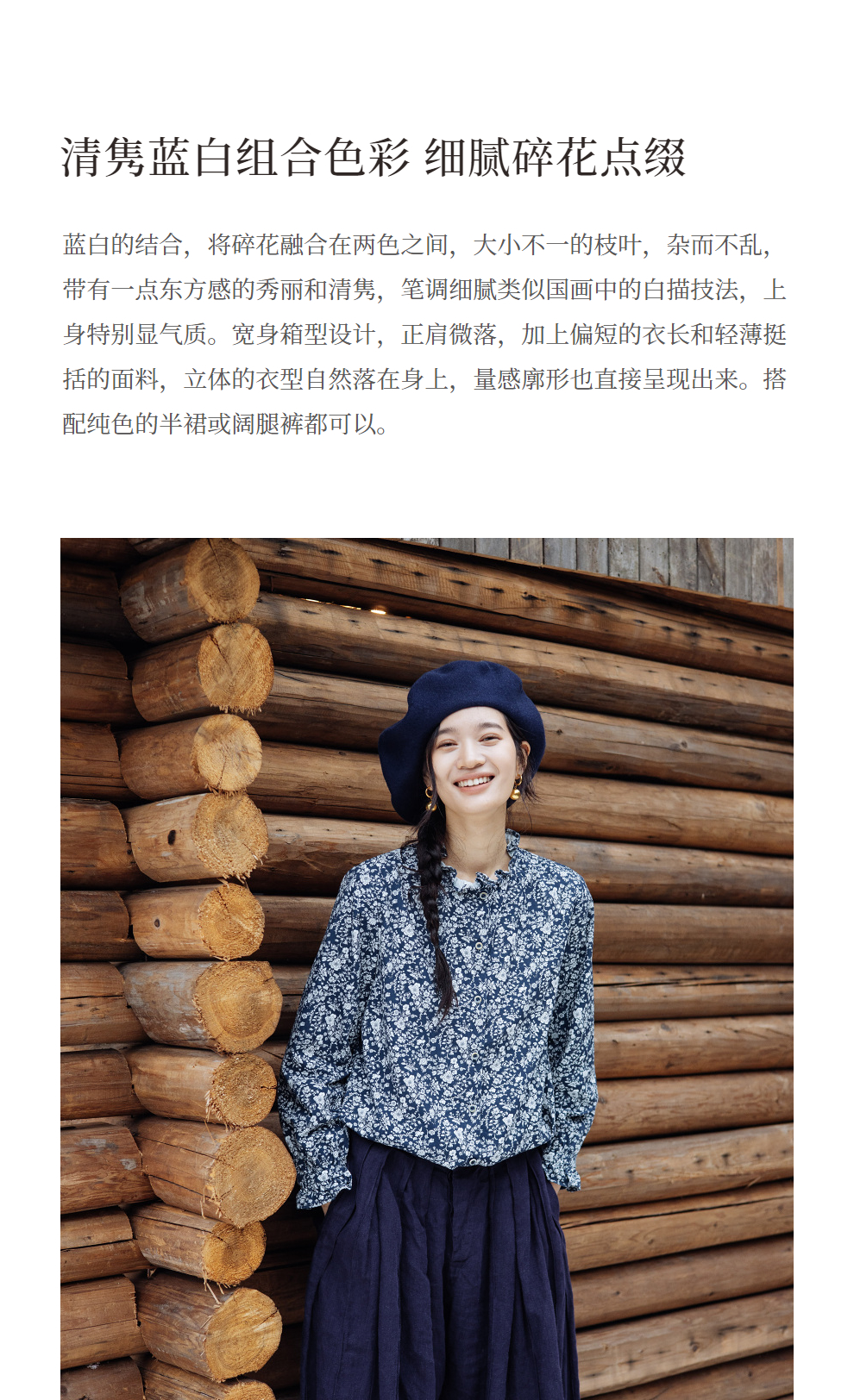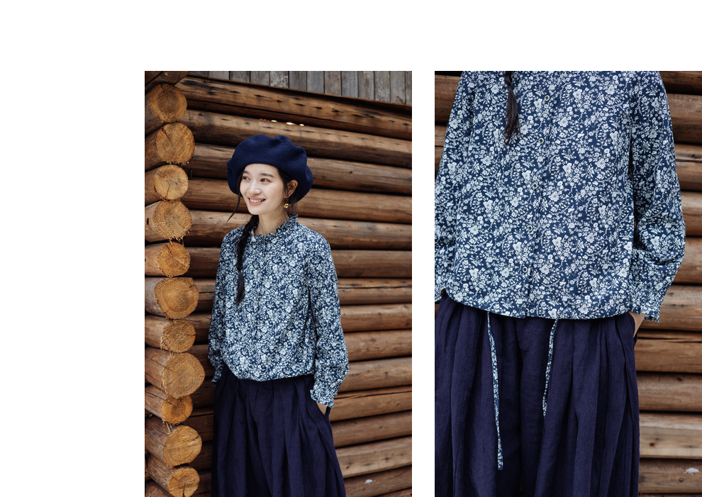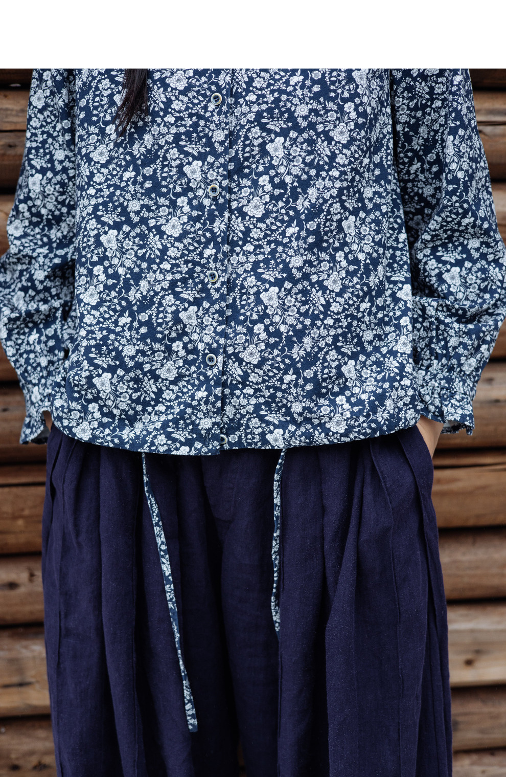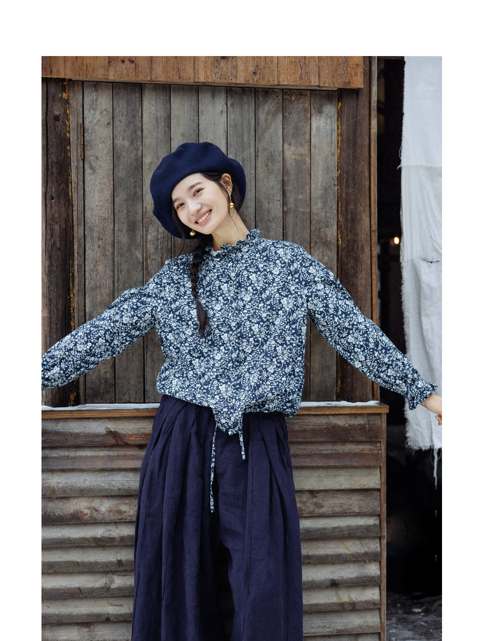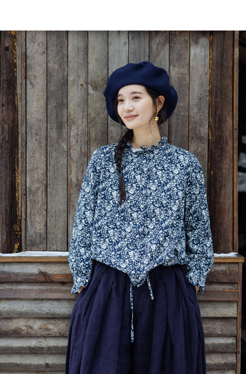绽放735朵/碎花木耳边拼接国风感印花叠穿系带开襟文艺长袖衬衫