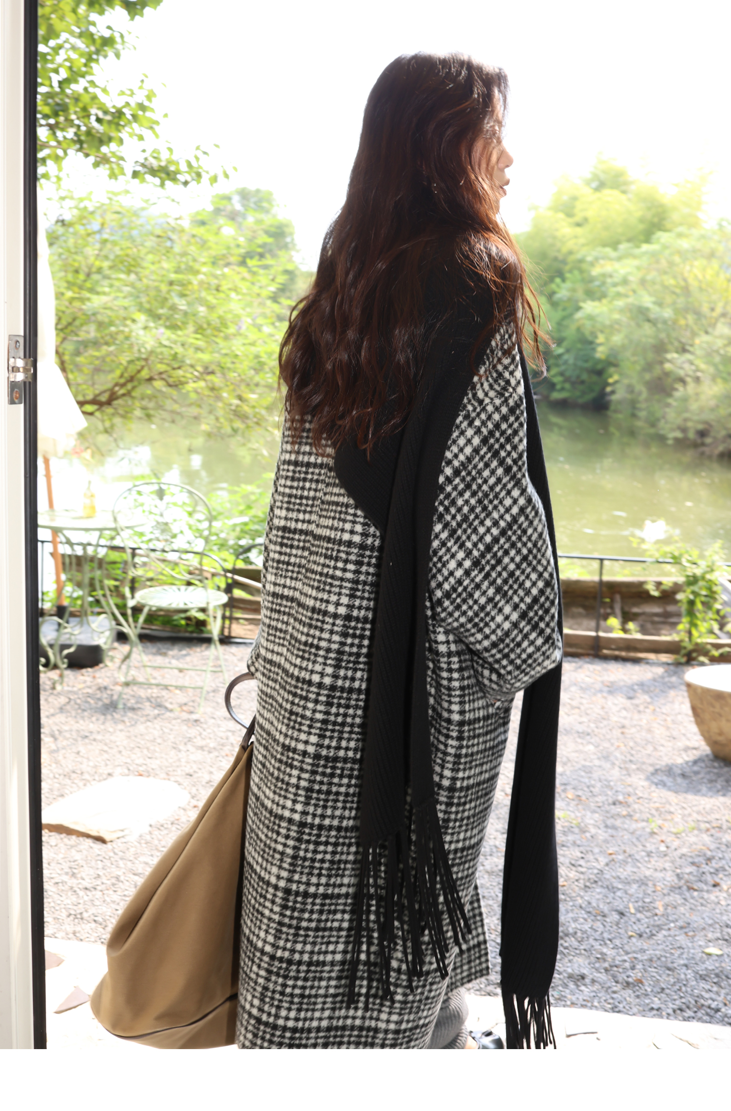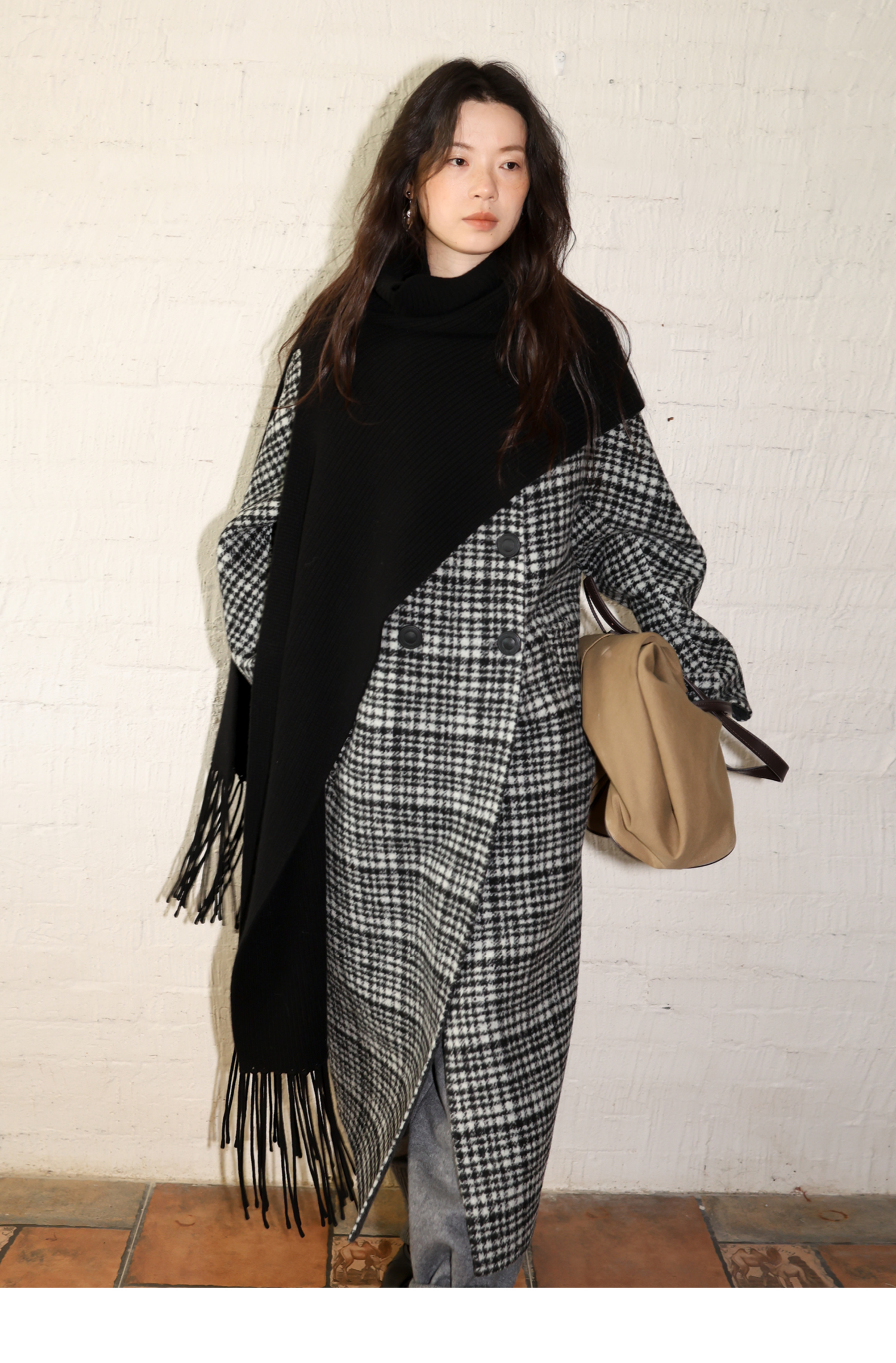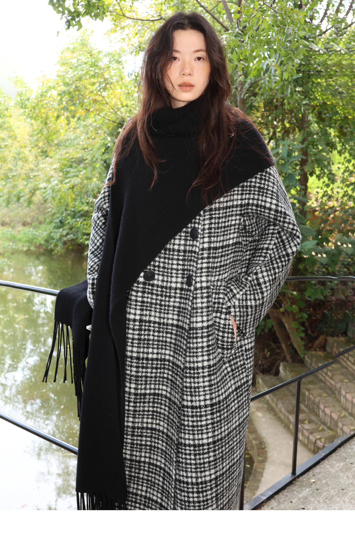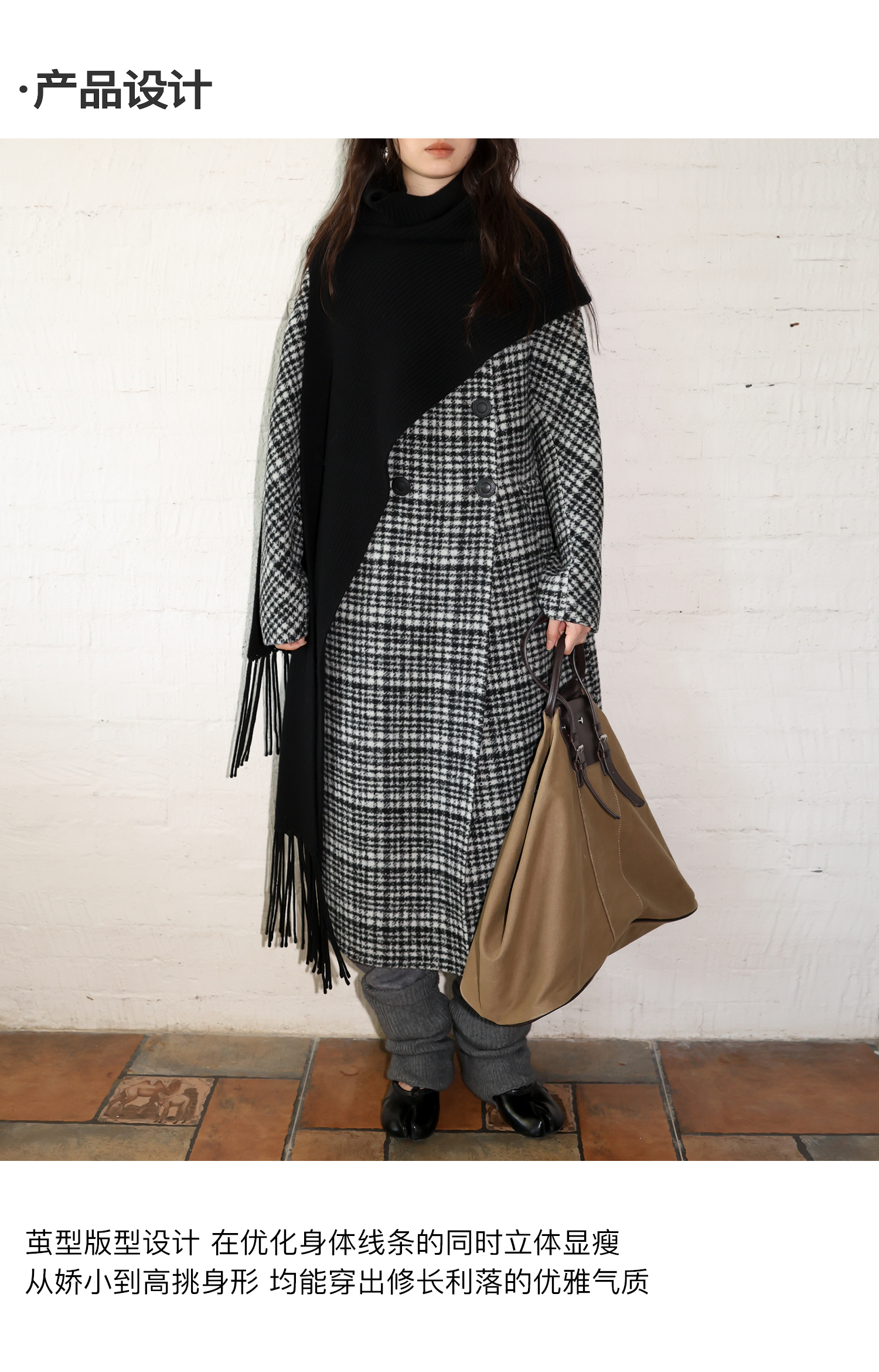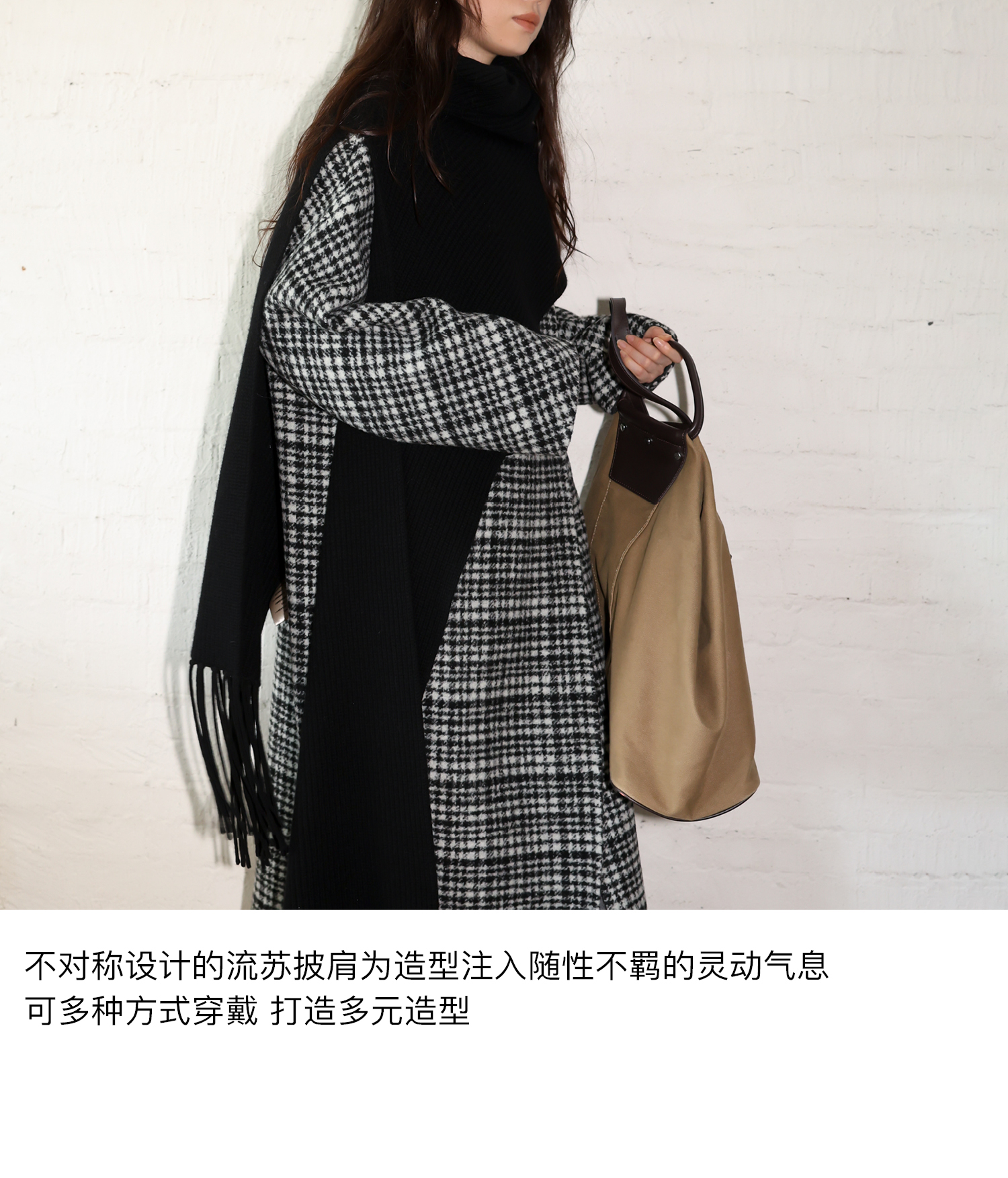 素舶 绵羊毛格纹圆领茧型流苏针织围巾长款双面呢大衣